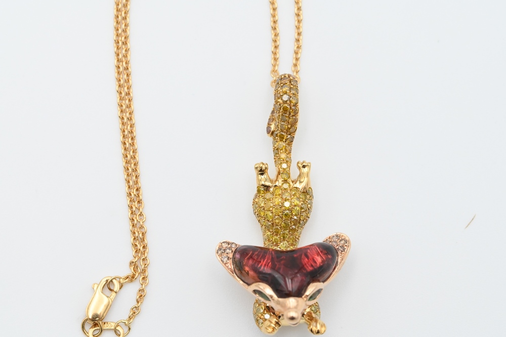 Lot 162: 18 Karat Yellow Gold Fox Pendant, set with large amber stone and diamonds on a 18 karat gold chain, 15 grams total weight.