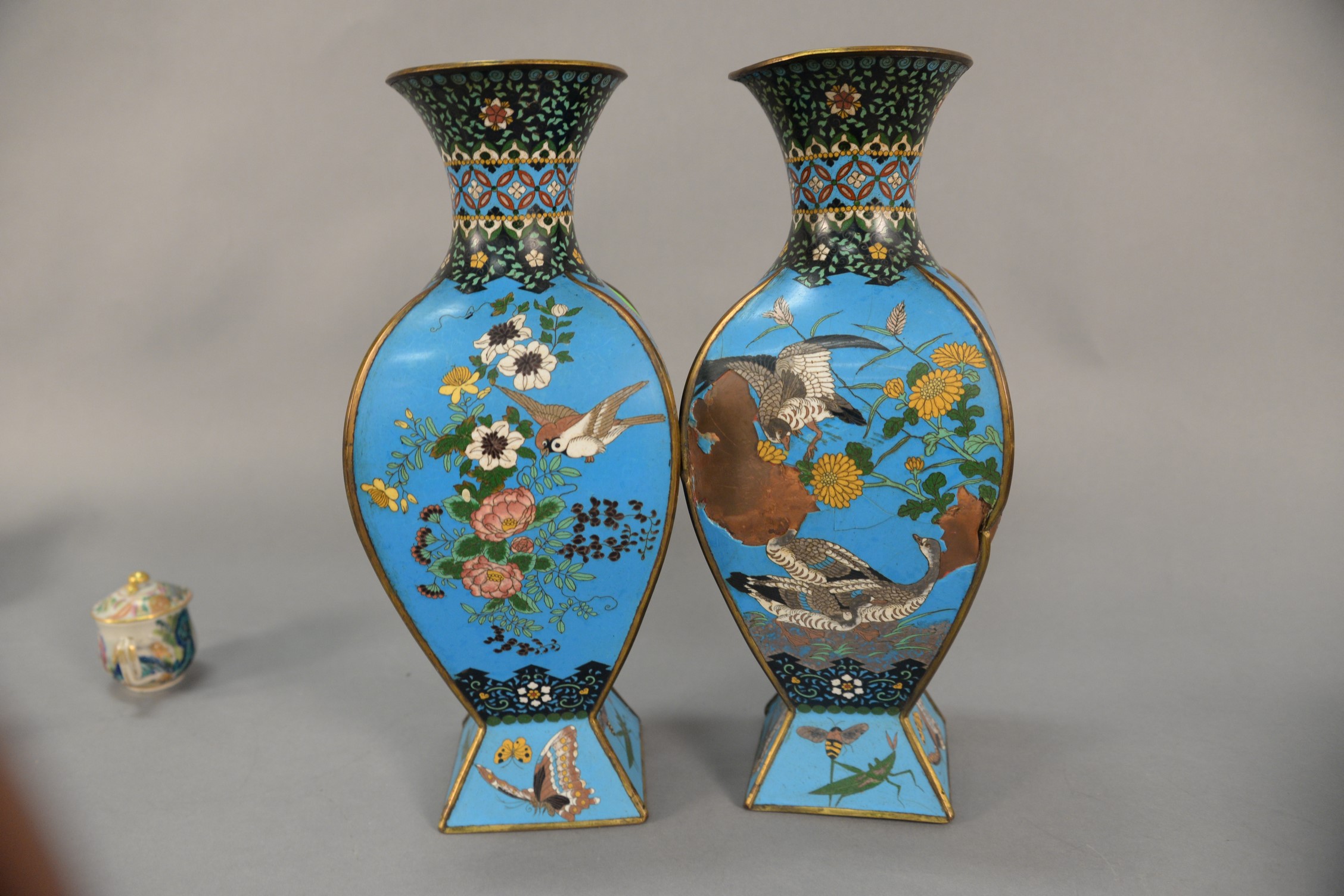 Lot 162: 19th century pair of Oriental blue cloisonne square vases having blossoming flowers and bird design above insects around base, all u…