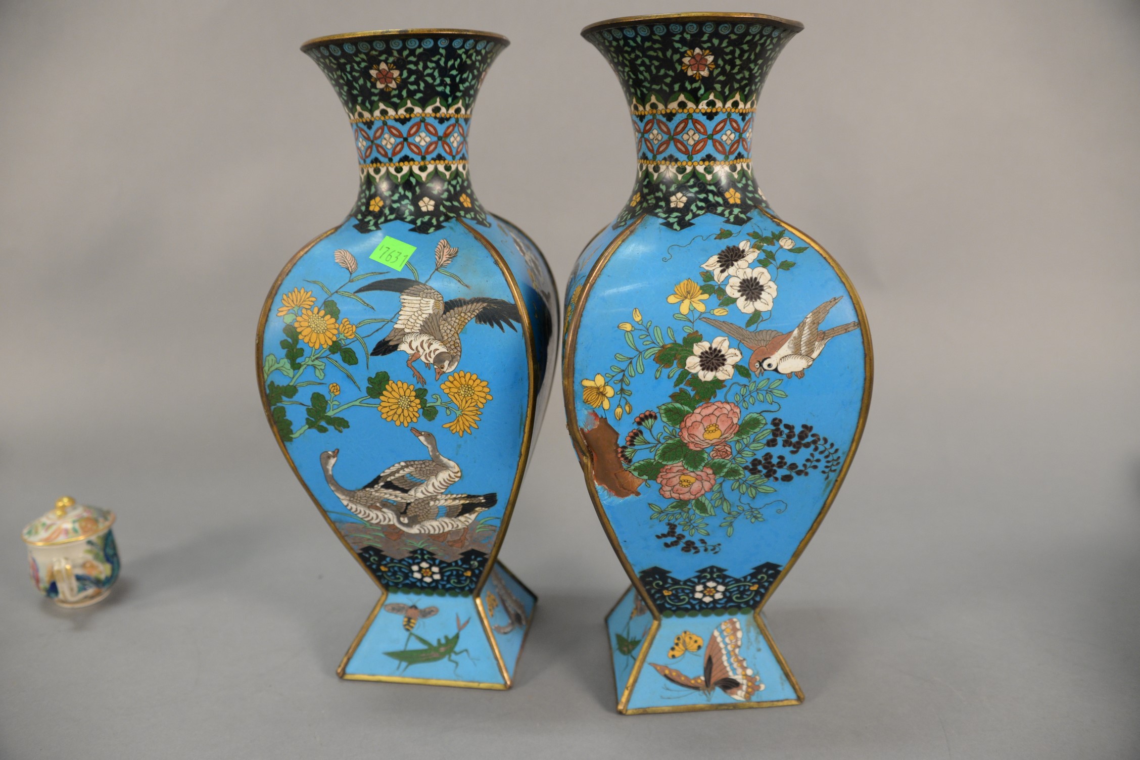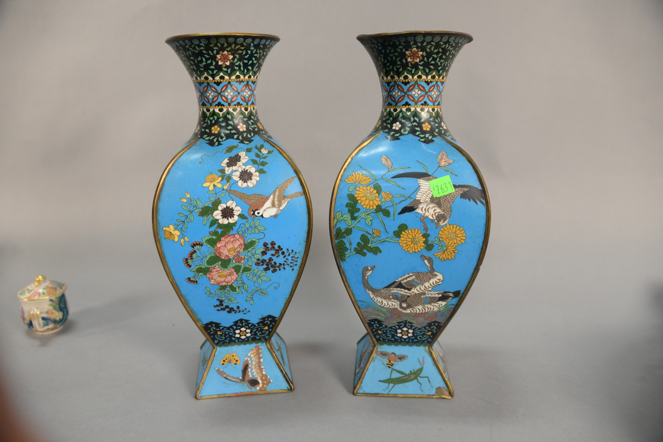 19th century pair of Oriental blue cloisonne square vases having blossoming flowers and bird design above insects around base, all under rounded flare rim top one as is. ht. 14 3/4 in.