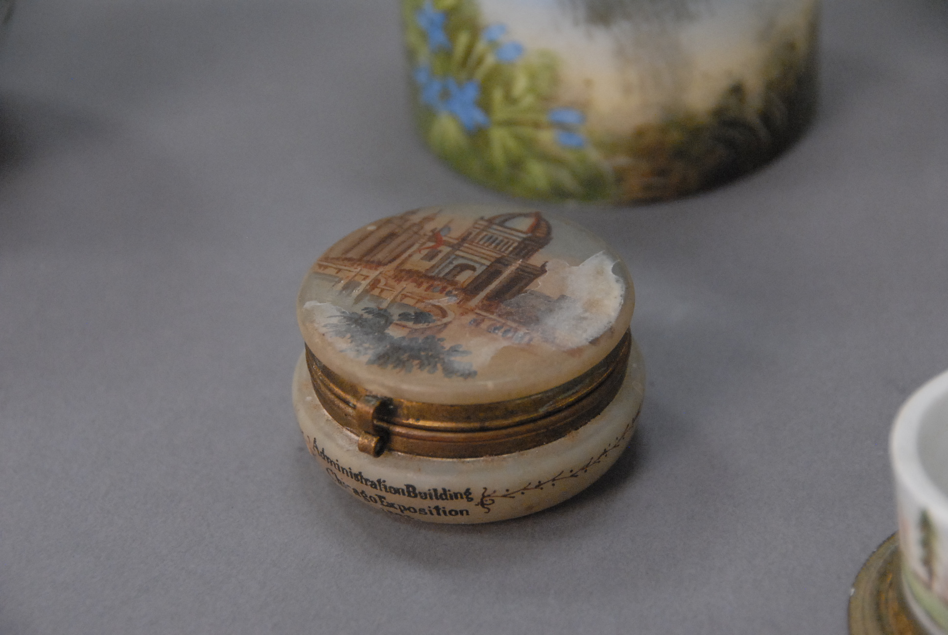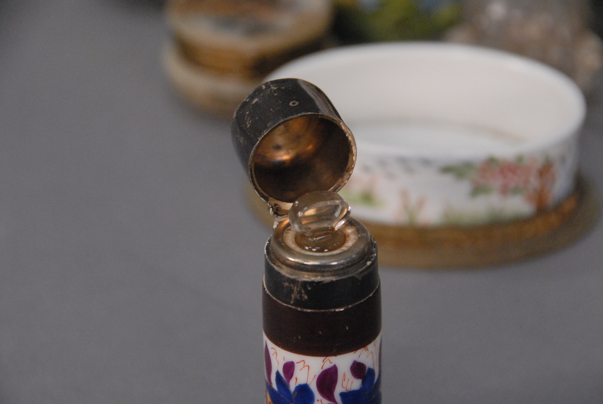 Lot 162: Box lot of porcelain, boxes, vases, perfumes, and a glass Bonzo inkwell.