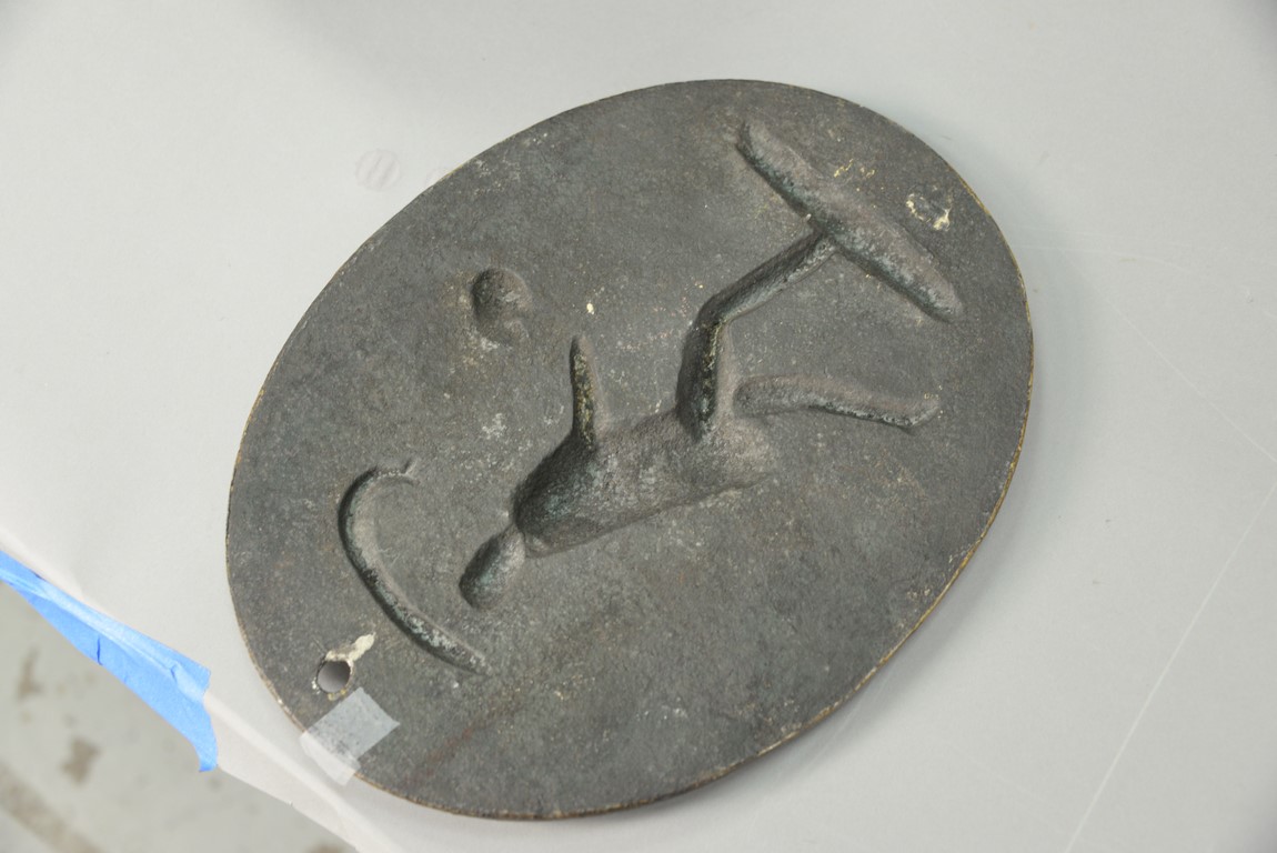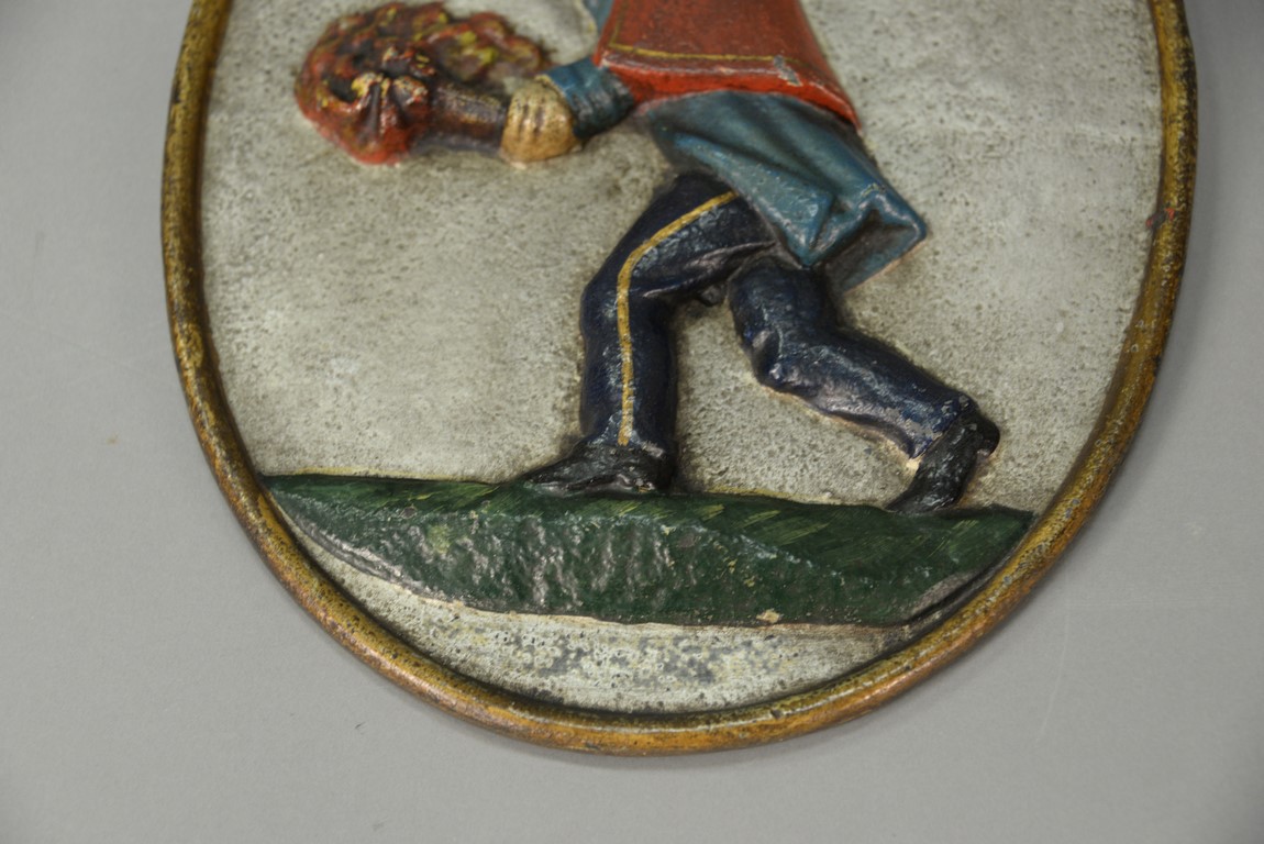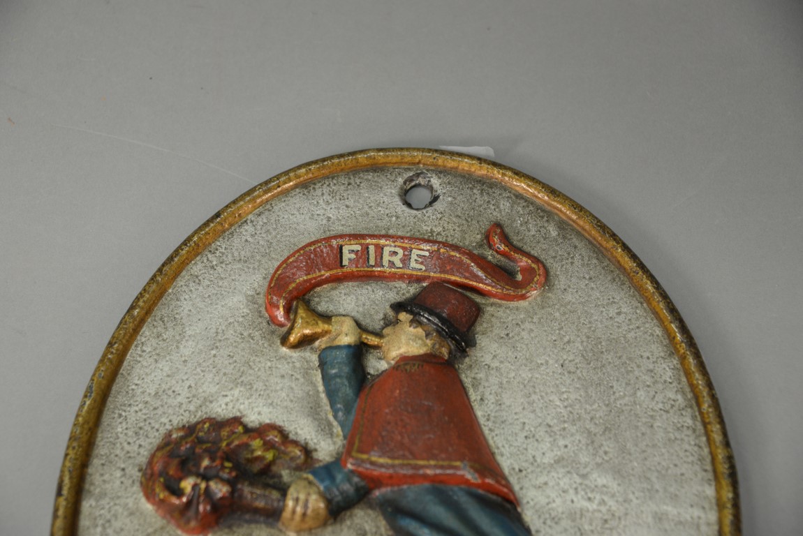 Lot 162: Cast iron fire mark, oval form with figure of a fireman blowing a horn and holding a burning torch. 12 1/4 x 9 1/2