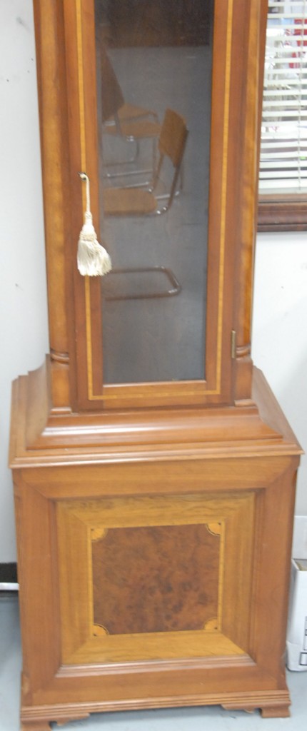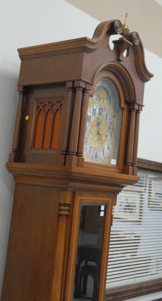 Cherry tall case clock with broken arch top, brass dial with moon phases, nine tubes, having an inlaid case all set on bracket feet, made by Carl Niederfriniger #26, dial marked Herschede. height 8ft. 5in.