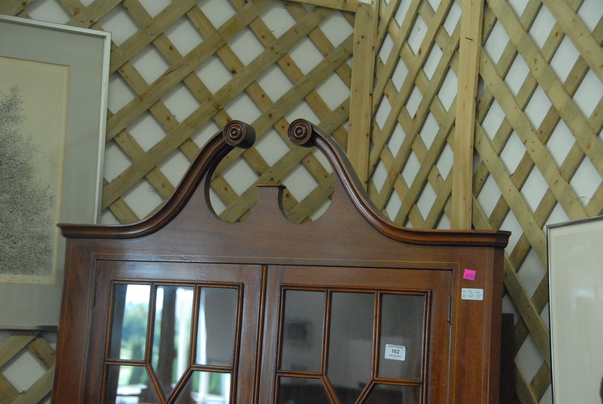 Lot 162: Custom mahogany corner china cabinet with broken arch top and line and fan inlays, ht. 80, dp. 24, wd. 37.
