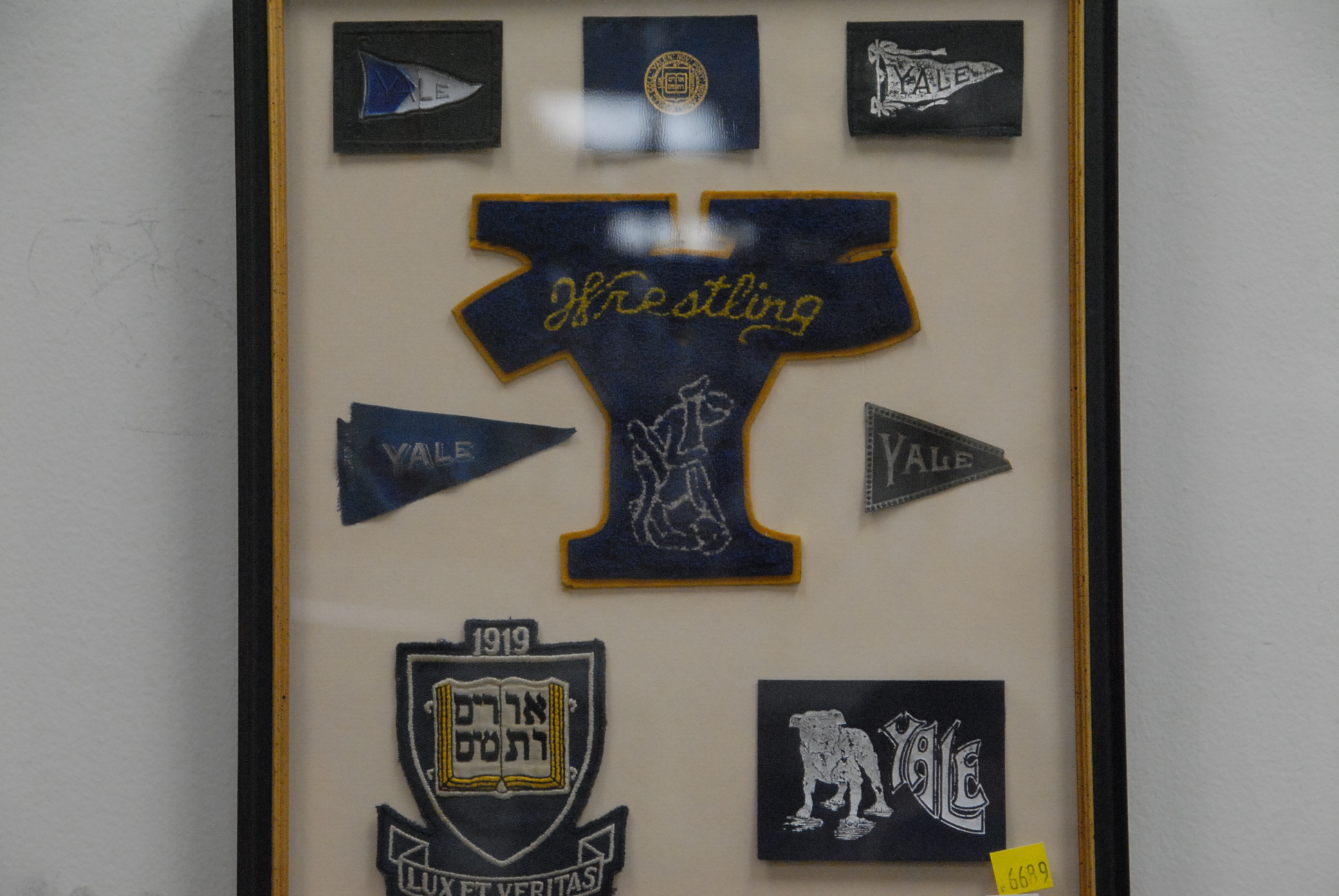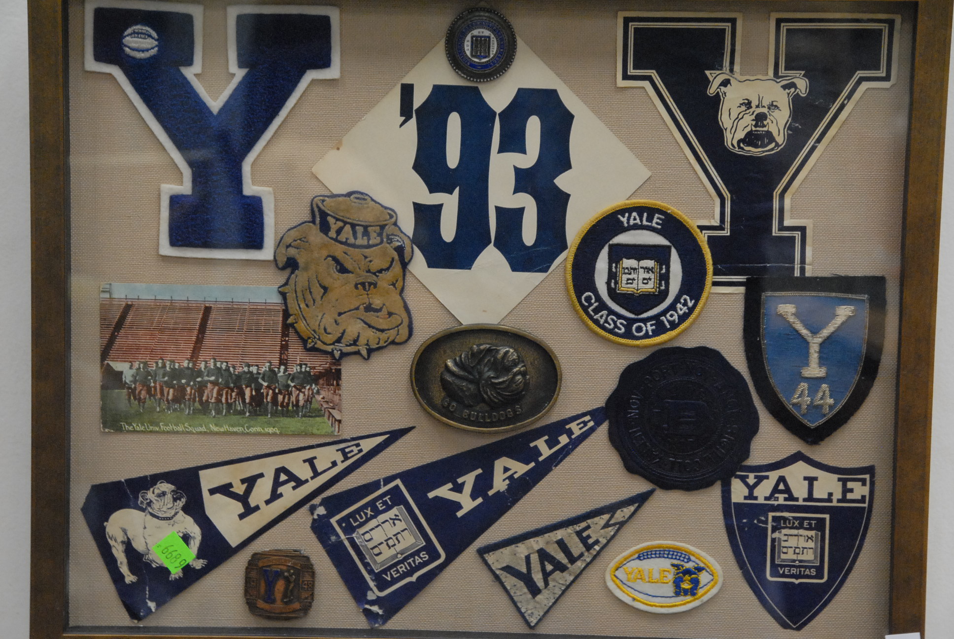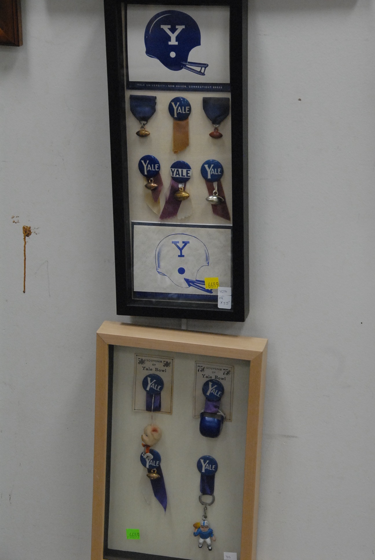 Lot 162: Five piece framed lot football pins, postcards, pennants, pin backs, lapel pins, invitations, ribbons, belt buckles, luggage tags, …