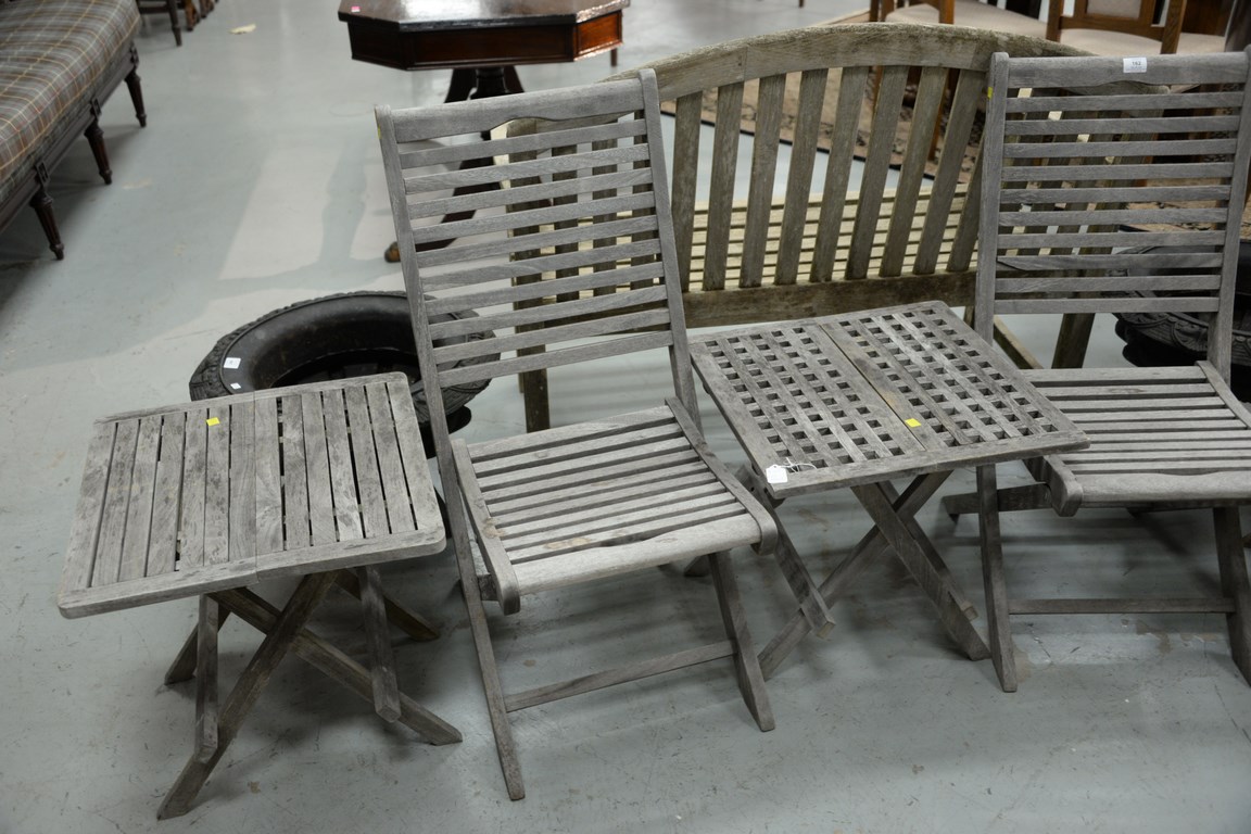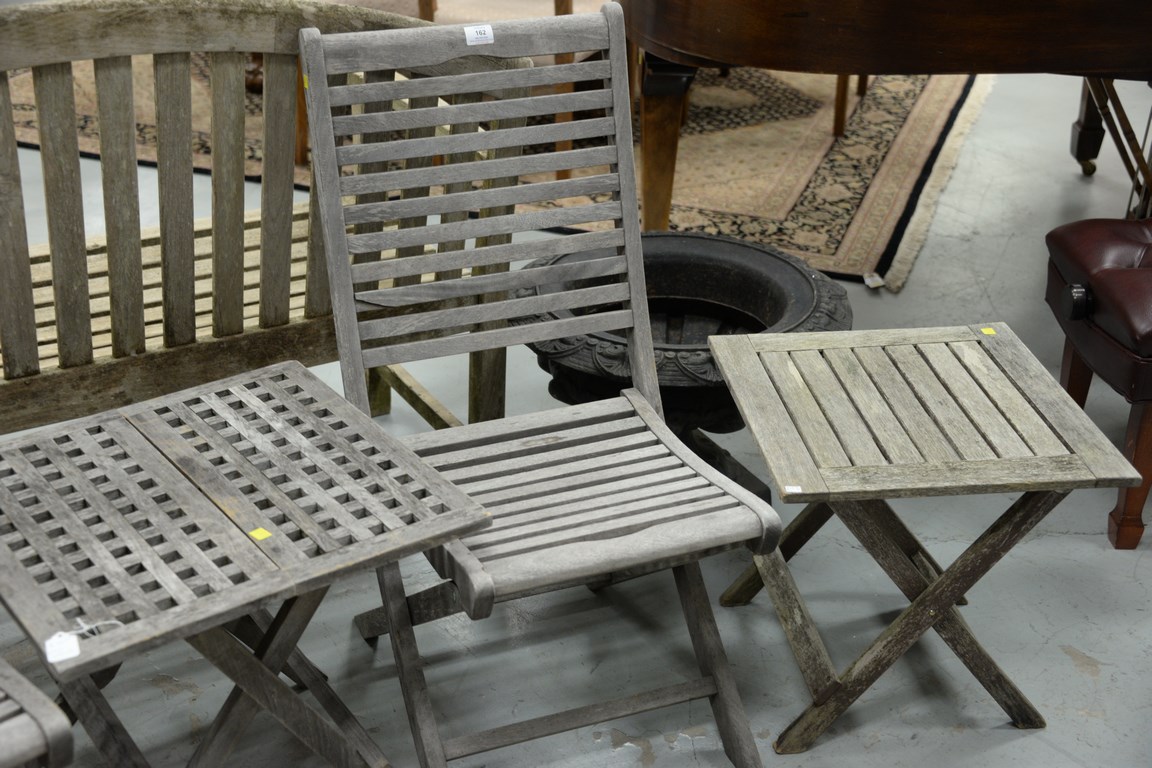 Five piece teak lot including two folding chairs and three folding tables.