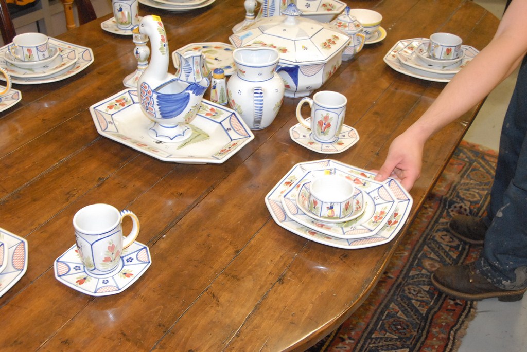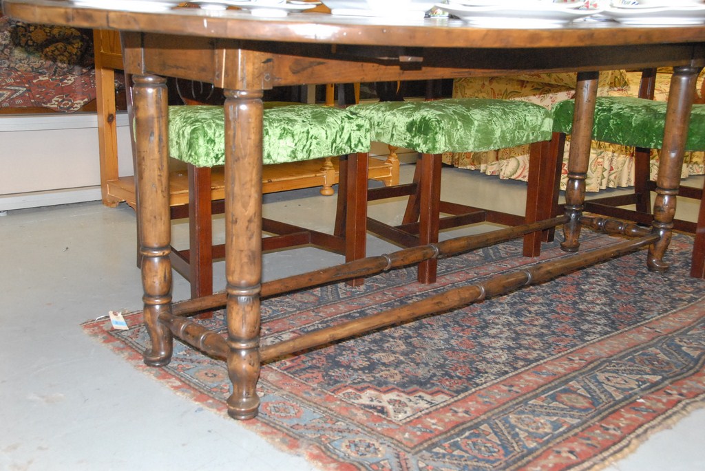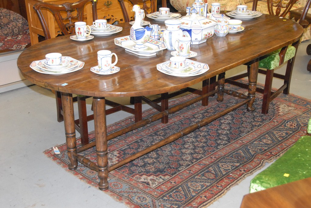 Long Continental style drop leaf table, ht. 29in. lg. 84in. Provenance: Estate of Judy Gengras McDonough of West Hartford, CT.