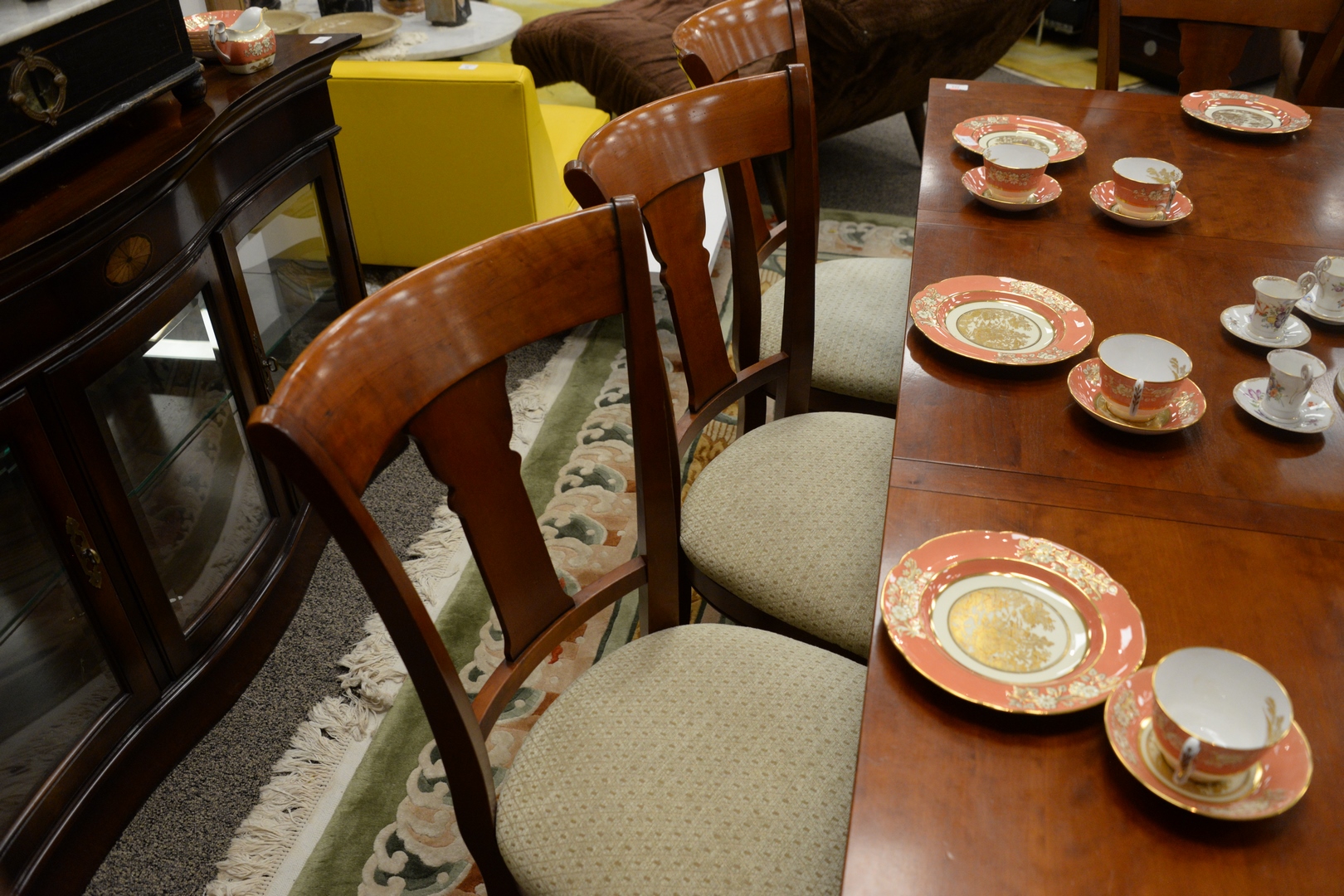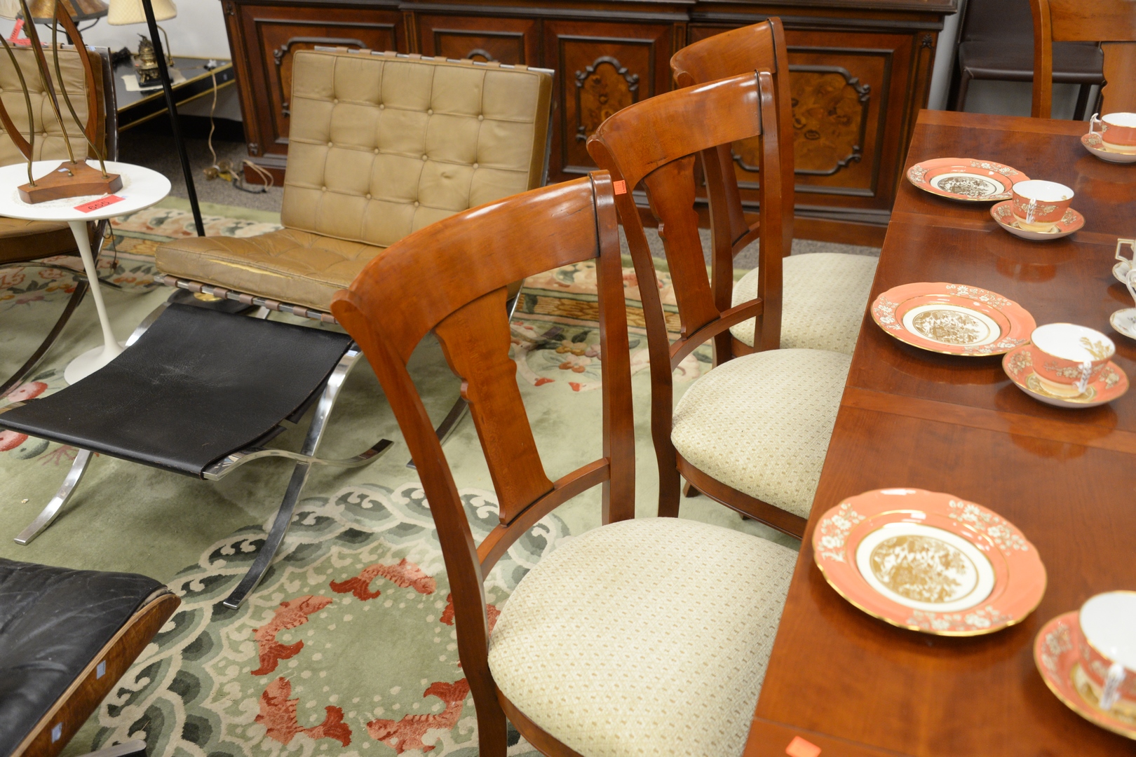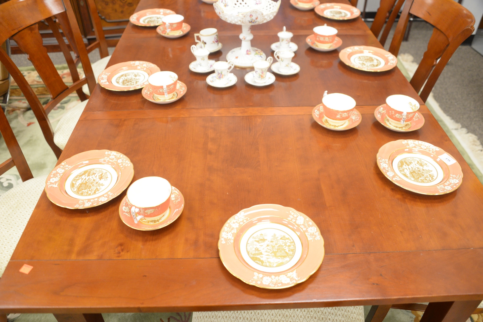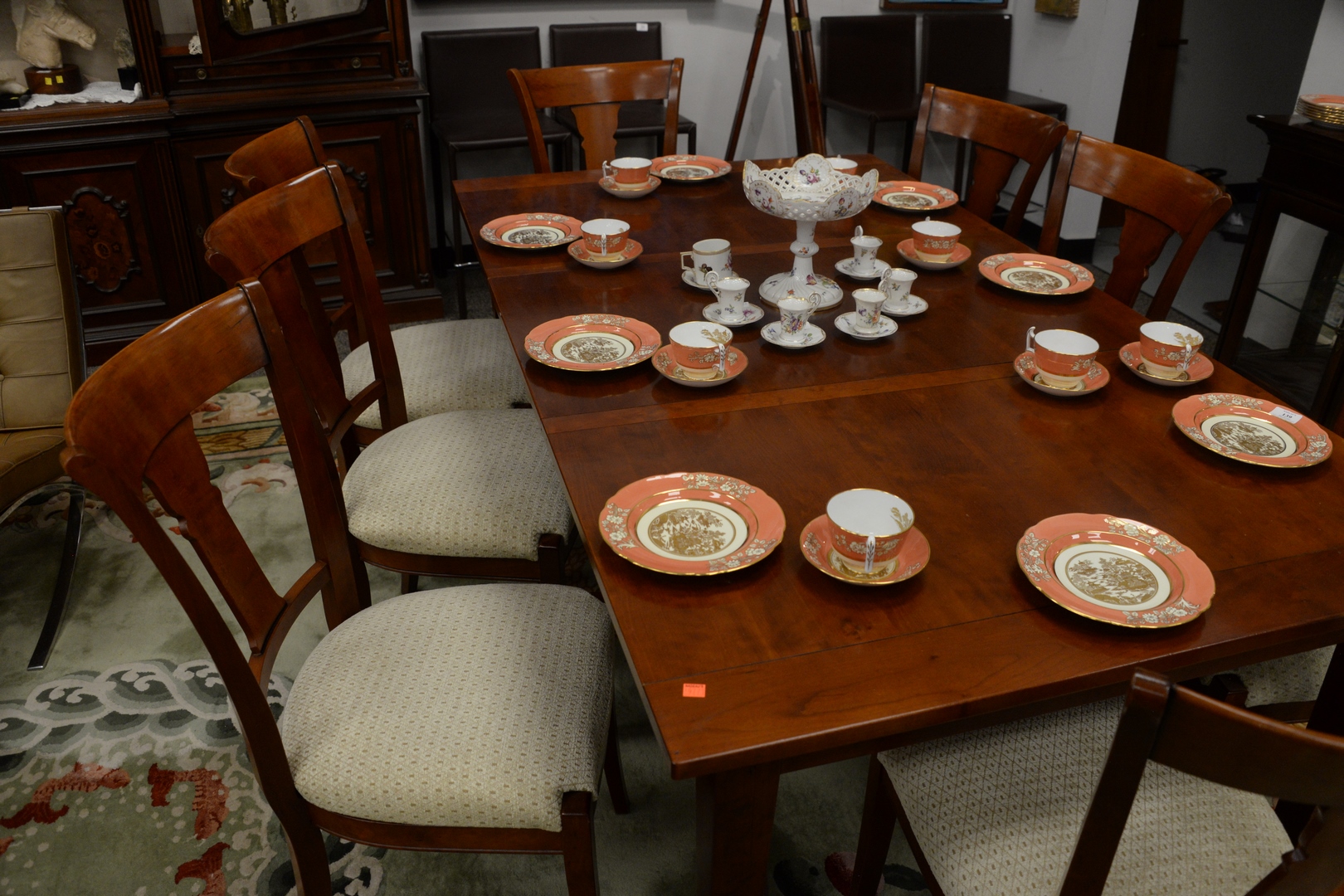 Nine Piece Grange Cherry Table and Eight Chairs, table with 18 inch end extensions, height 30 inches, open 41″ x 109″, top 41″ x 73″.