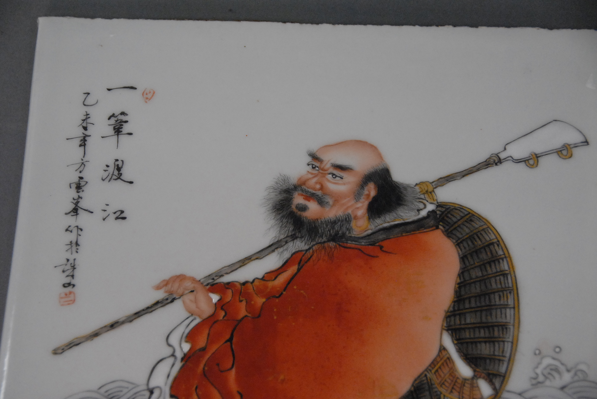 Lot 162: Oriental painting on porcelain plaque of warrior figure standing on rolling and crashing waves, ht. 14 1/2in. wd. 10in.