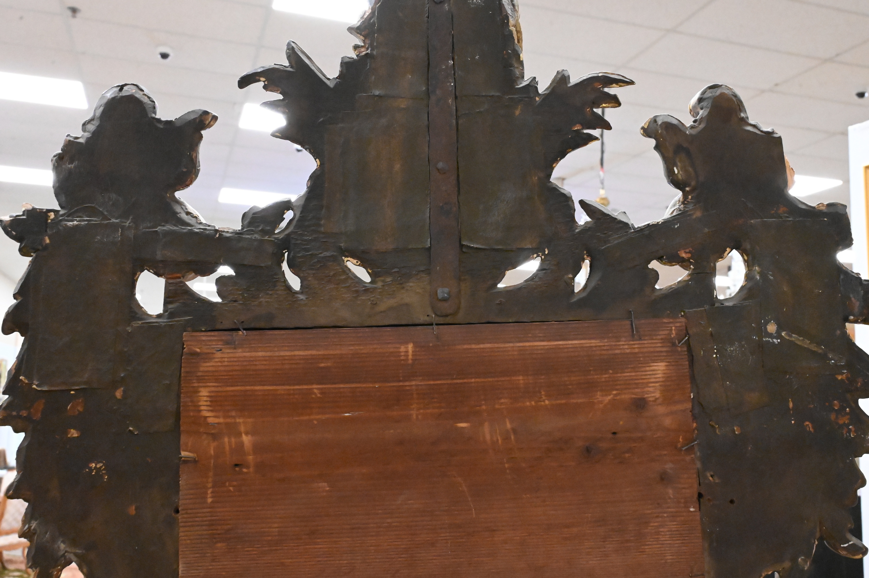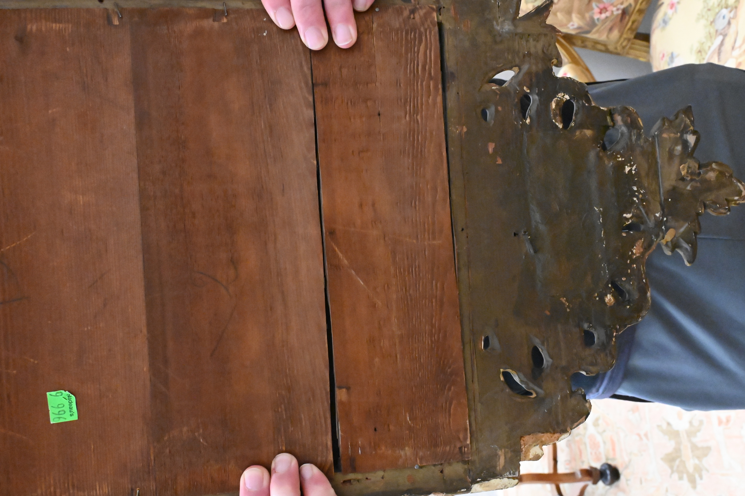 having carved frame with foliate, floral, and basket-weave motifs, surmounted by a flame crest, original panel back