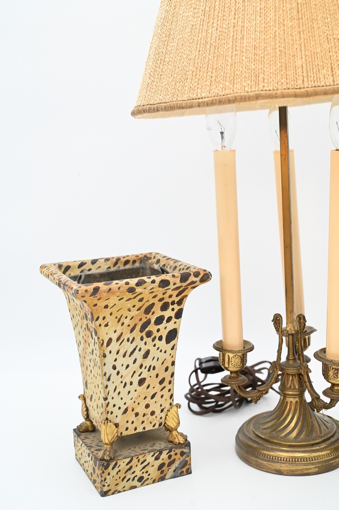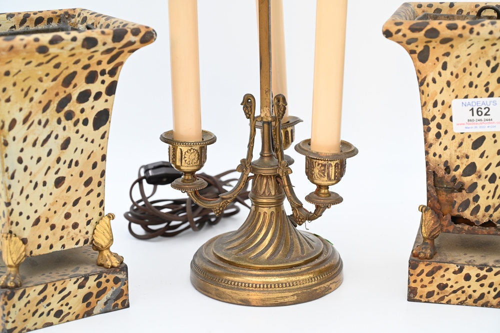 Pair of Painted Tole Cache Pots/Square Planters, with liners on paw feet, height 8 1/2 inches; along with a bouillotte table lamp.