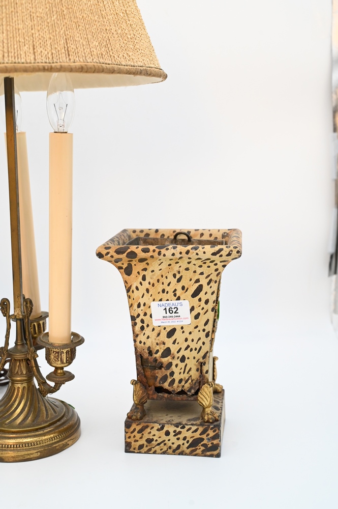 Lot 162: Pair of Painted Tole Cache Pots/Square Planters, with liners on paw feet, height 8 1/2 inches; along with a bouillotte table lamp.