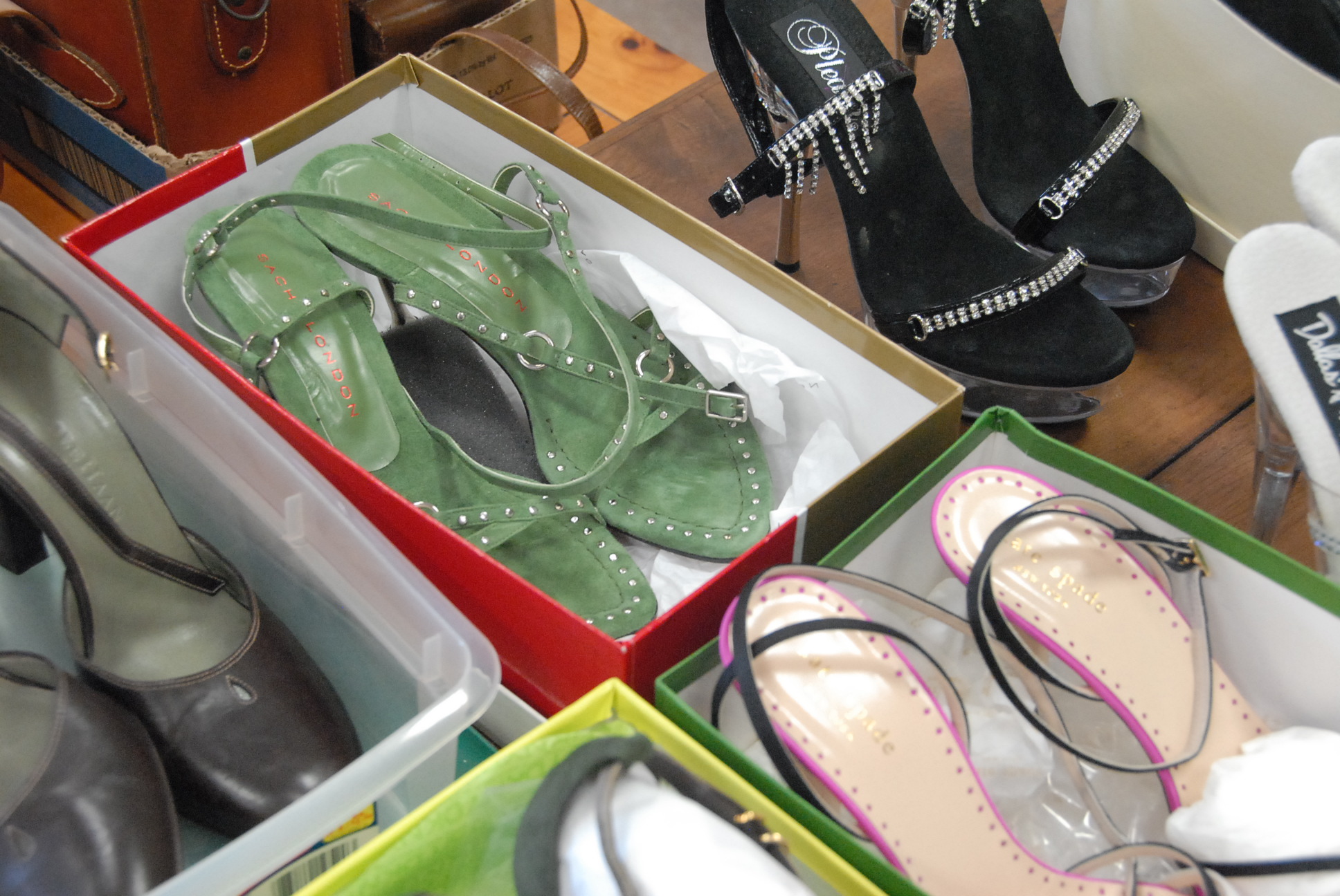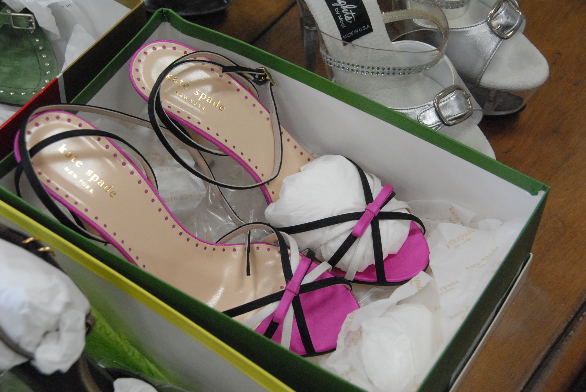 Seven pairs of shoes including Kate Spade, Robert Clergeri, DKNY, Cole Haan, Sach London, and two with lucite bases.