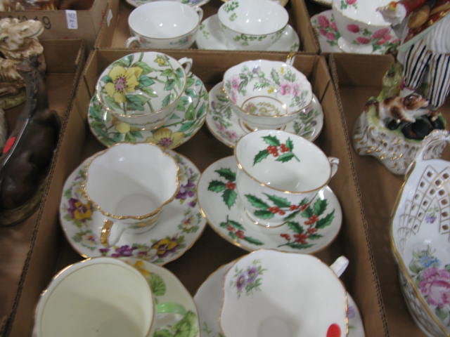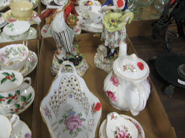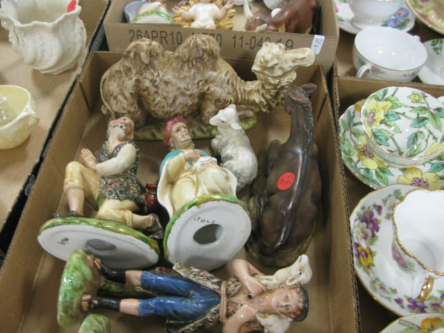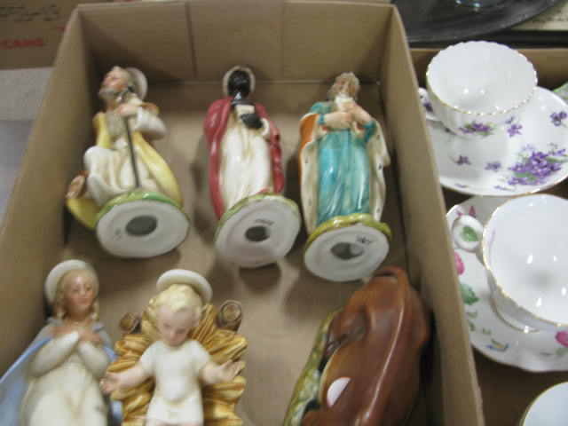 Six boxes to include a pair of porcelain figures, teapot, approx. eighteen cups and saucers, nativity set, etc