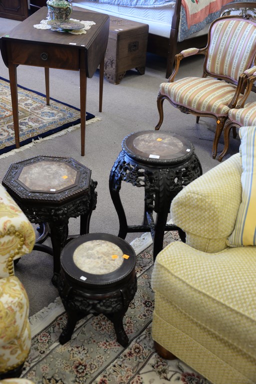 Three Chinese stands with inset marble. ht. 13 1/2in., 18 1/2in., & 24in.