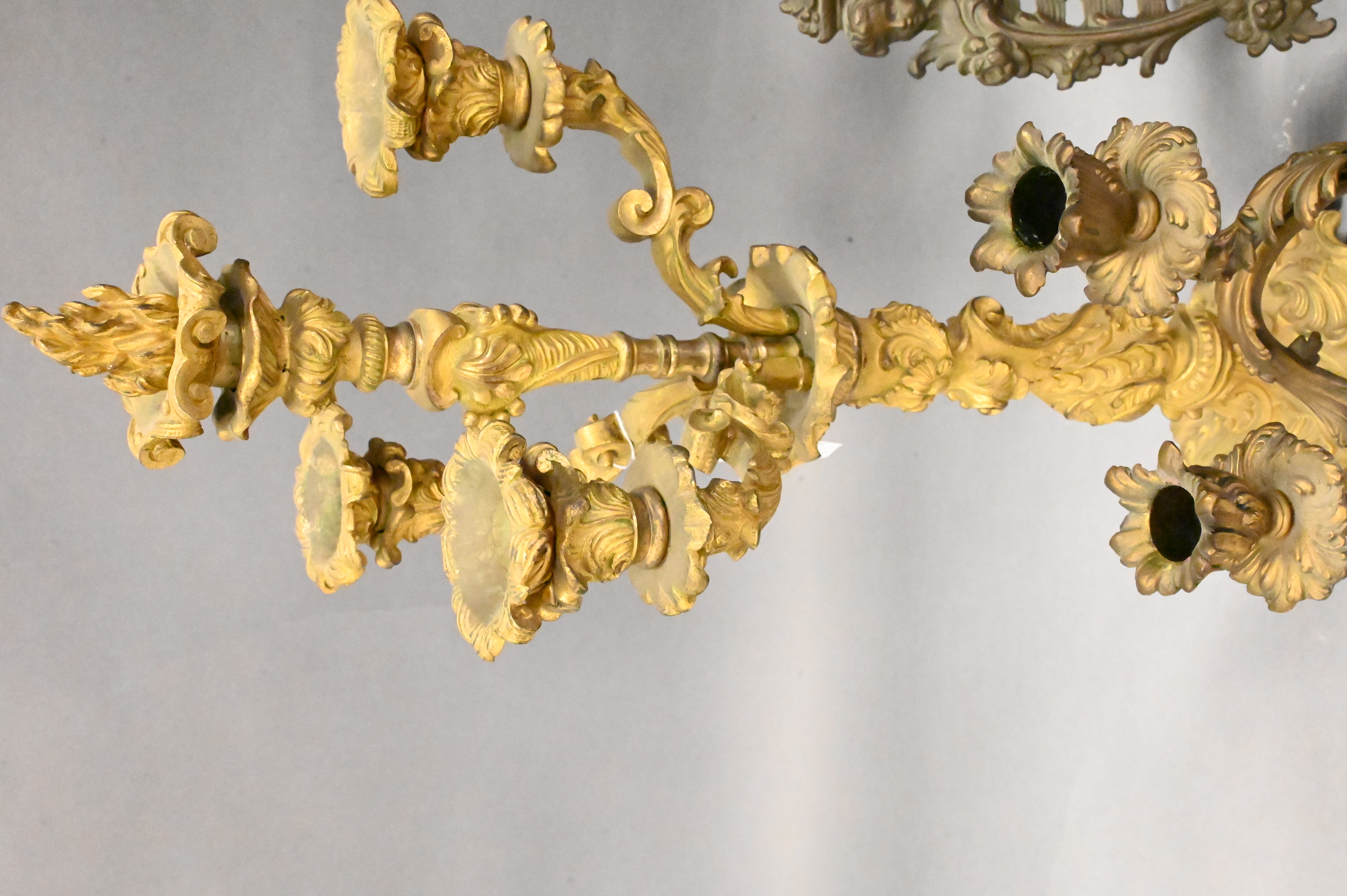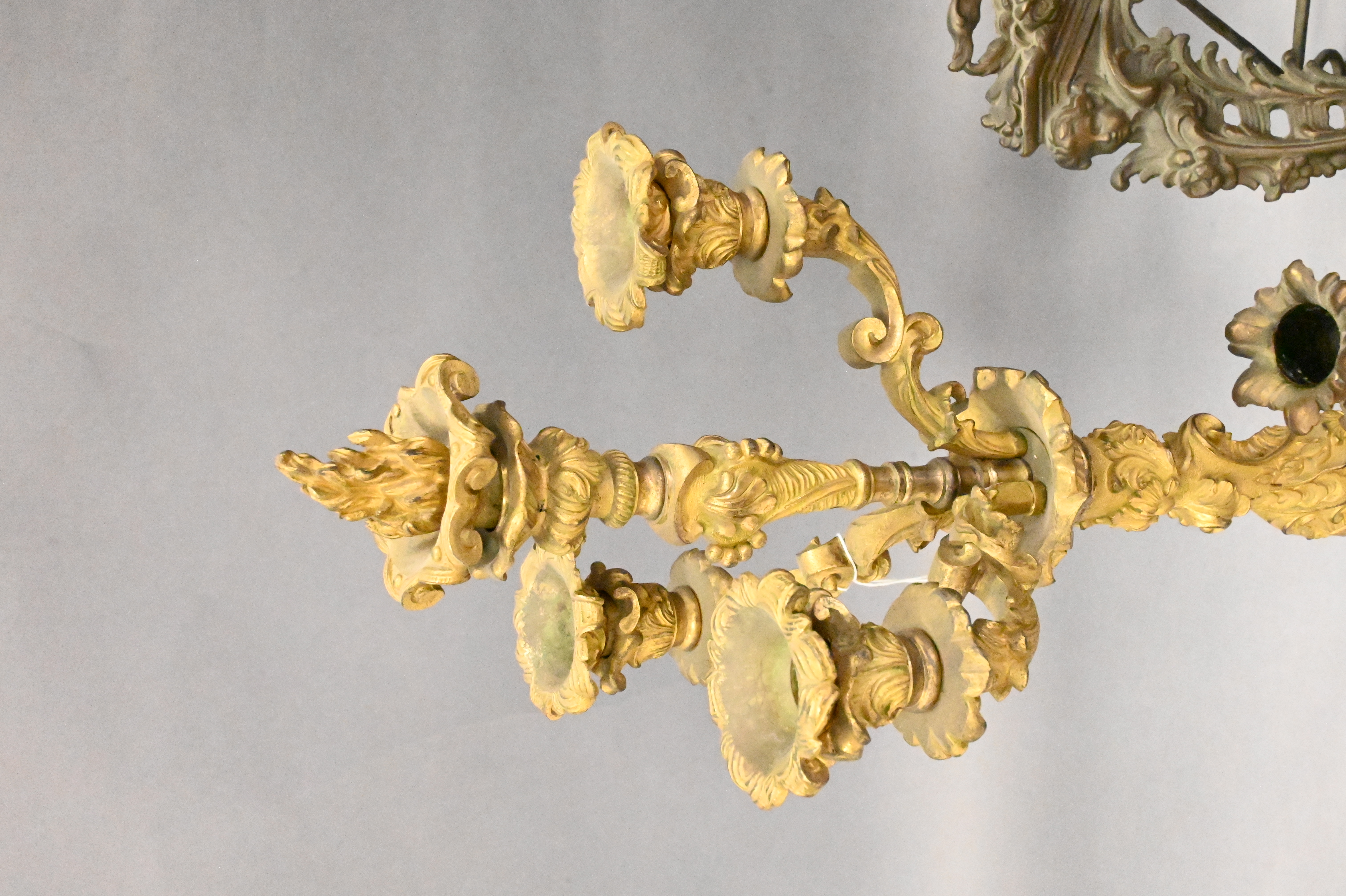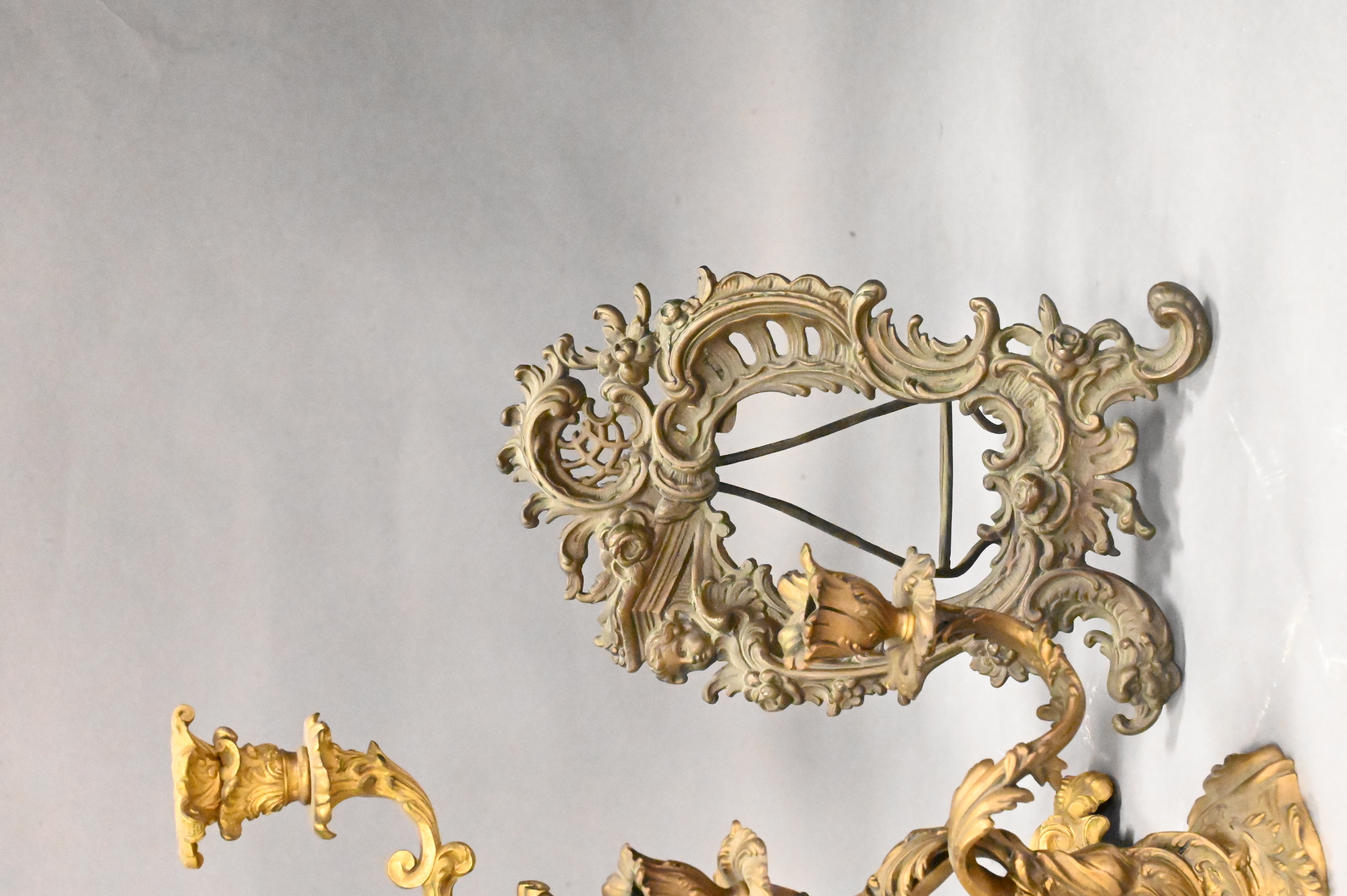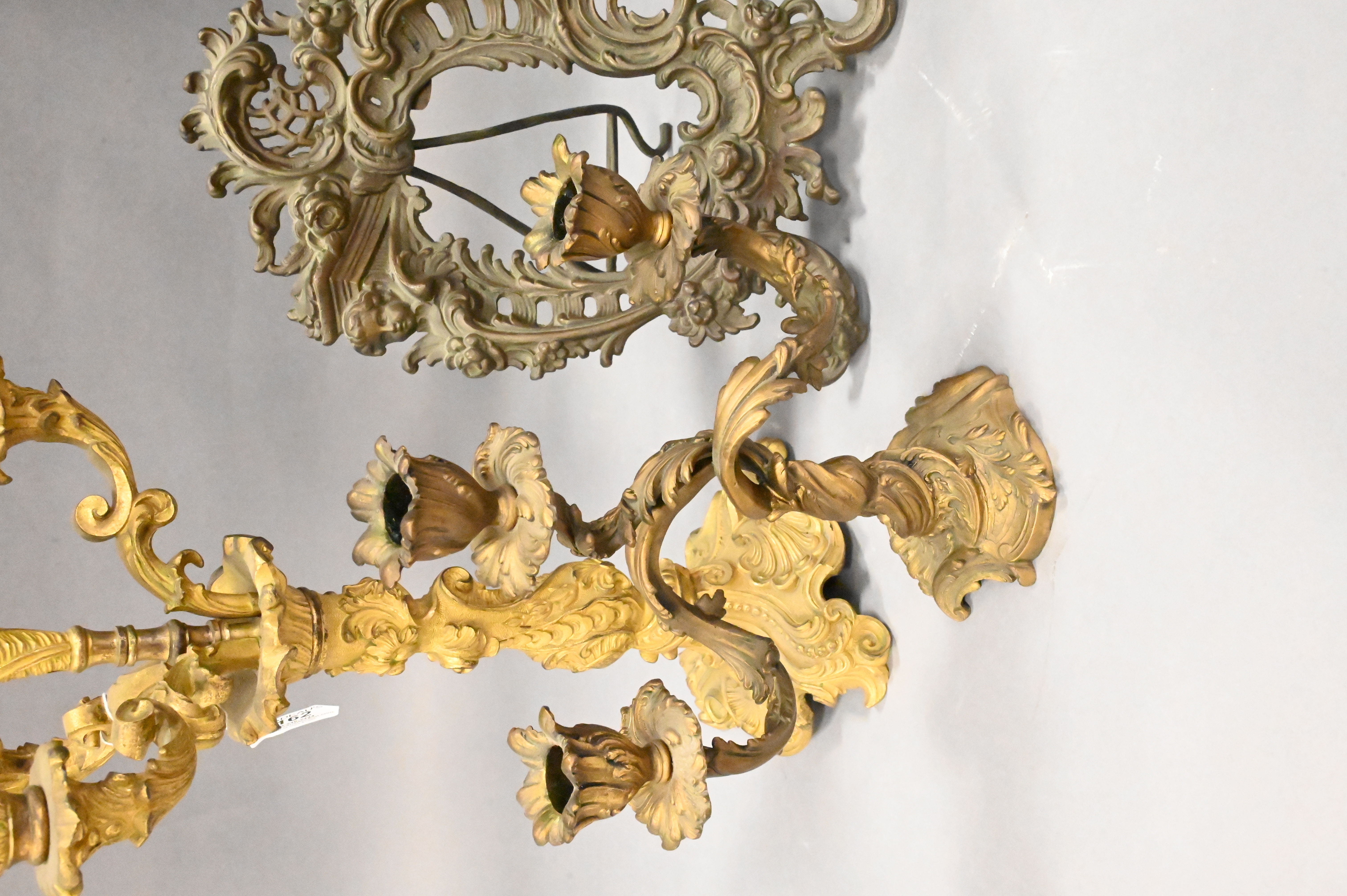 three armed gilt bronze candelabra having flame finial and acanthus leaf motif, small three armed candelabra, picture frame having cherub and floral design