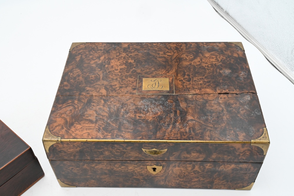 Two Hardwood Boxes, to include a rosewood inlaid jewelry box having fitted leather interior, 7 1/4 x 10 1/4 inches; along with a burl wood and brass bound box having fitted interior, 8 1/2 x 11 1/2 inches.