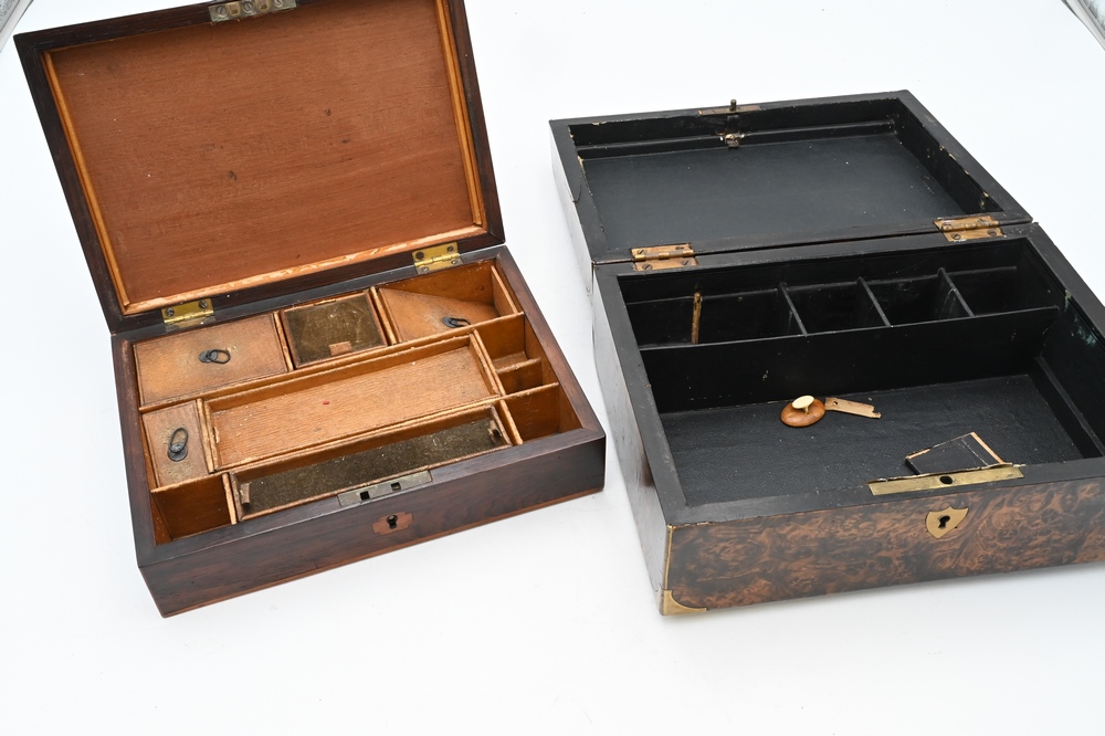 Lot 162: Two Hardwood Boxes, to include a rosewood inlaid jewelry box having fitted leather interior, 7 1/4 x 10 1/4 inches; along with a burl wood and brass bound box having fitted interior, 8 1/2 x 11 1/2 inches.