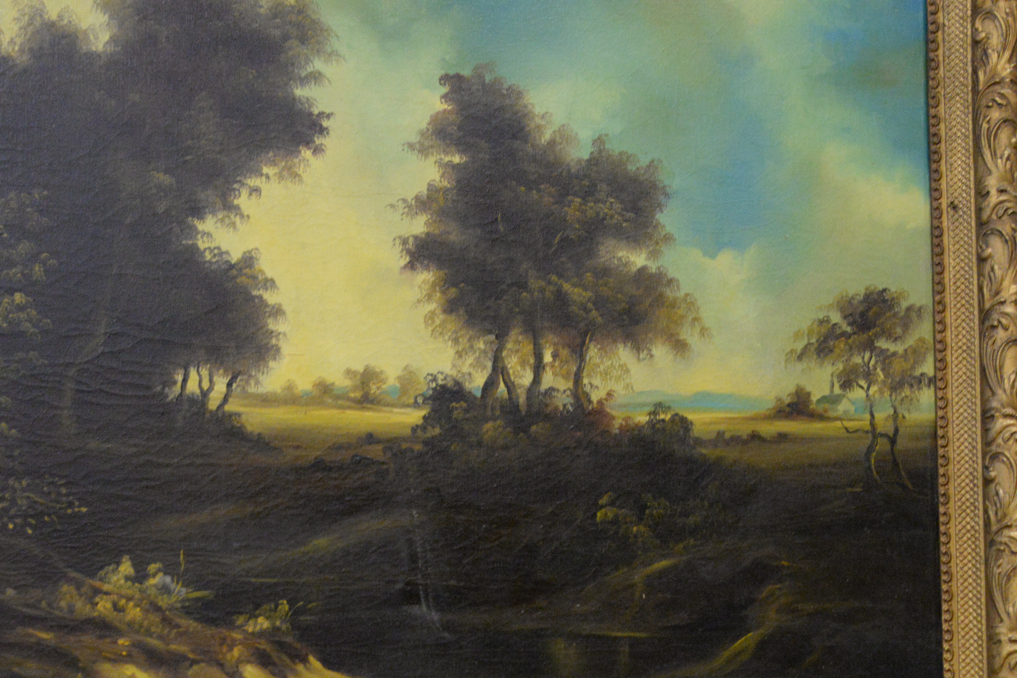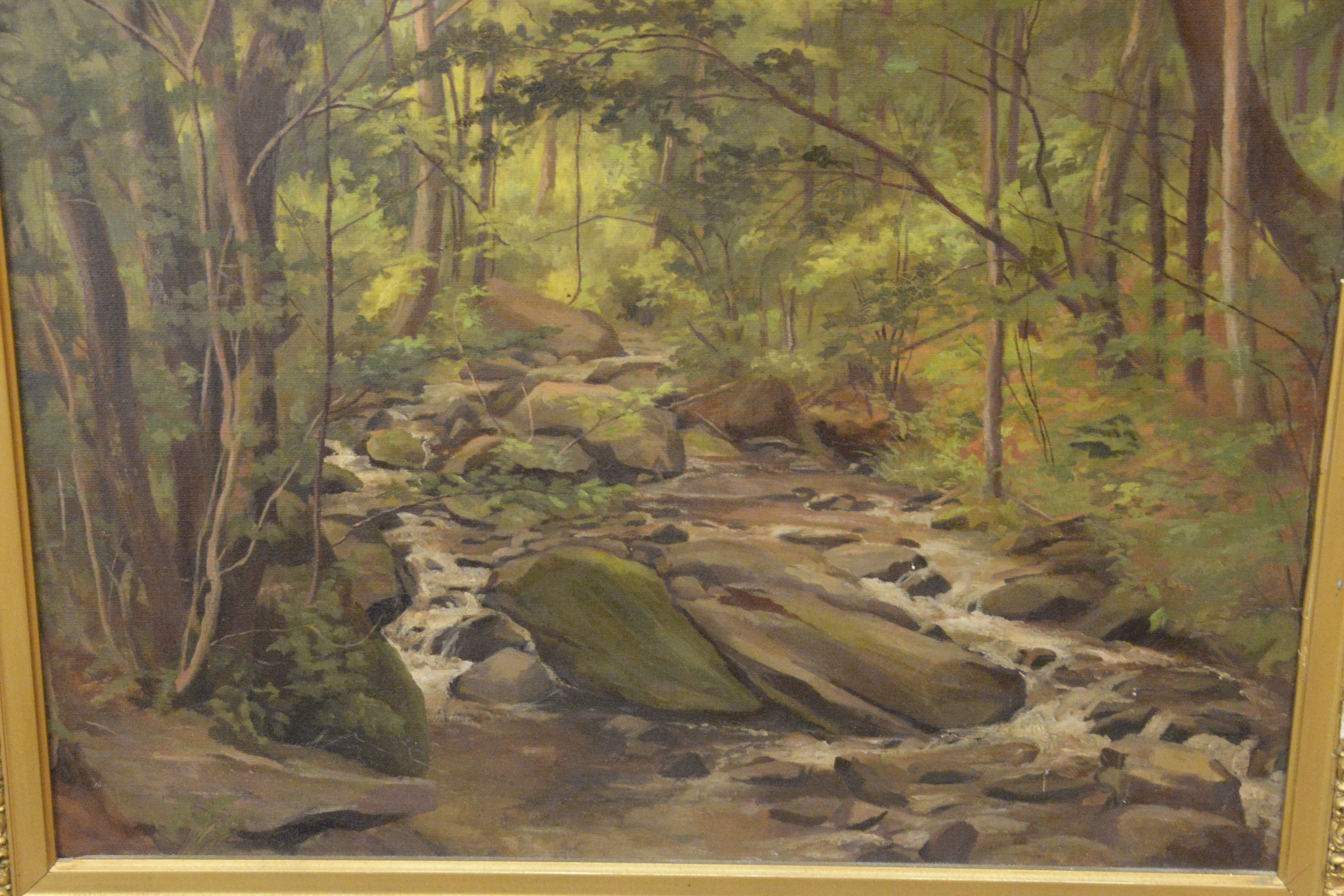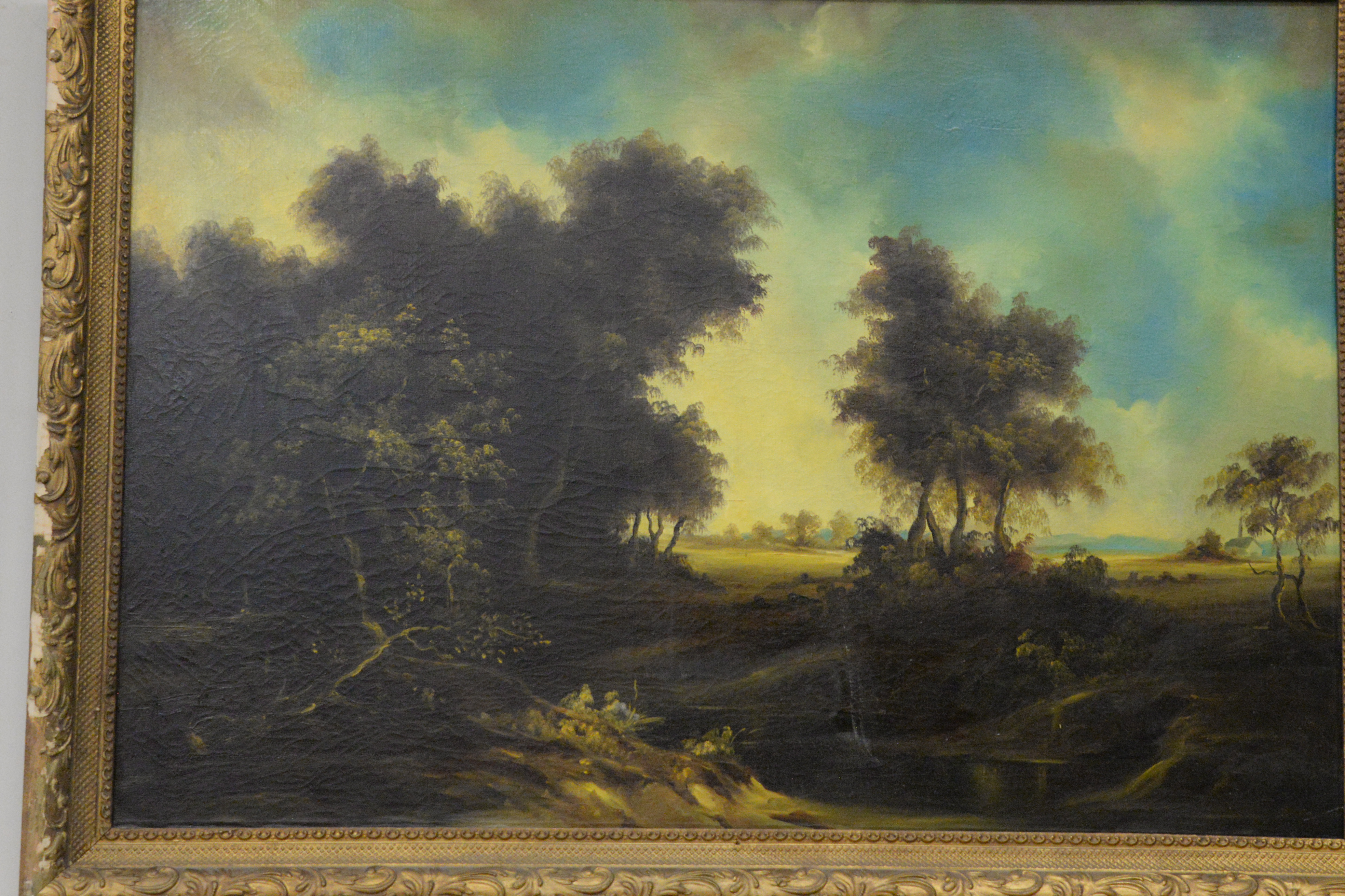 Two Oil on Canvas Landscapes, to include, 19th century, continental sunset along with wooded landscape with stream, 26 1/2″ x 29″