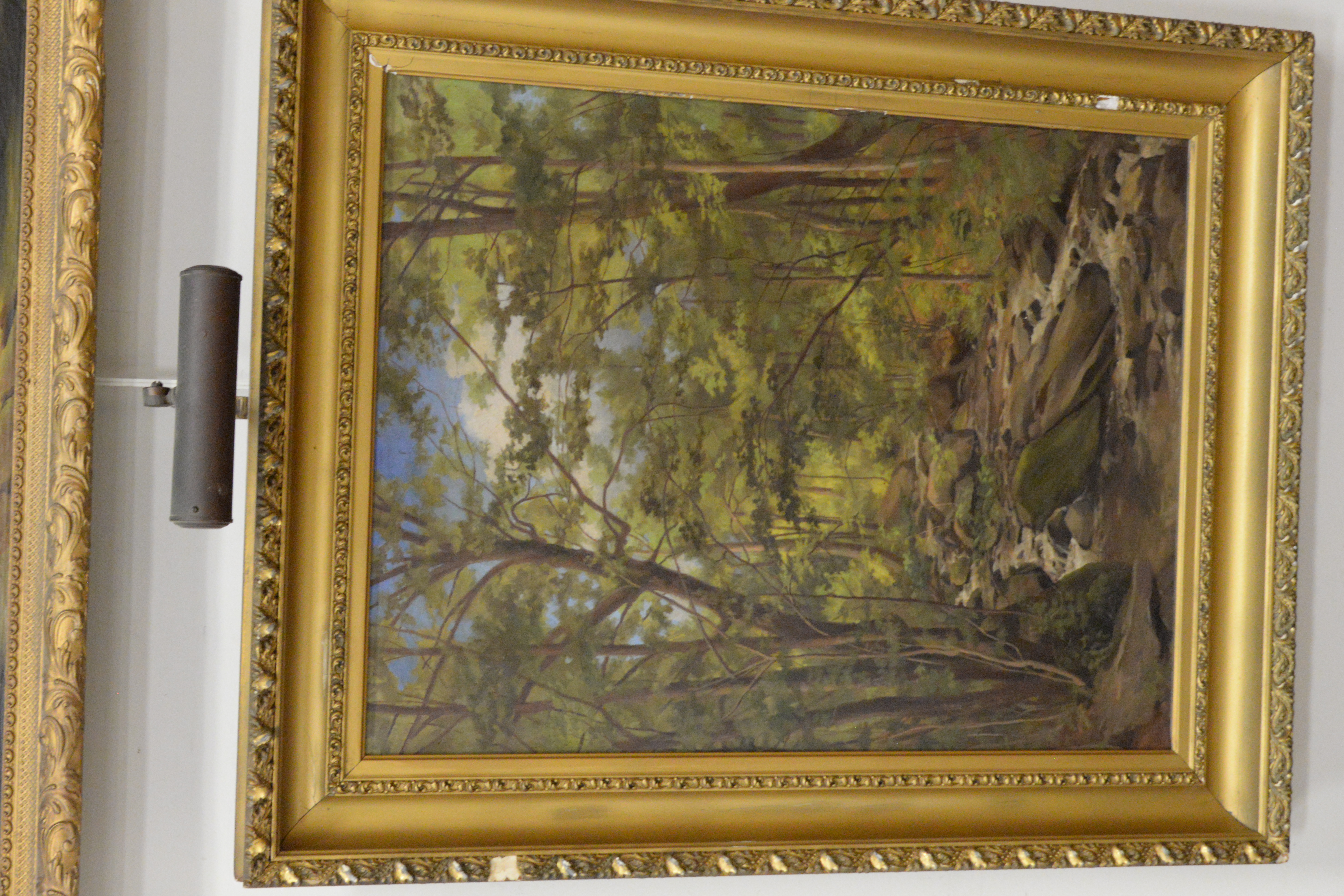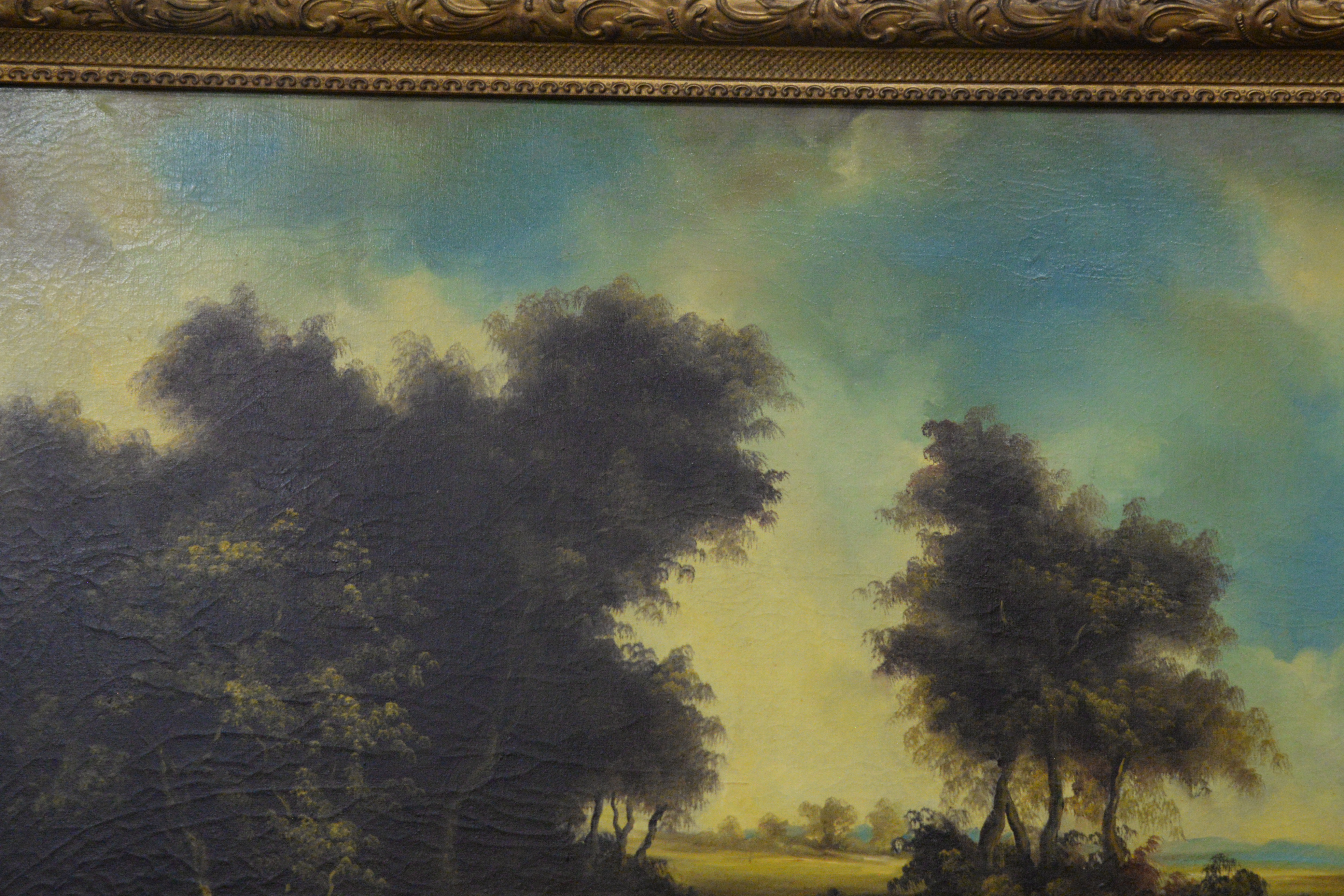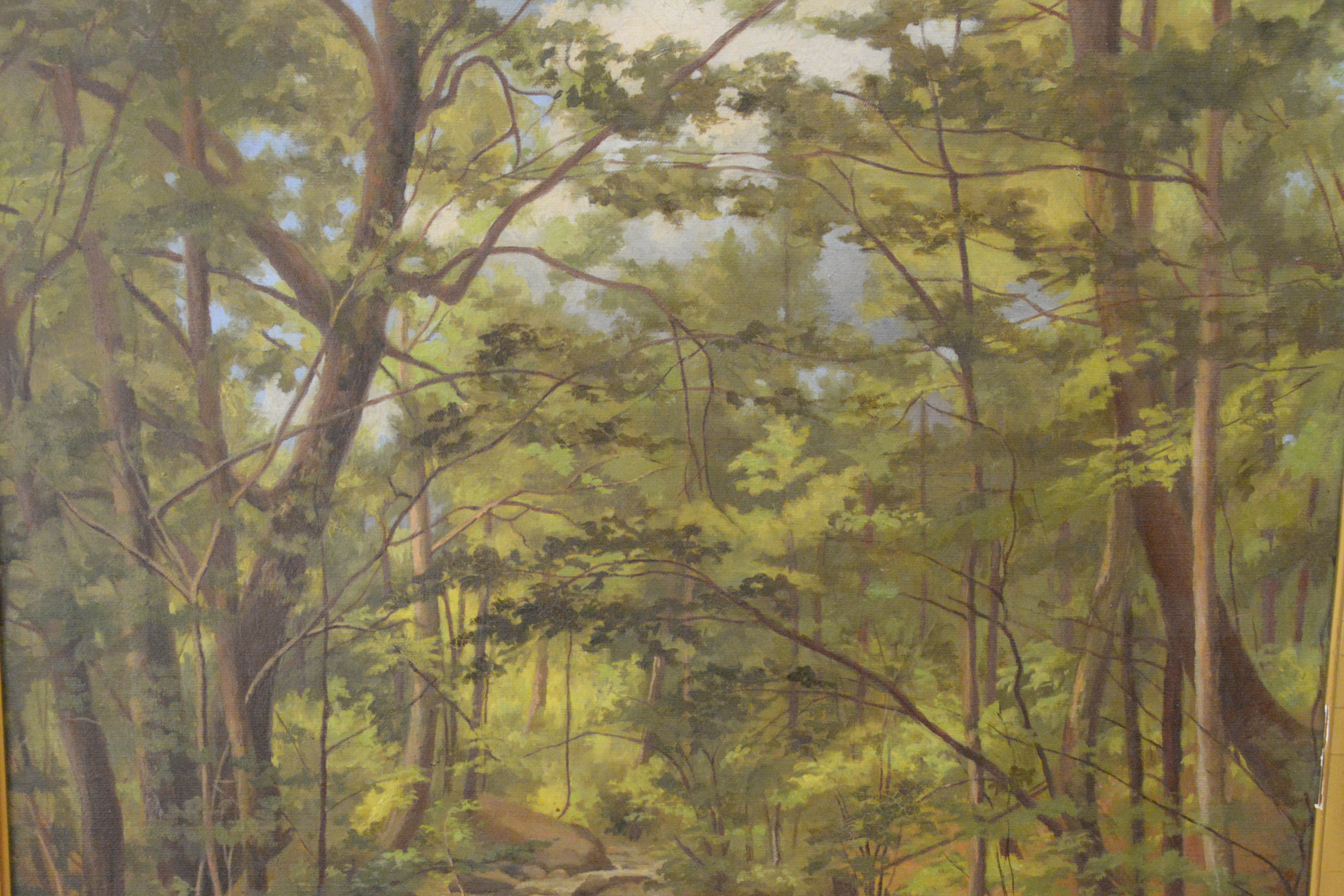 Two Oil on Canvas Landscapes, to include, 19th century, continental sunset along with wooded landscape with stream, 26 1/2″ x 29″