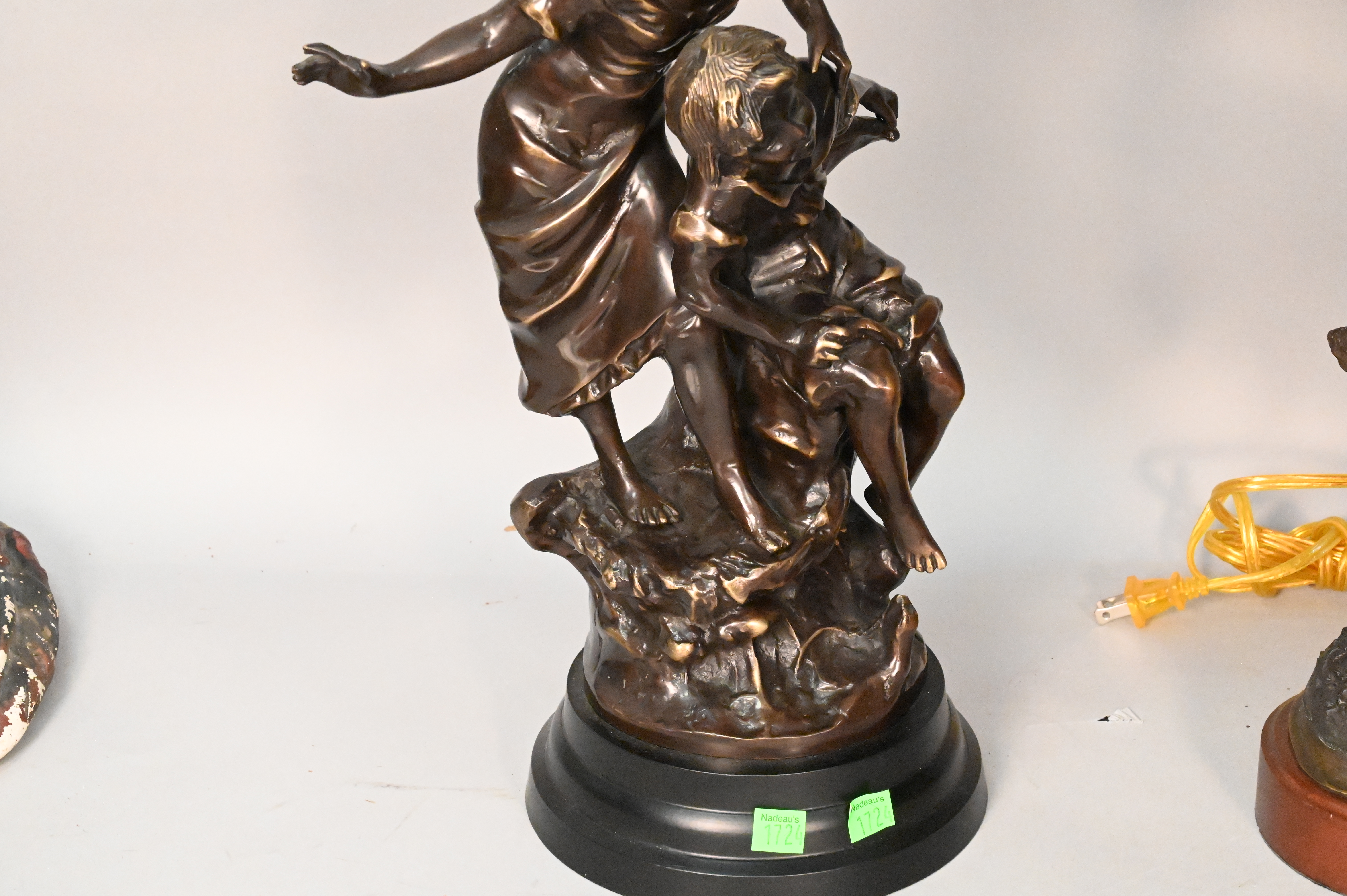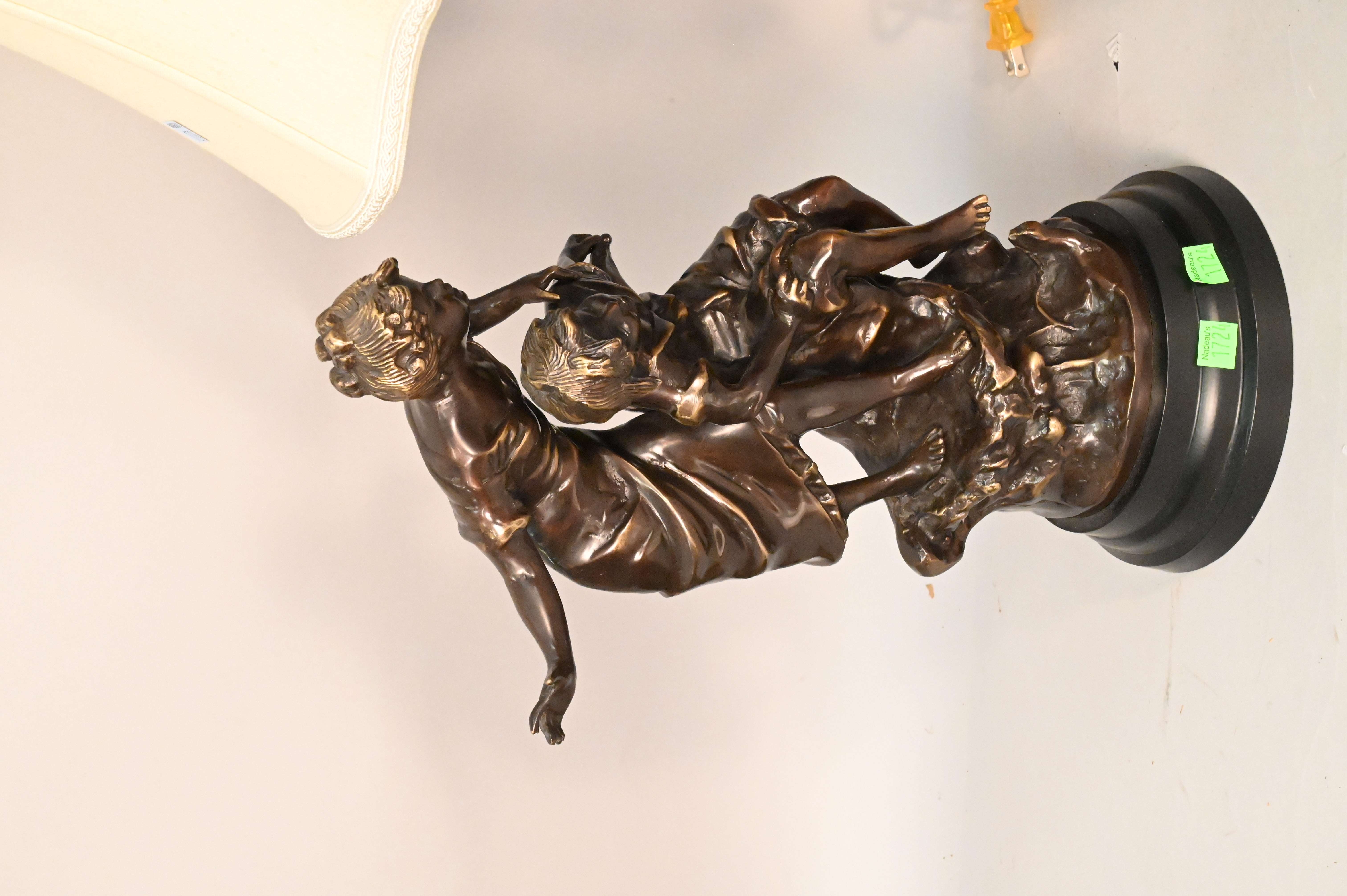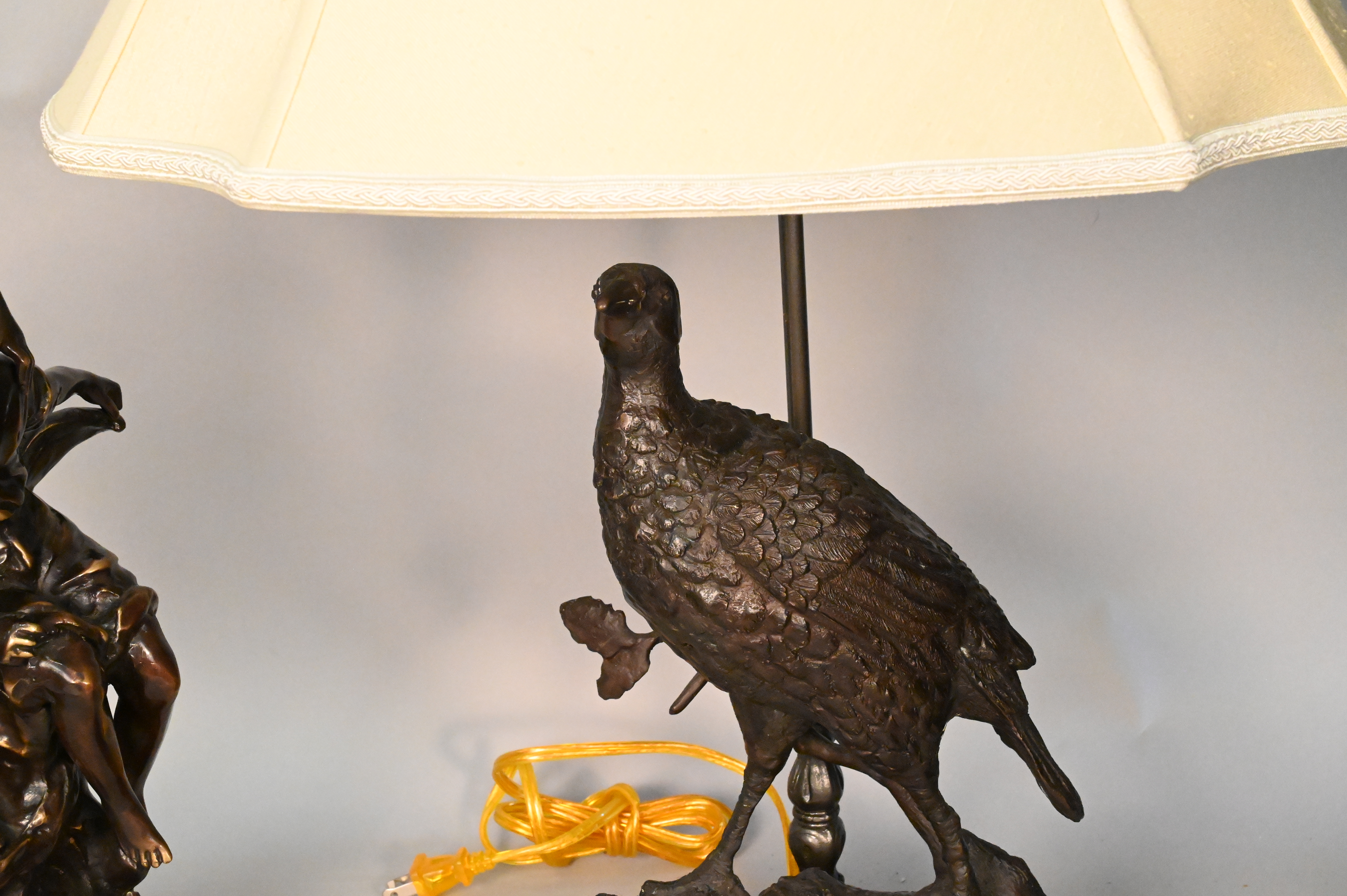 Two Piece Bronze Lot, to include a bronze pheasant mounted as a table lamp, along with a bronze statue of two children, lamp approximate height 32 inches.