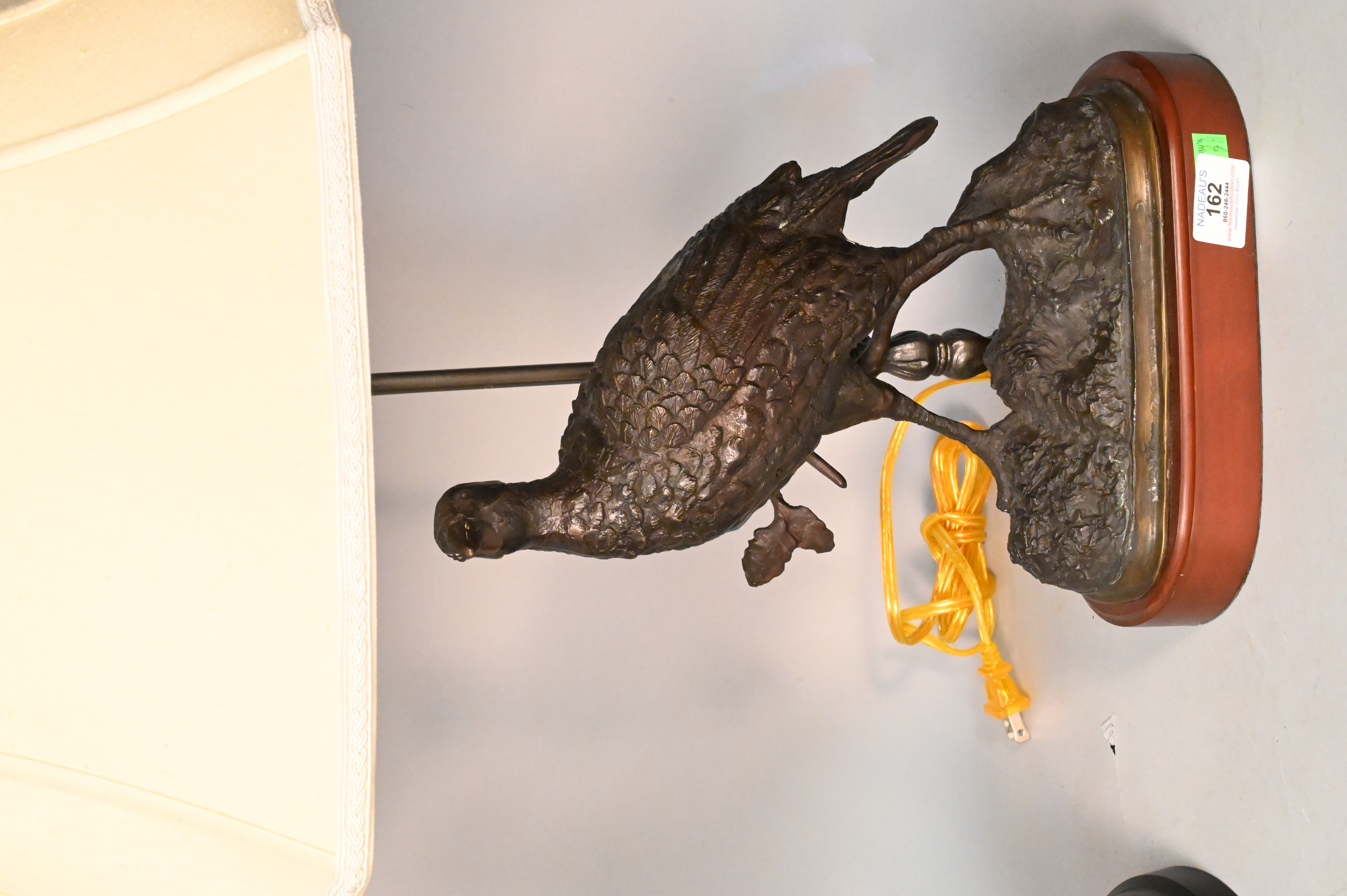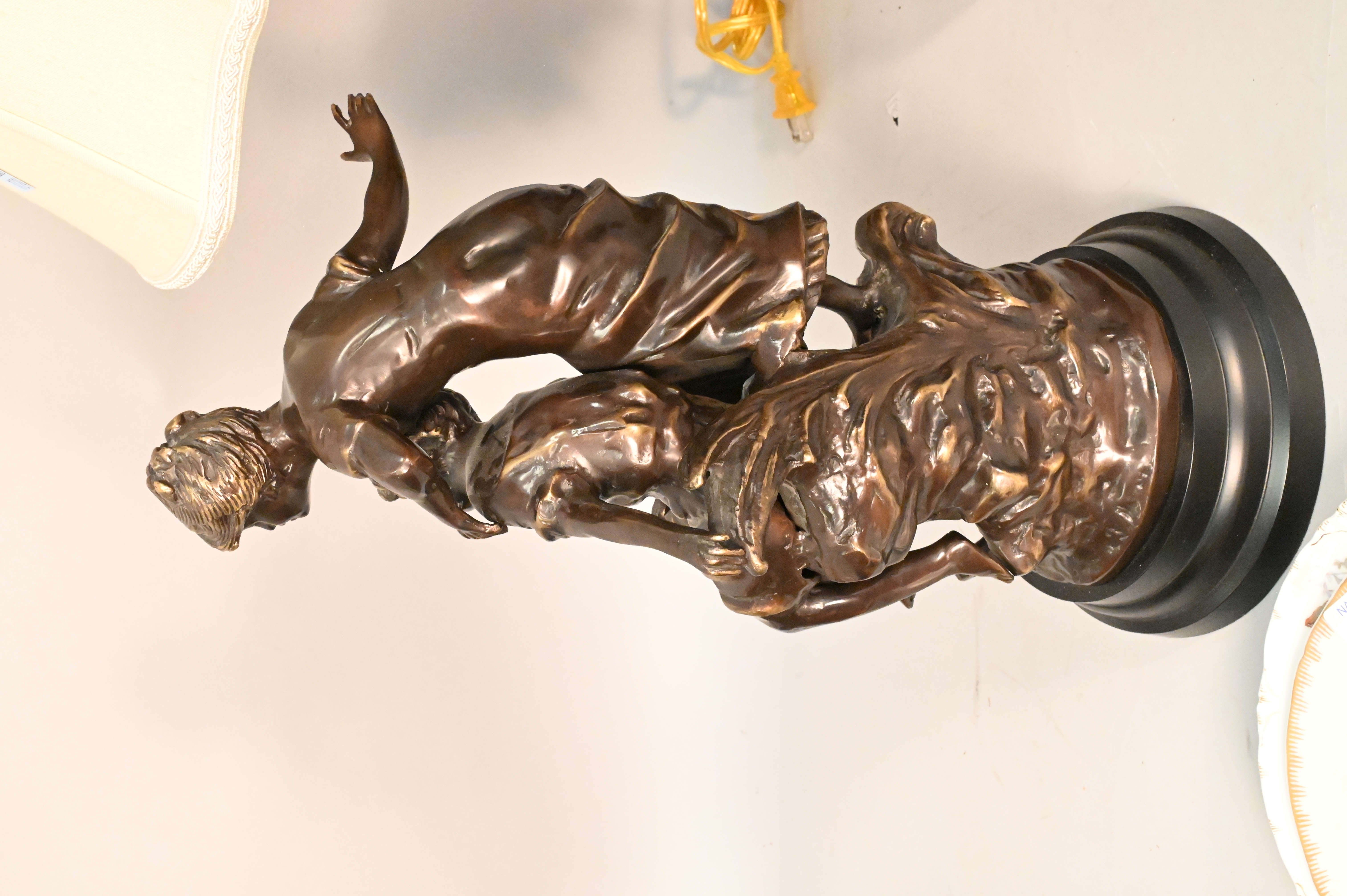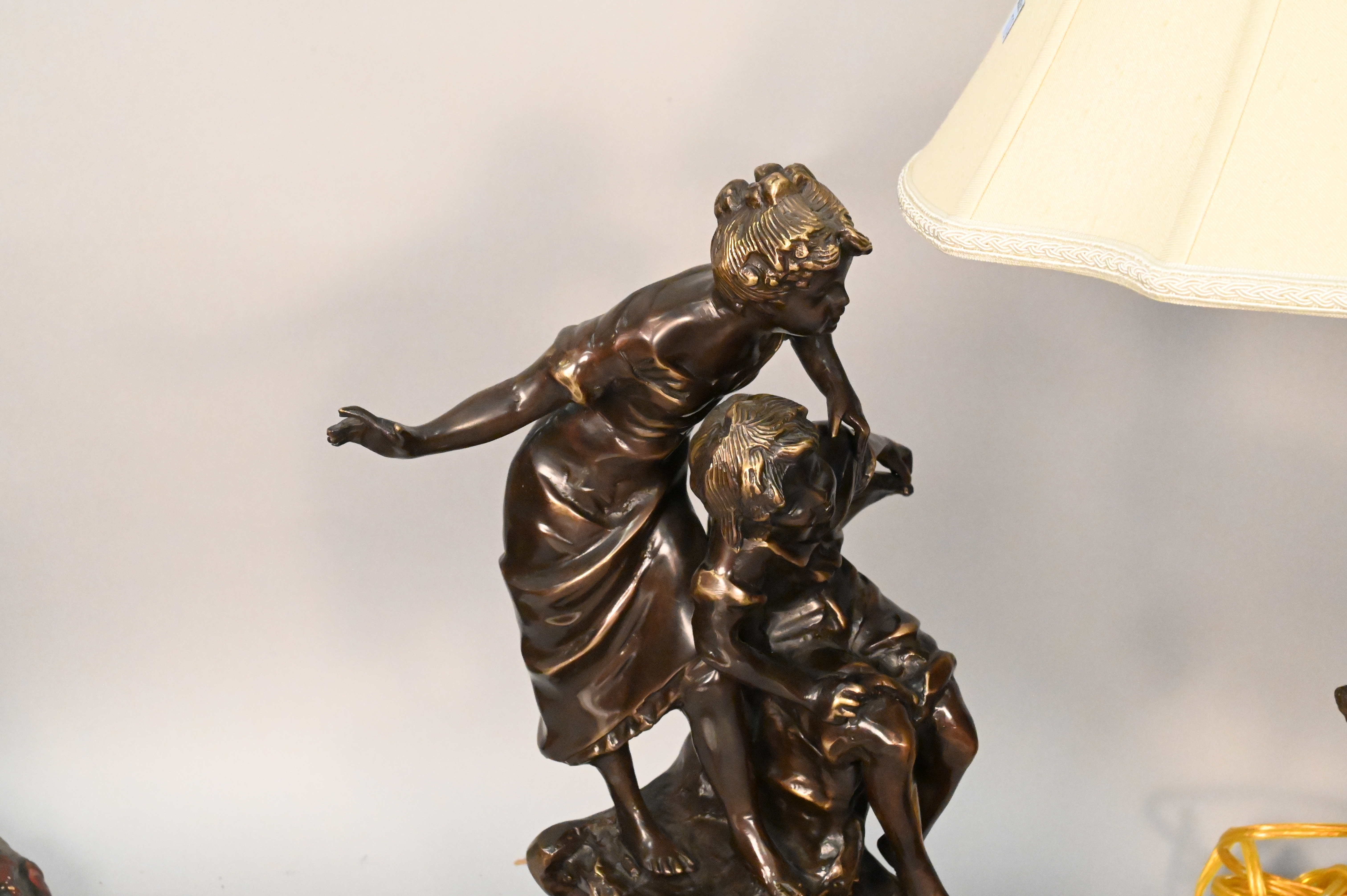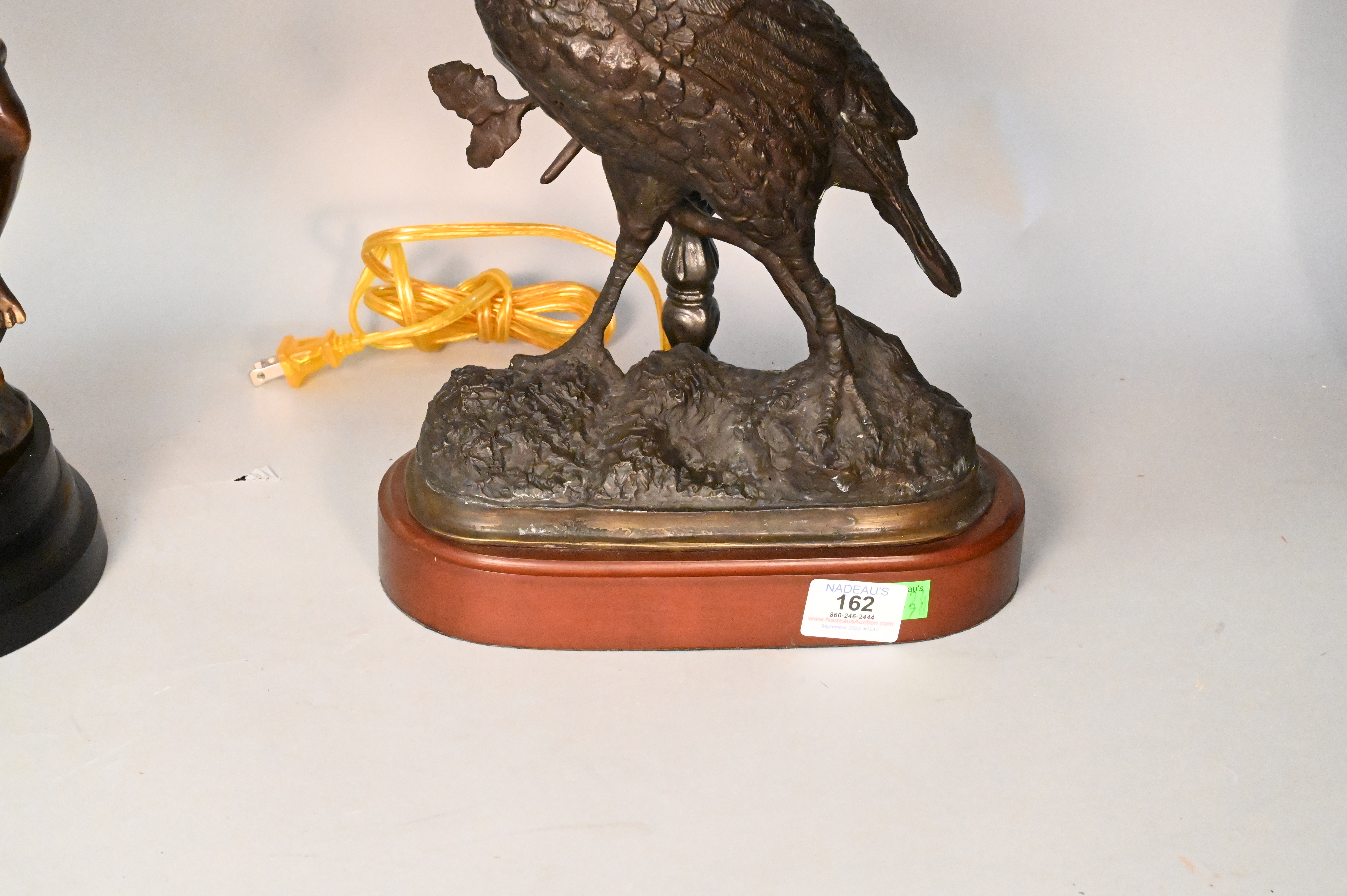 Two Piece Bronze Lot, to include a bronze pheasant mounted as a table lamp, along with a bronze statue of two children, lamp approximate height 32 inches.