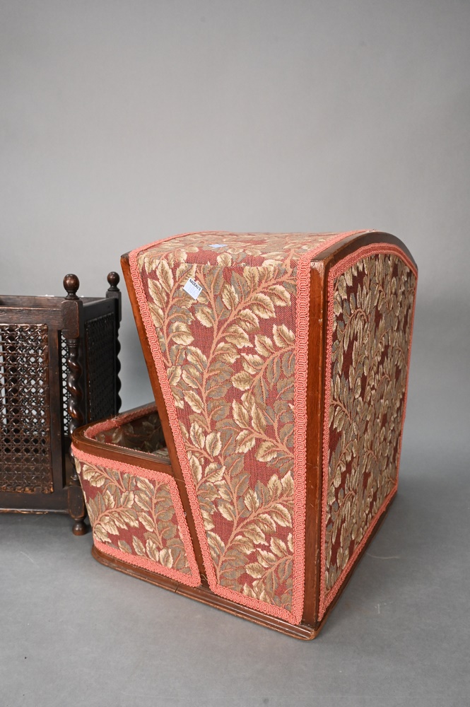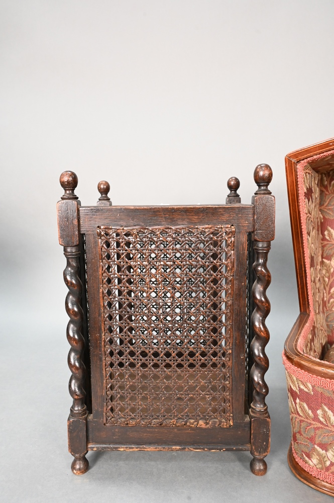 Lot 162: Two Piece Lot, to include mahogany and custom upholstered cat or small dog bed, plus caned oak waste paper basket, height 19 inches, width 21 1/2 inches, depth 16 inches.