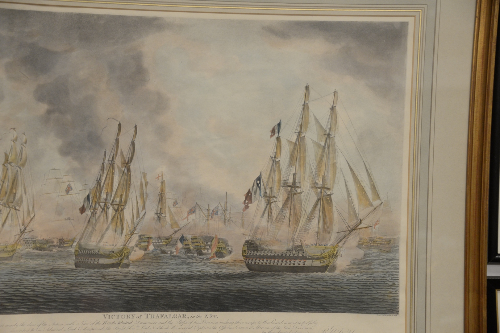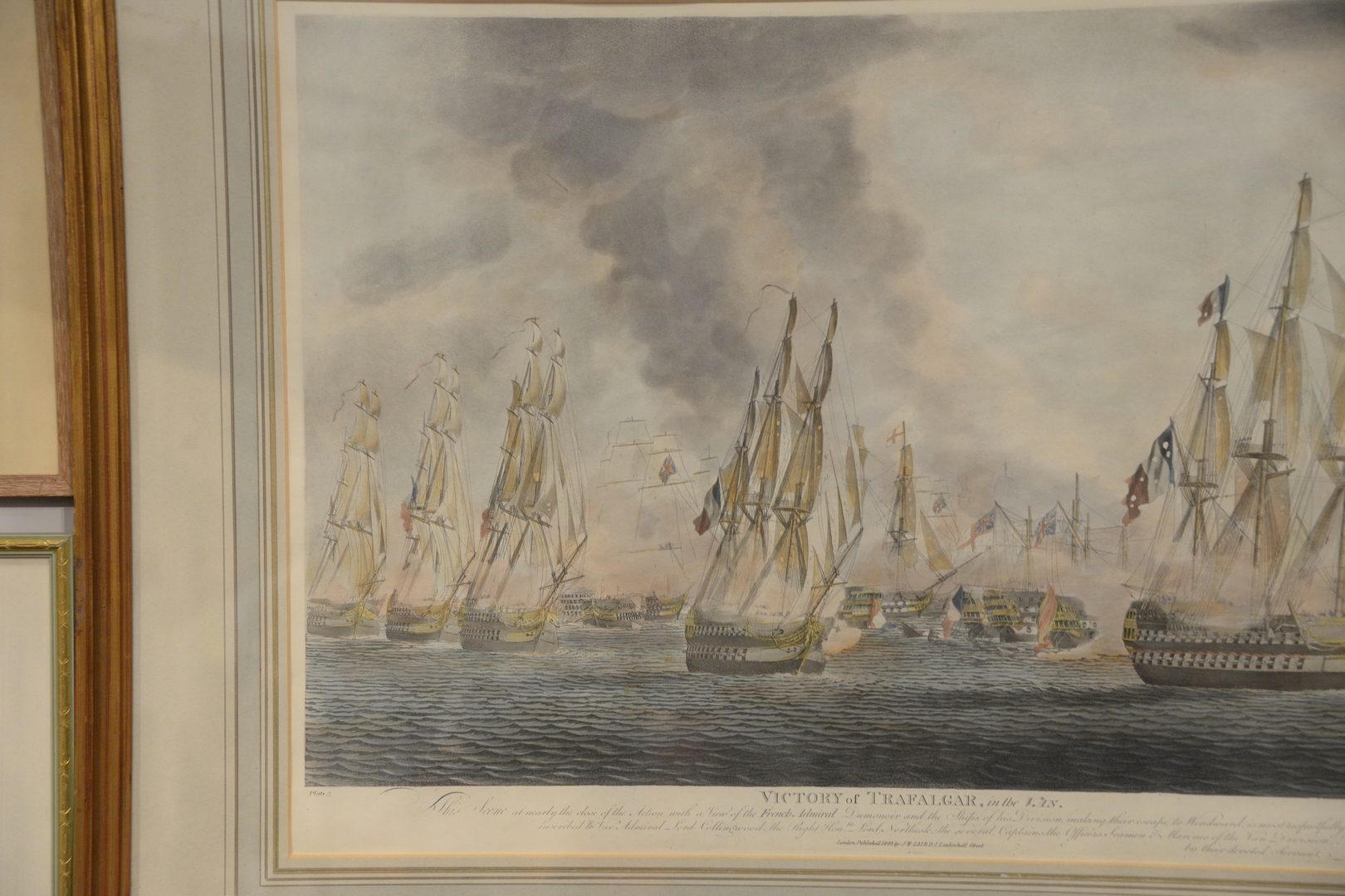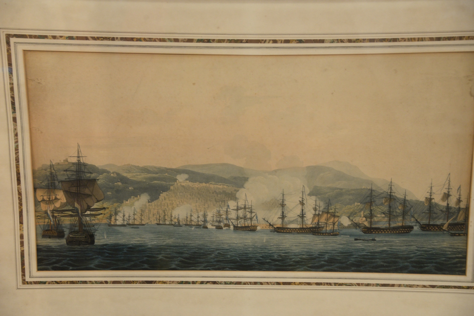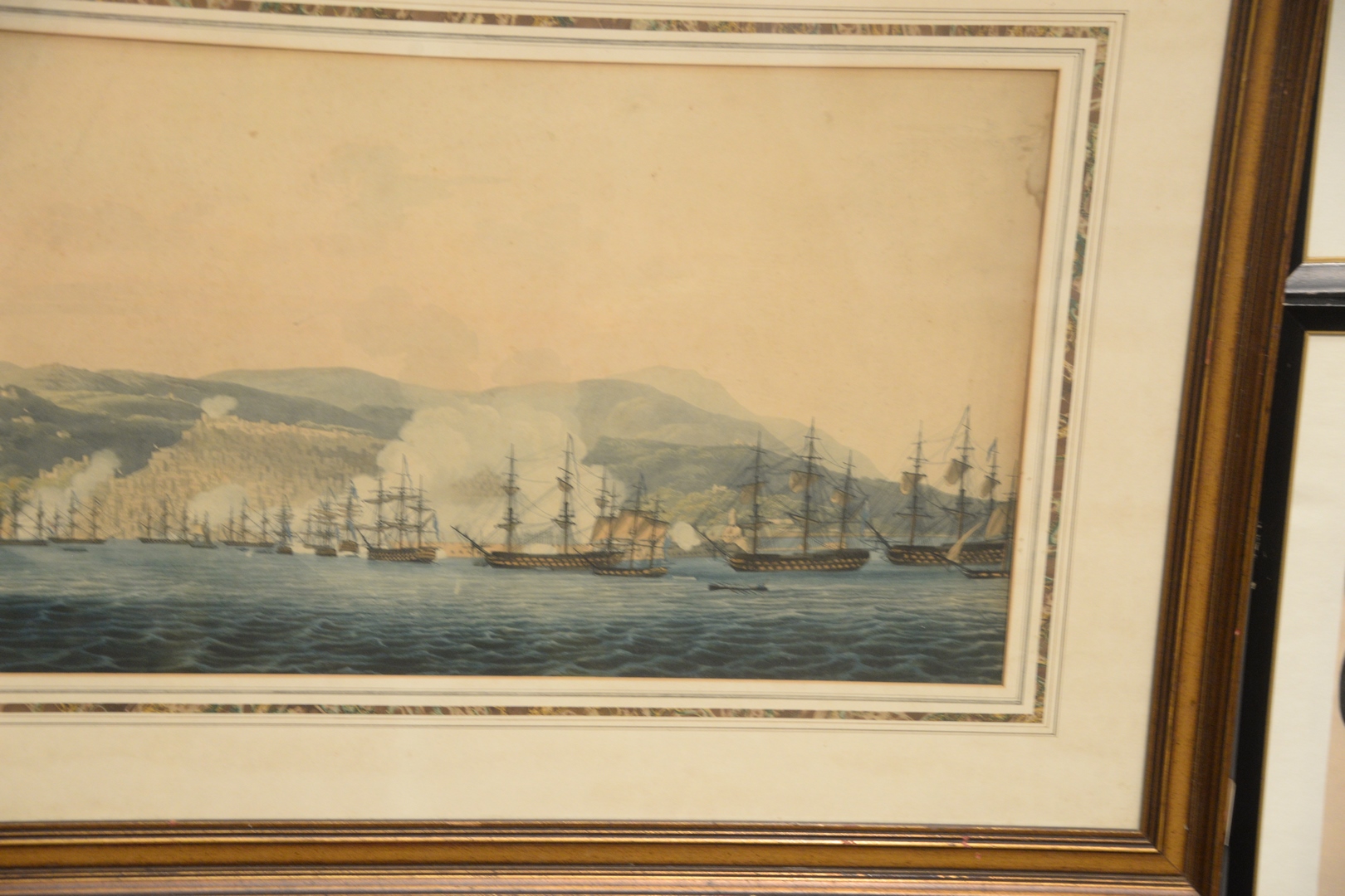 Lot 162: Two-Pieces Group to include Victory of Trafalgar engraving on paper by Robert Dodd, along with an unsigned harbor scene, water damaged lithograph, sight size of largest 19 x 30.