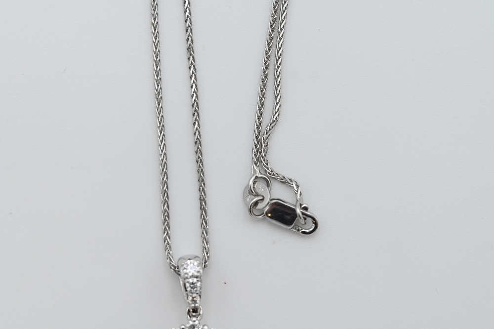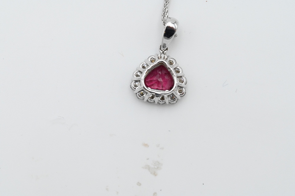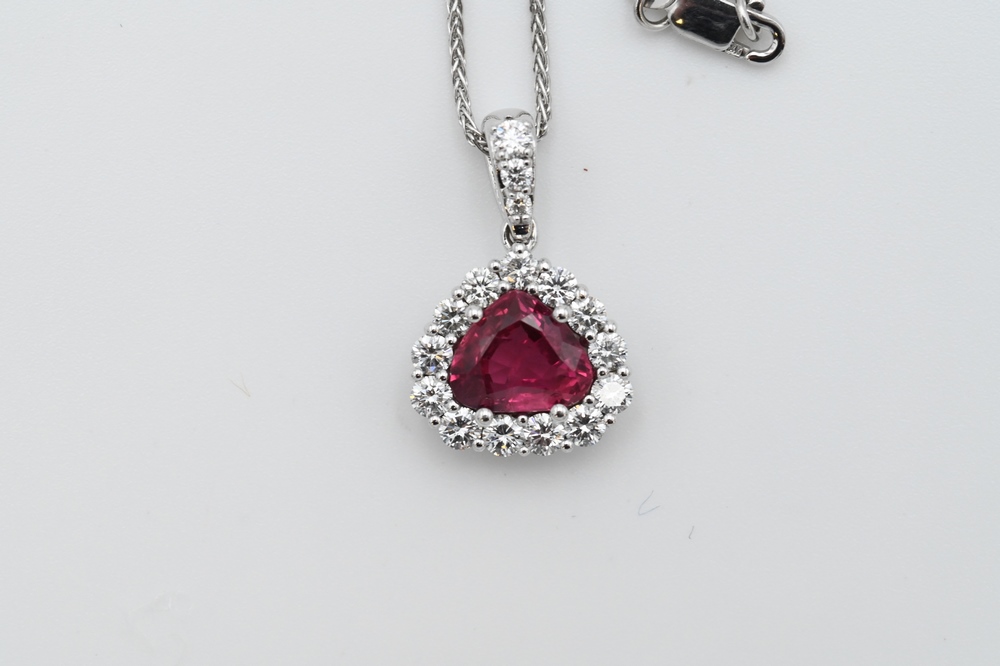 Lot 163: 18 Karat White Gold Pendant, containing pear mixed cut natural ruby, 2.32 carats; 16 brilliant cut diamond, 1.01 carats; on a 14 kar…