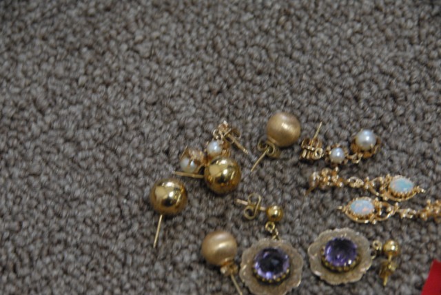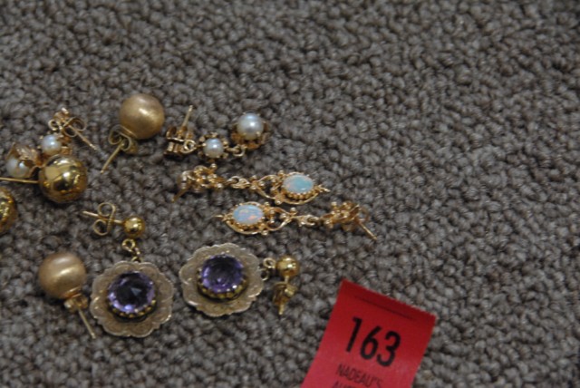 5 pairs of gold earrings having various stones including pearls, amethysts, opals, and round beads.