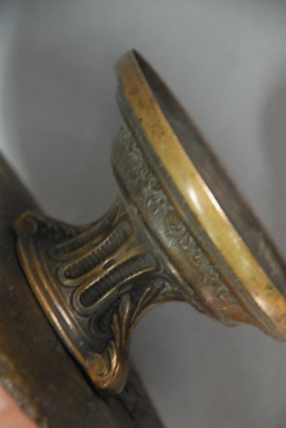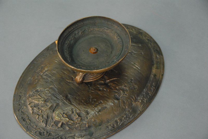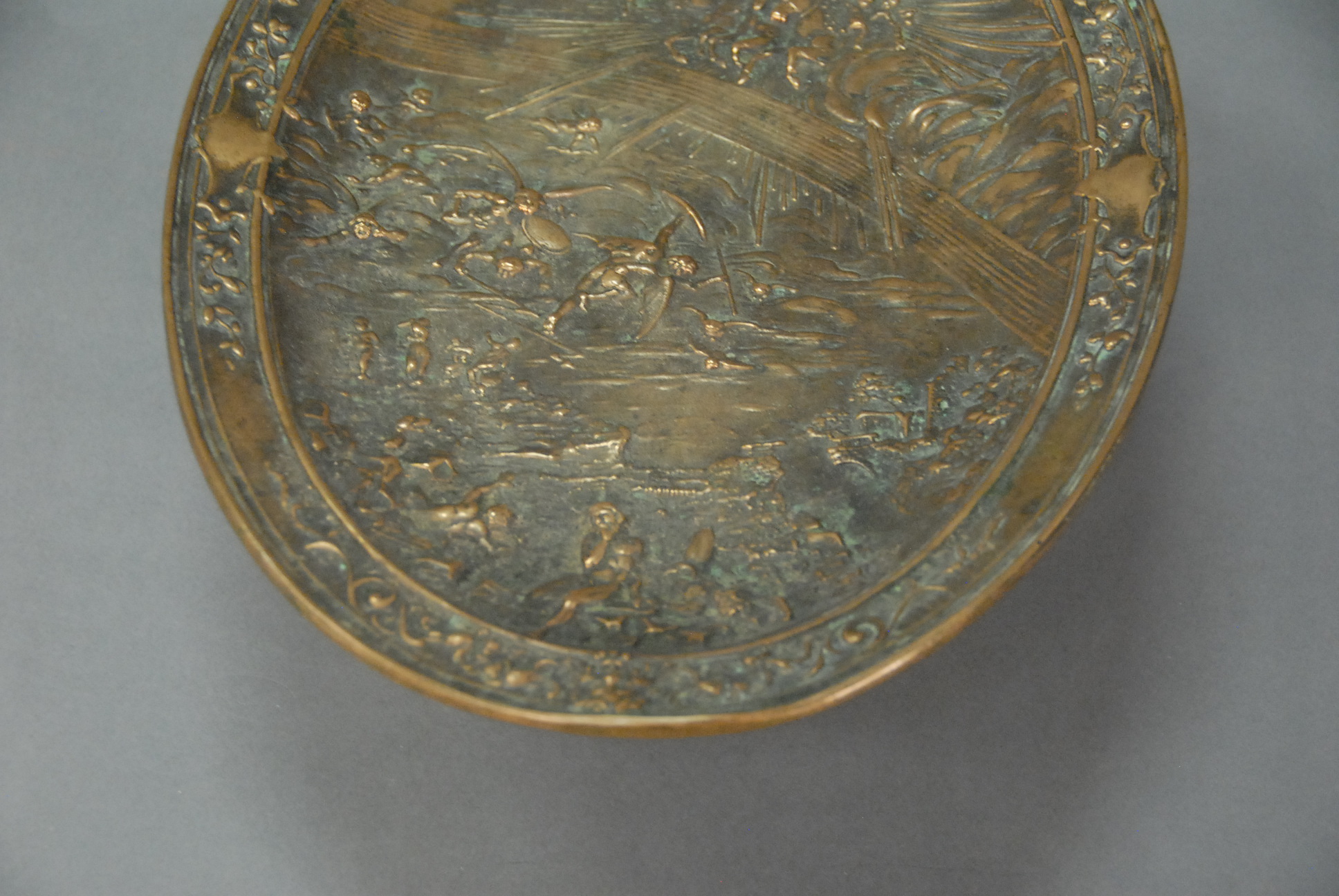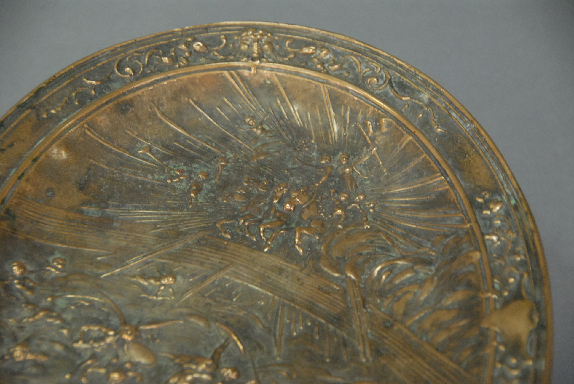 Bronze compote with embossed horses with riders and winged figures with swords. 10 x 14