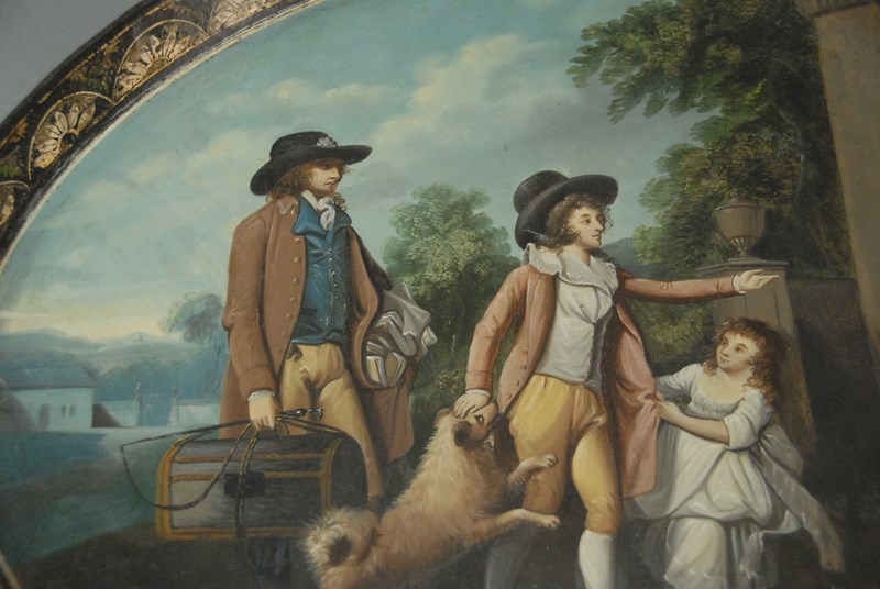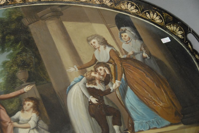 Lot 163: Early tole tray with handles, hand painted scene in manner of George Moreland, 19th century, 23 x 30.