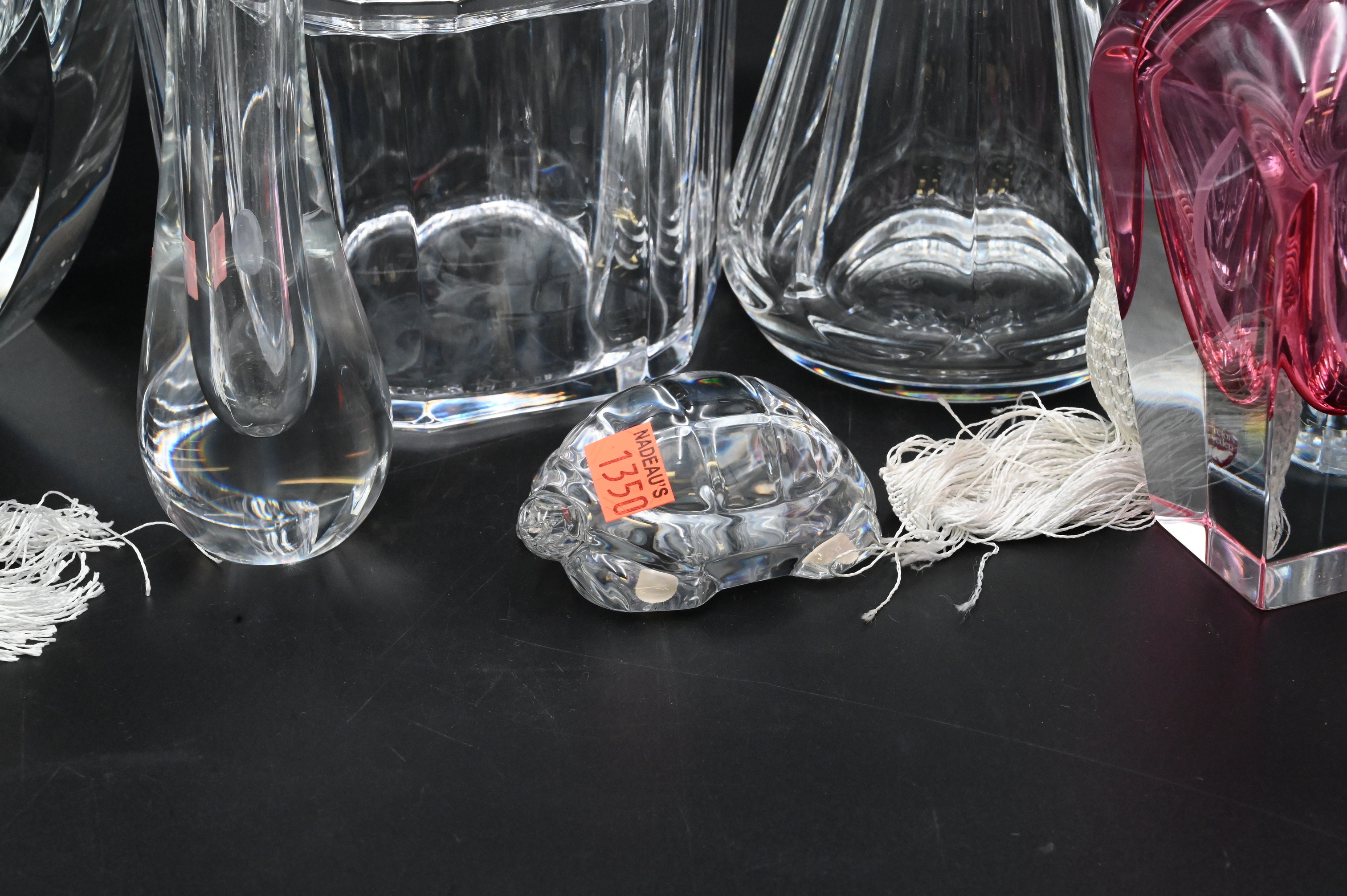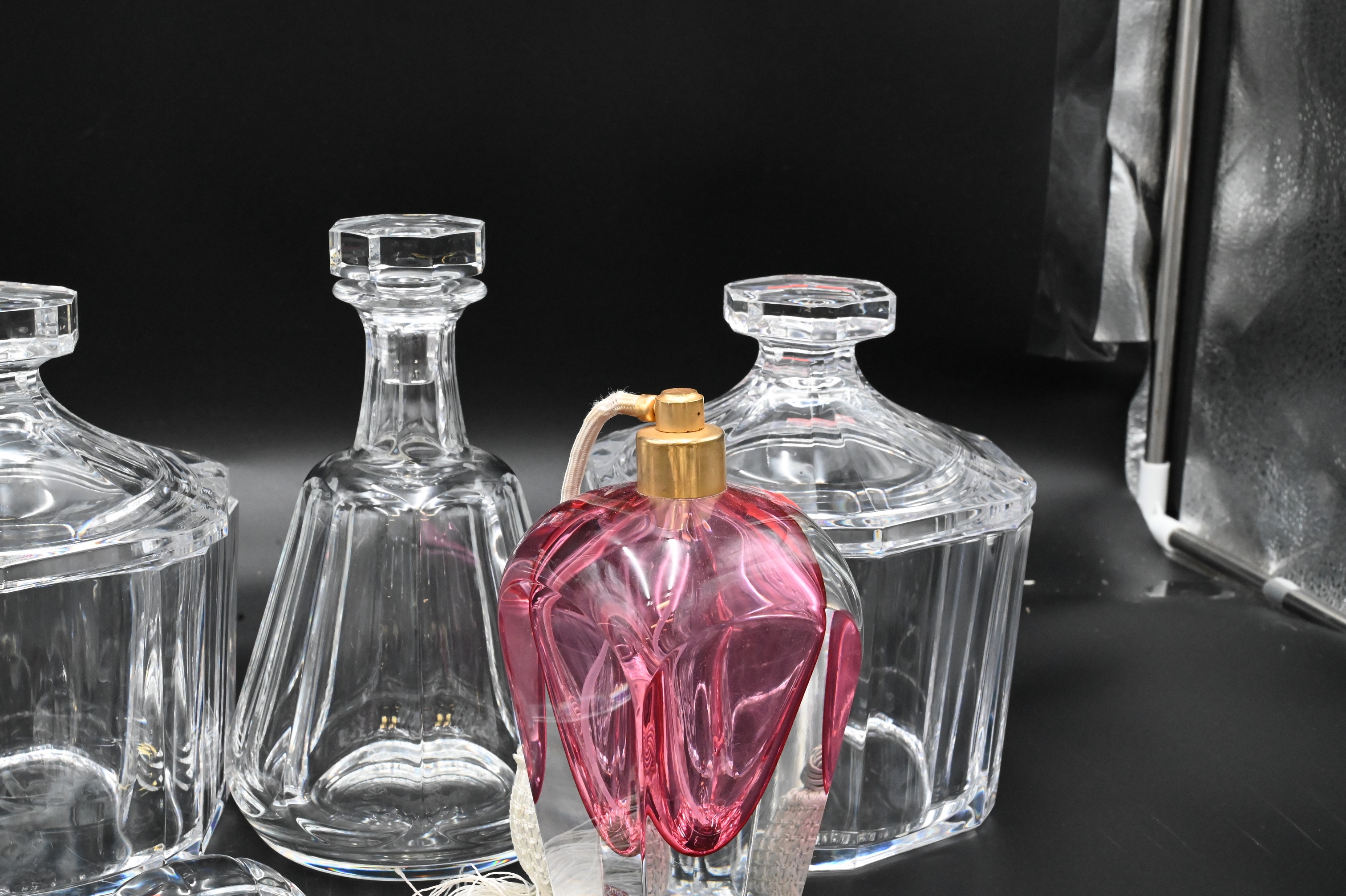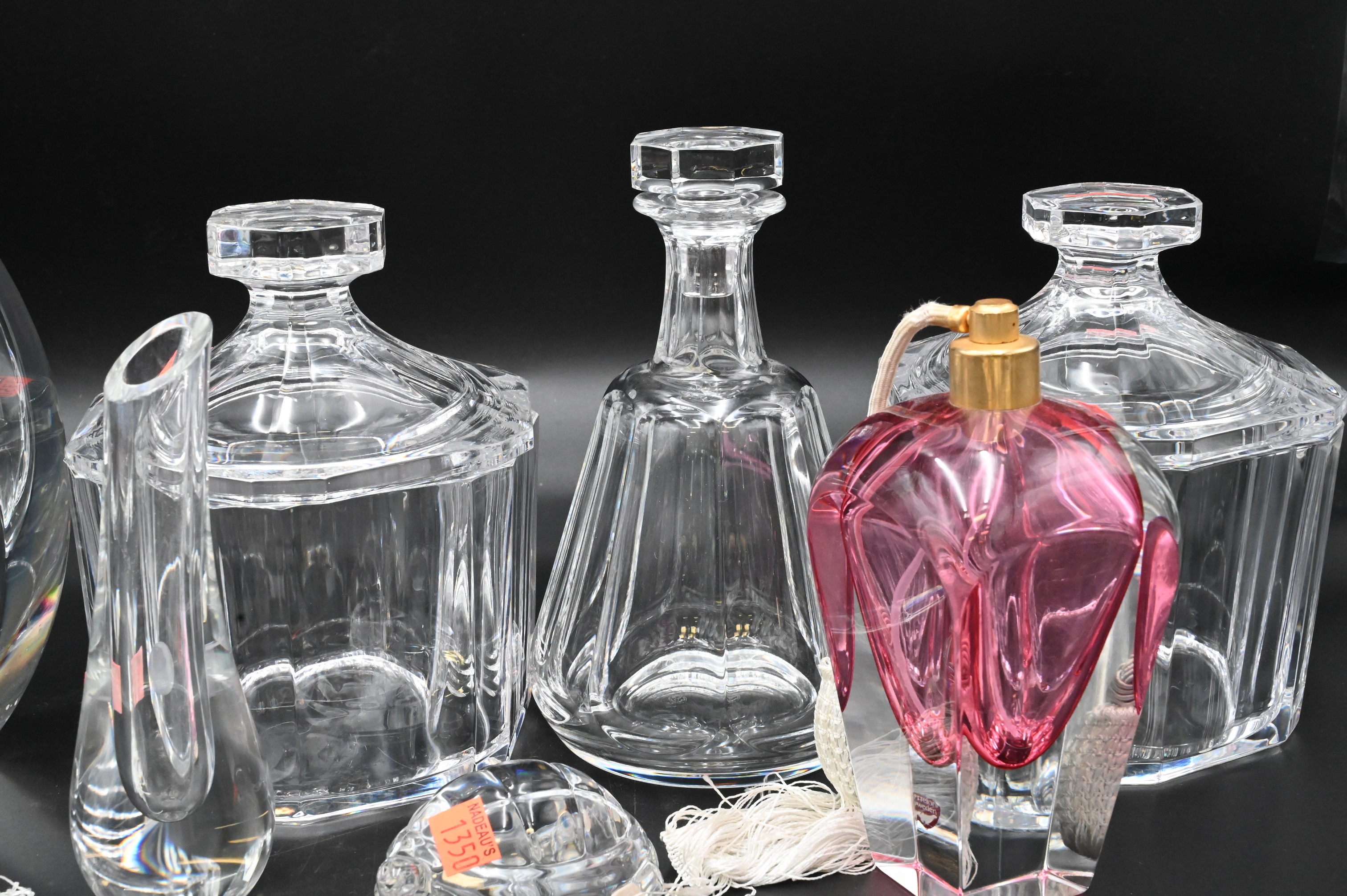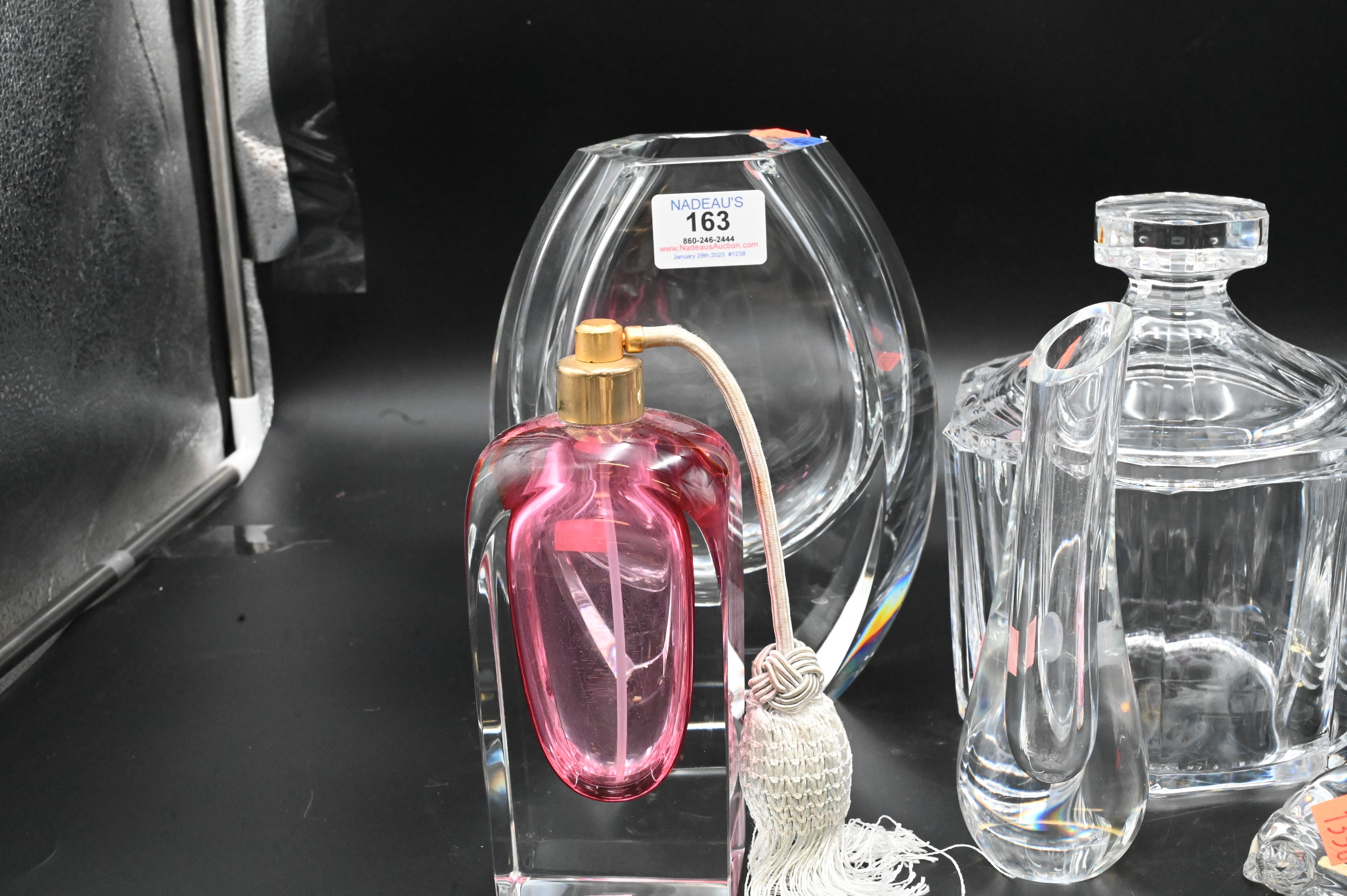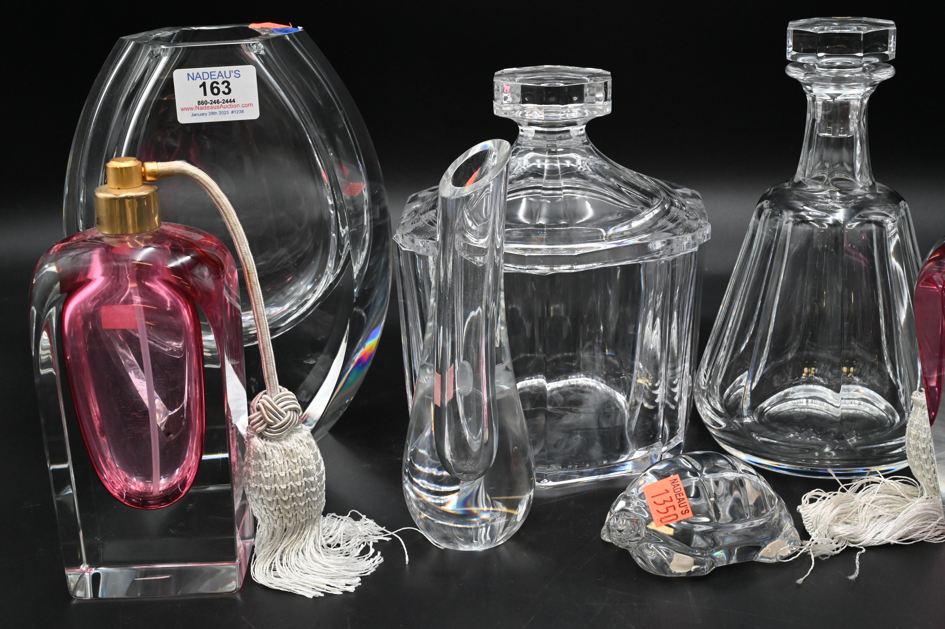 Eight Piece Lot of Baccarat, four piece lot, to include a decanter, two vases, one turtle, two cranberry to clear, atomizers, pair of heavy crystal Orrefors covered jars, tallest 9 inches. Provenance: Property from a private New York collection sold to benefit charitable foundations.