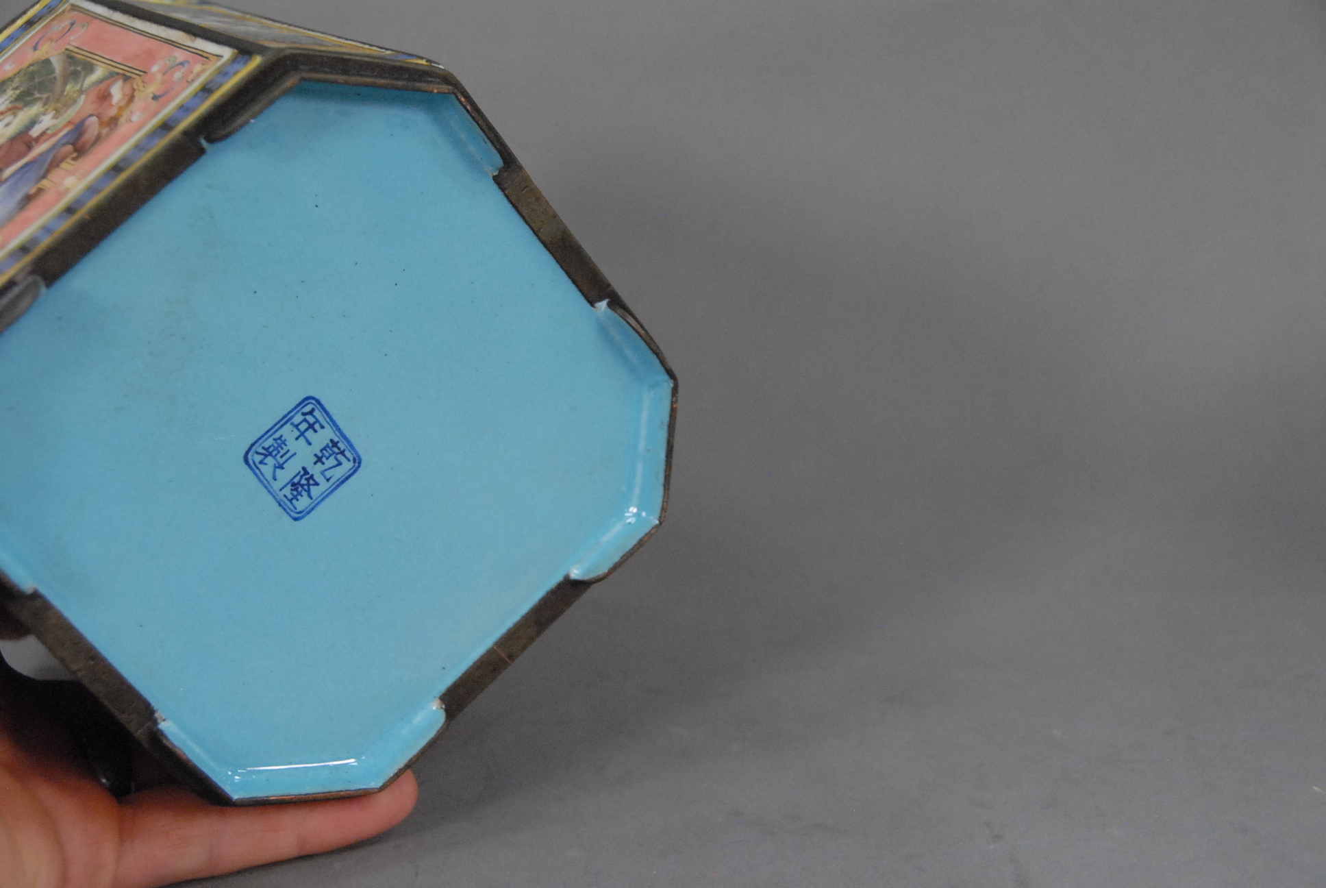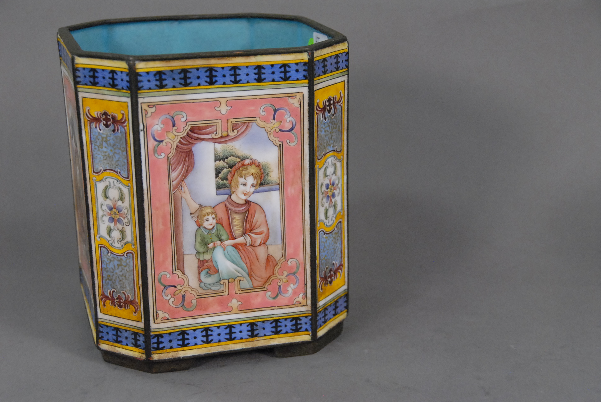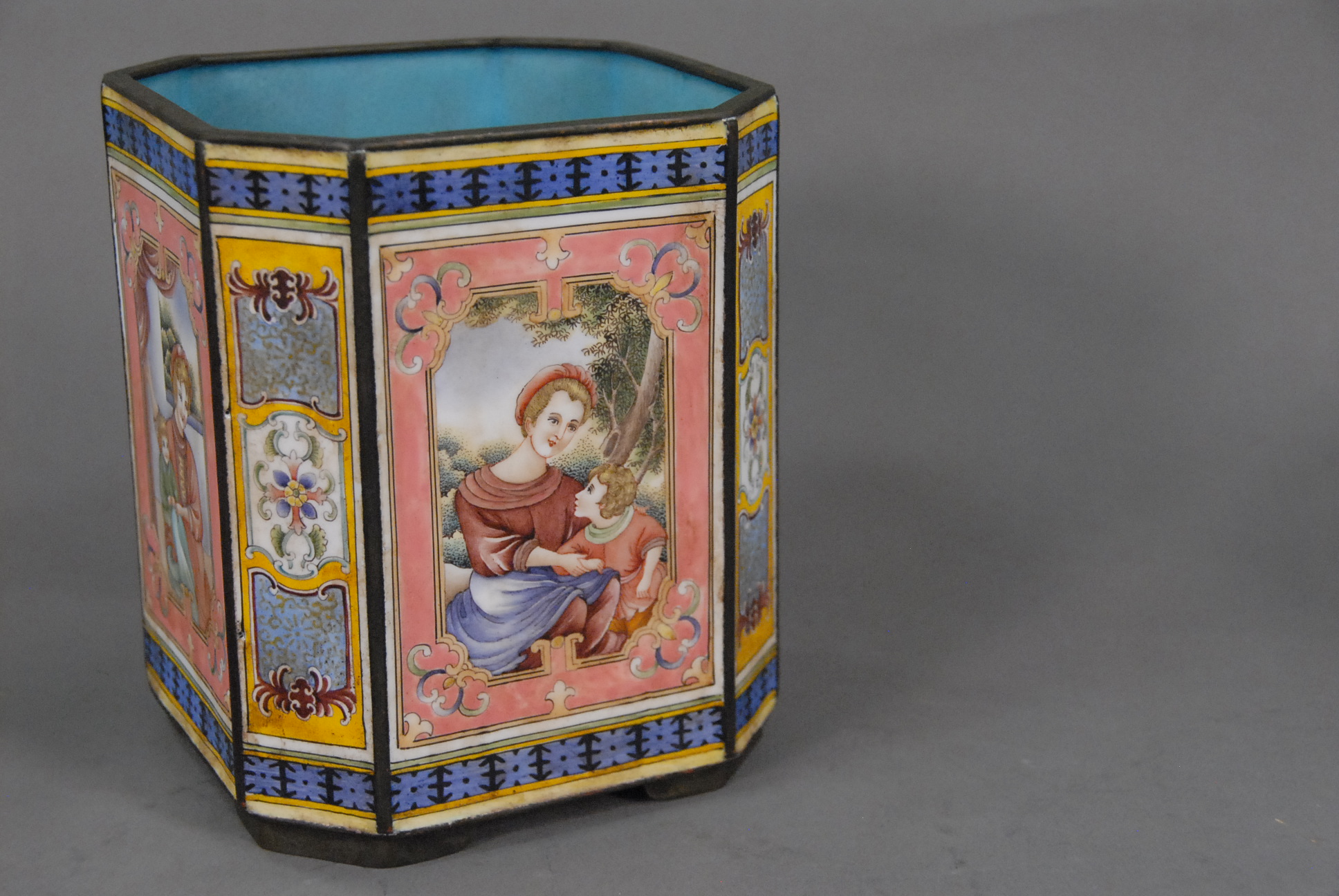 Enameled pot having 4 enameled sides with figures in a window and seal mark on the bottom.