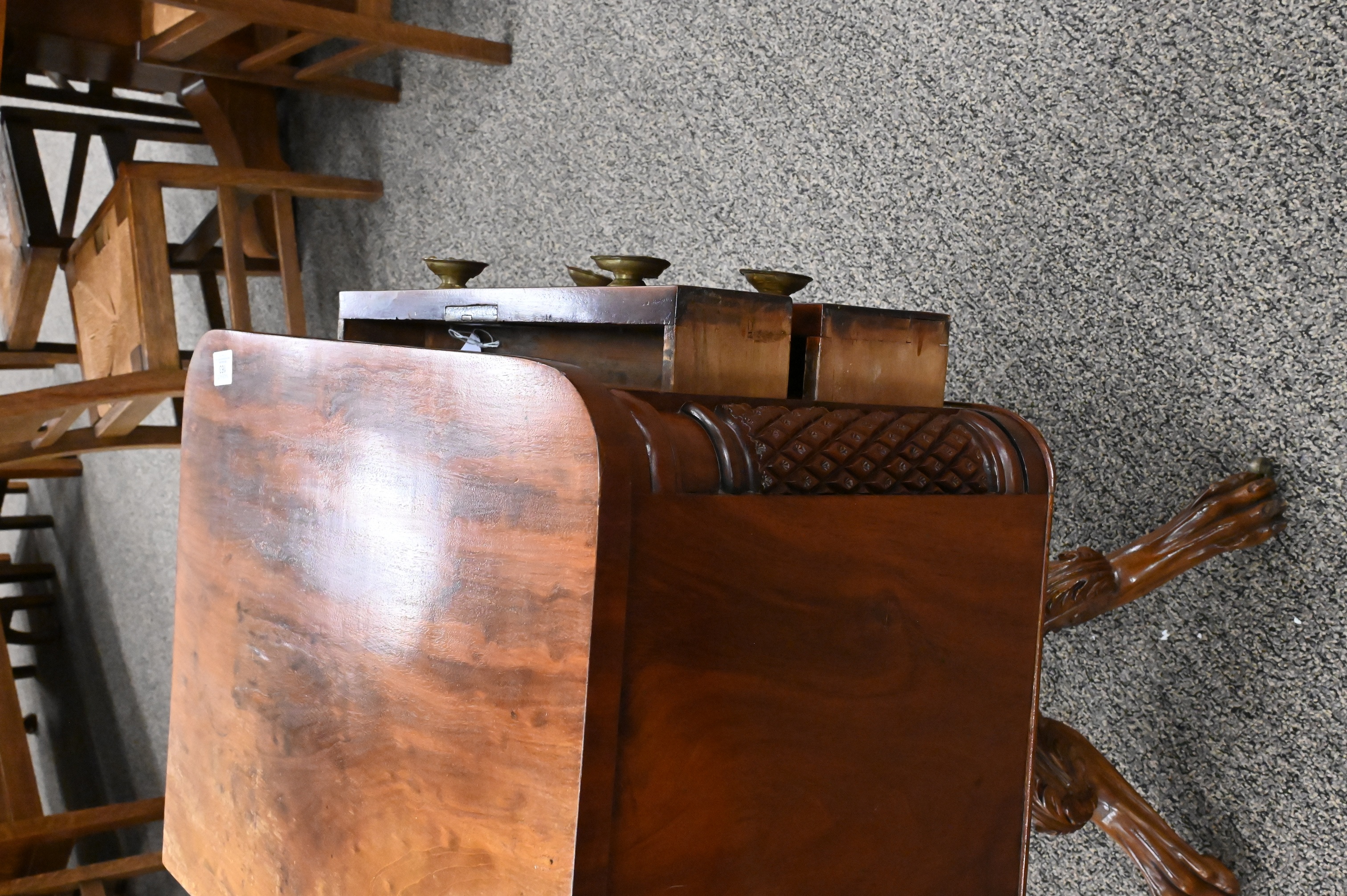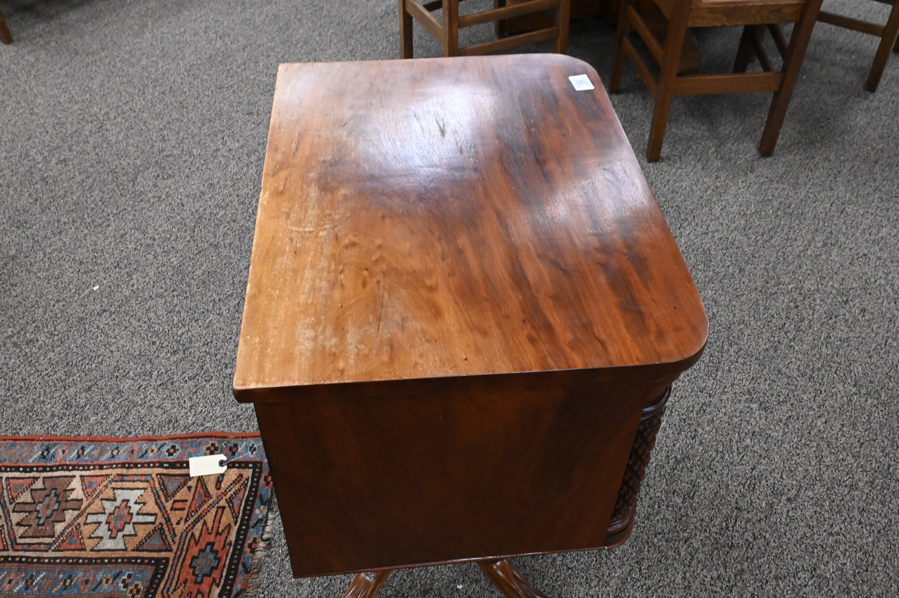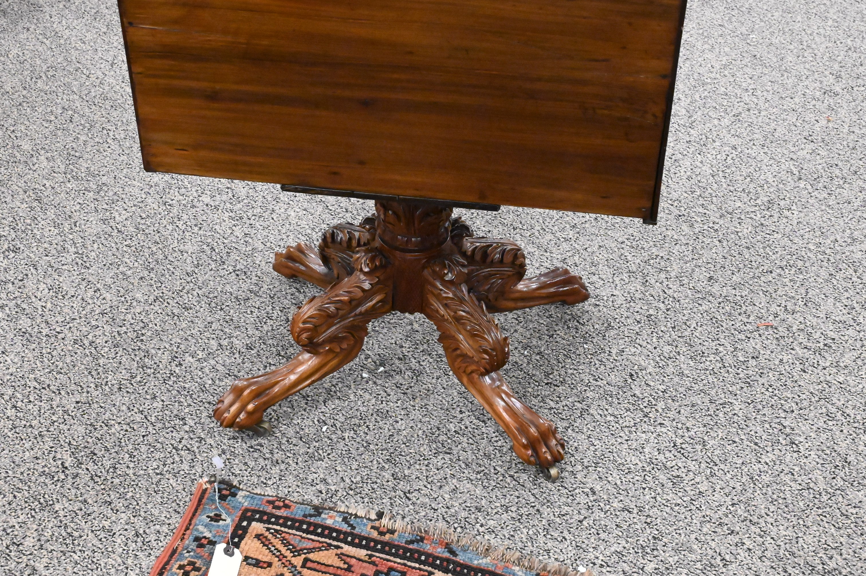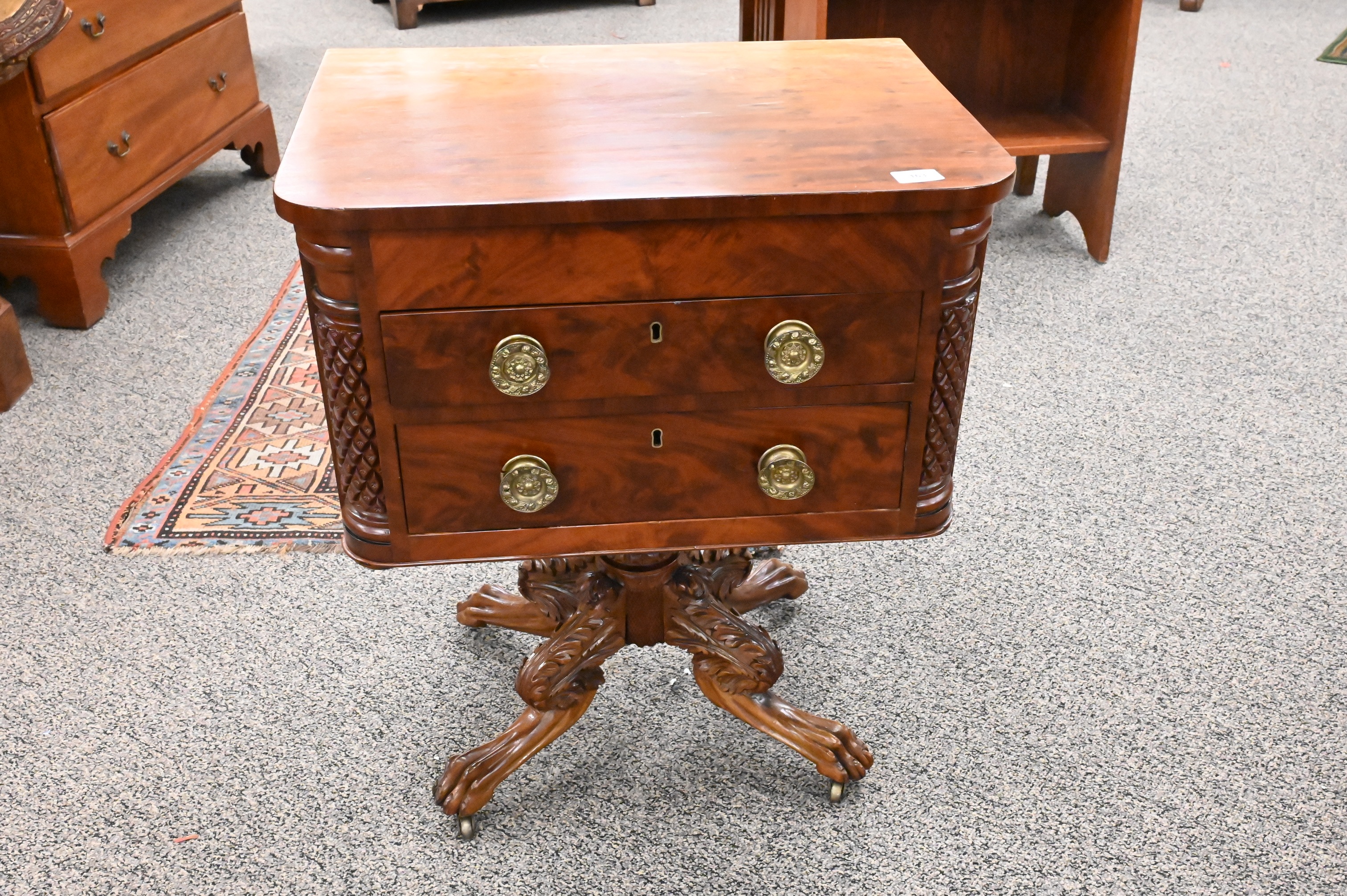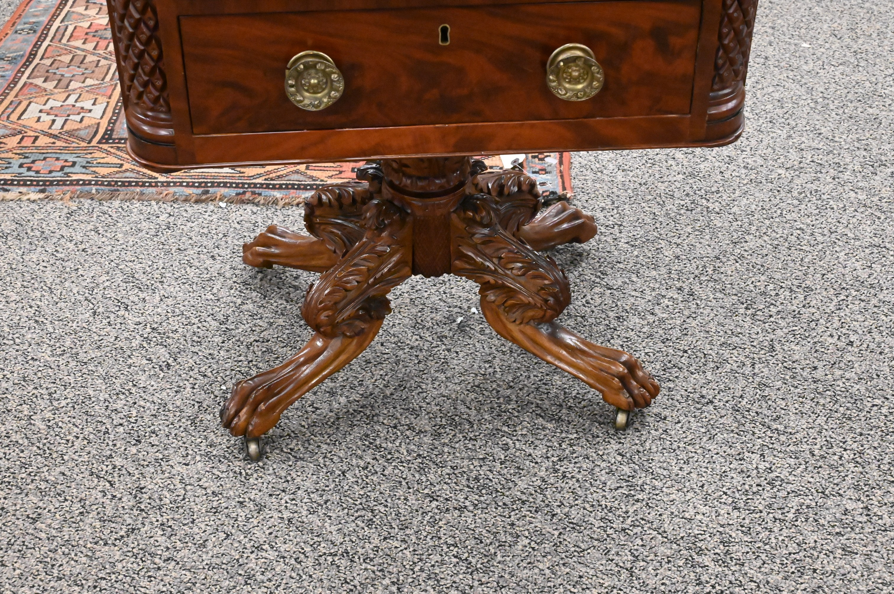 having two drawers flanked by pineapple carved columns having side drawer all set on carved pedestal and paw feet , circa 1840
