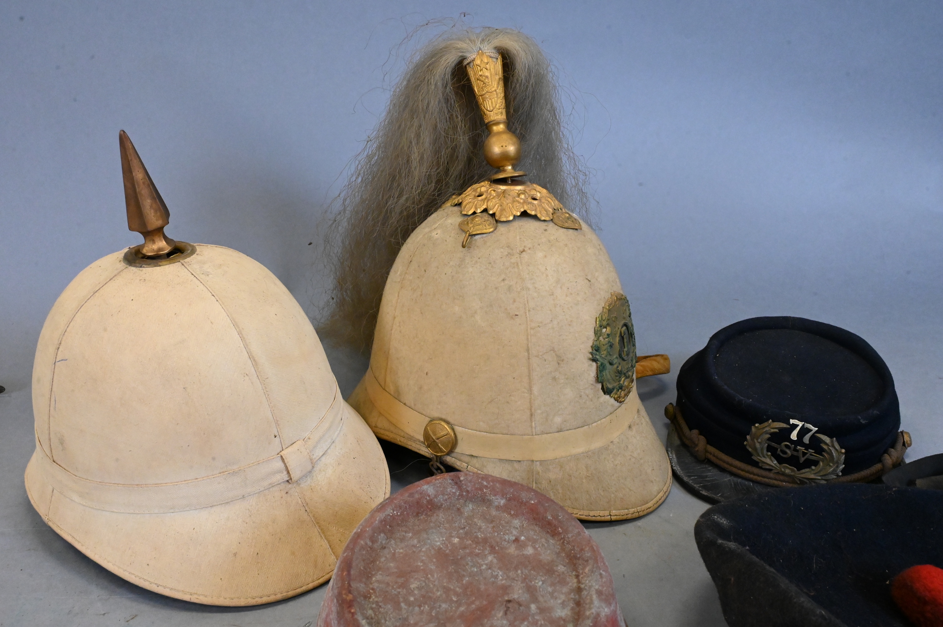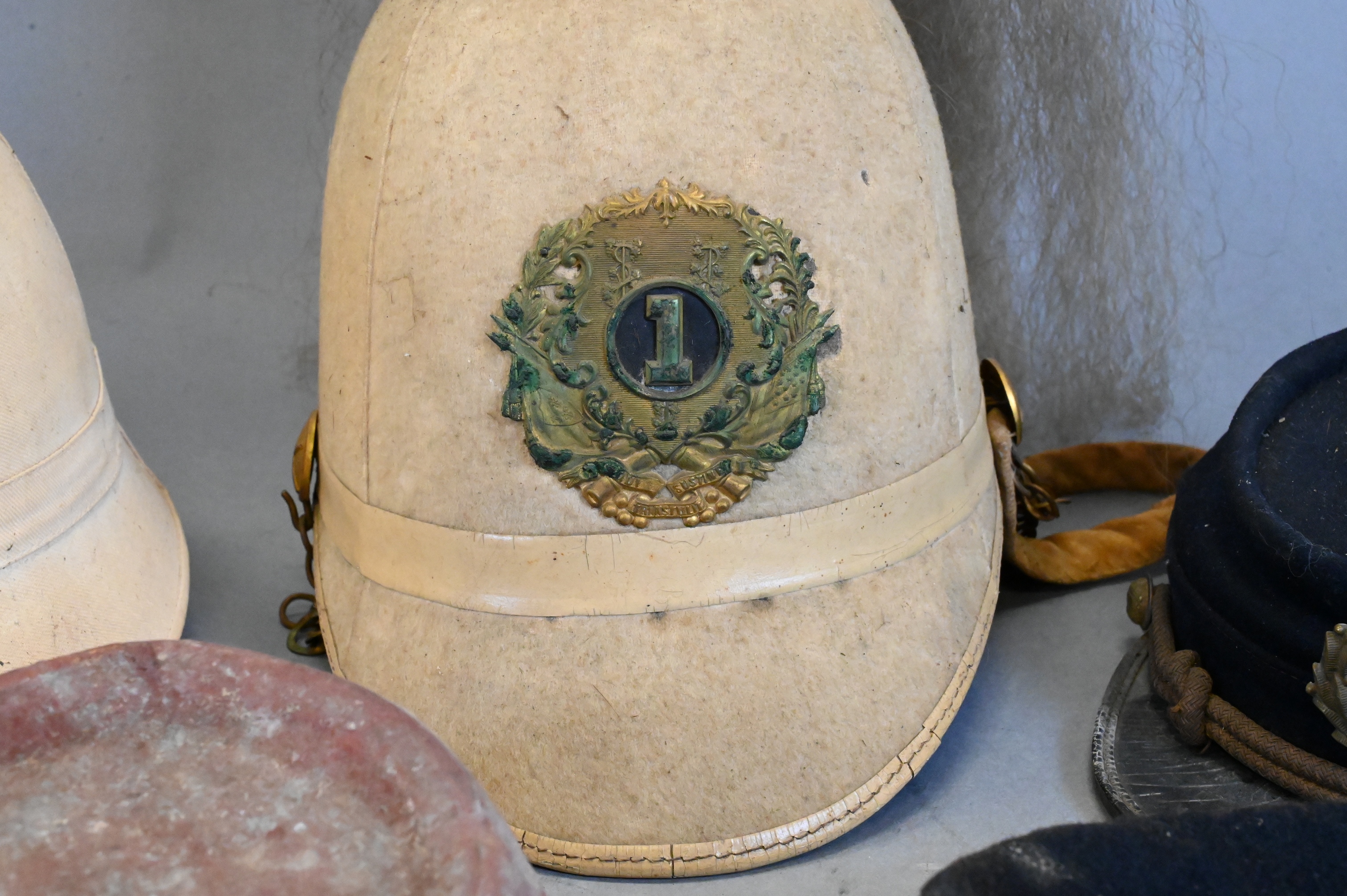Including a white parade helmet with gilt mount and horsehair plume, a white sun helmet with spike finial, a Kepi with insignia “77,” a dark wool shako-style cap with red pompom, and an additional red cap