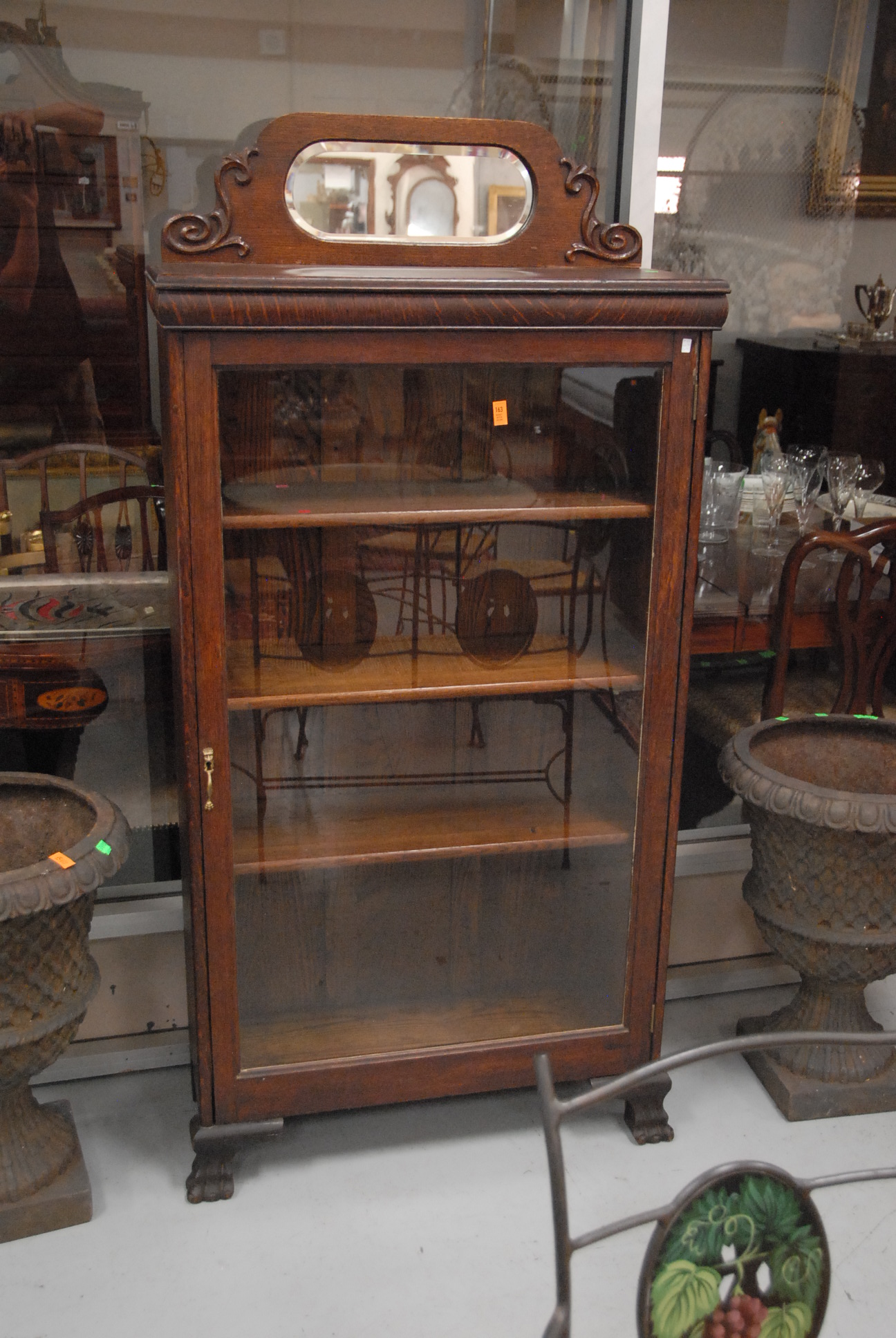 Oak Victorian bookcase with glass door and claw feetht. 63in. wd. 36in. dp. 12 1/2in.