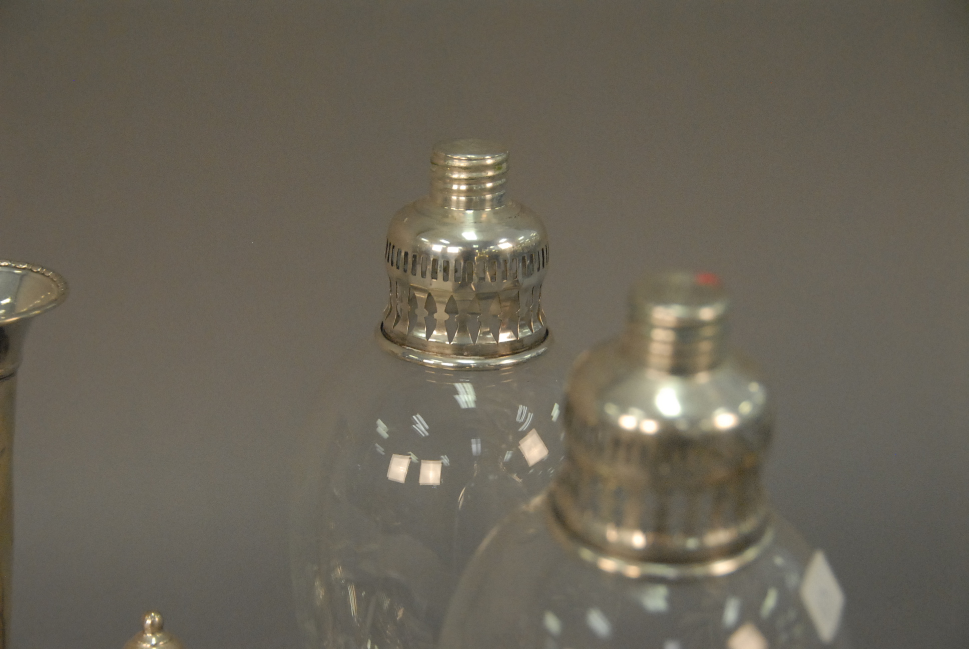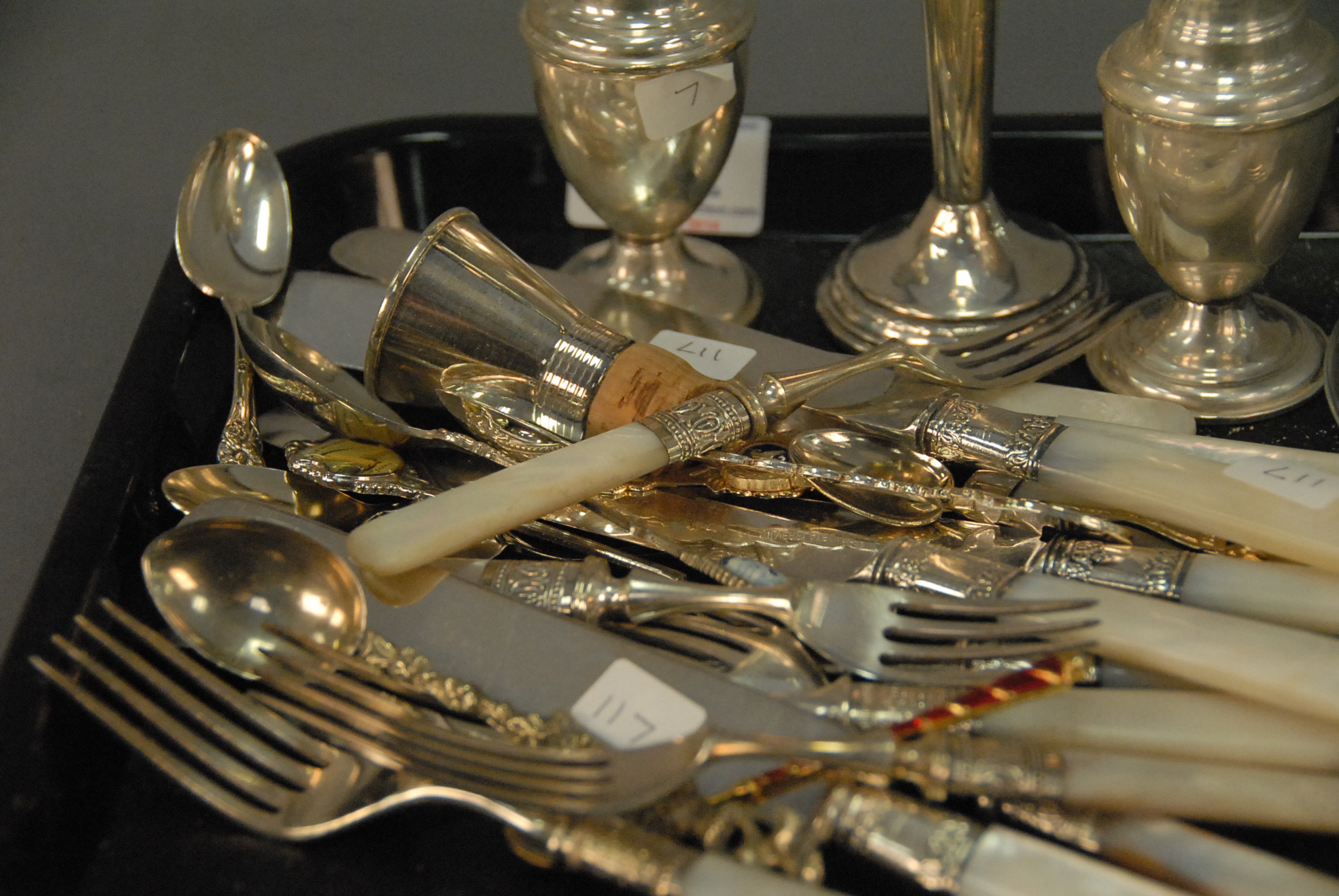 Lot 163: One tray lot of silver including mother of pearl handled flatware, sterling vase, pepper shaker, etc.
