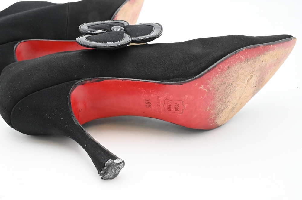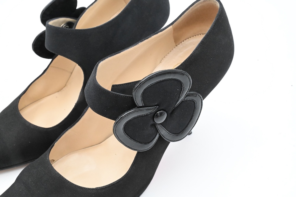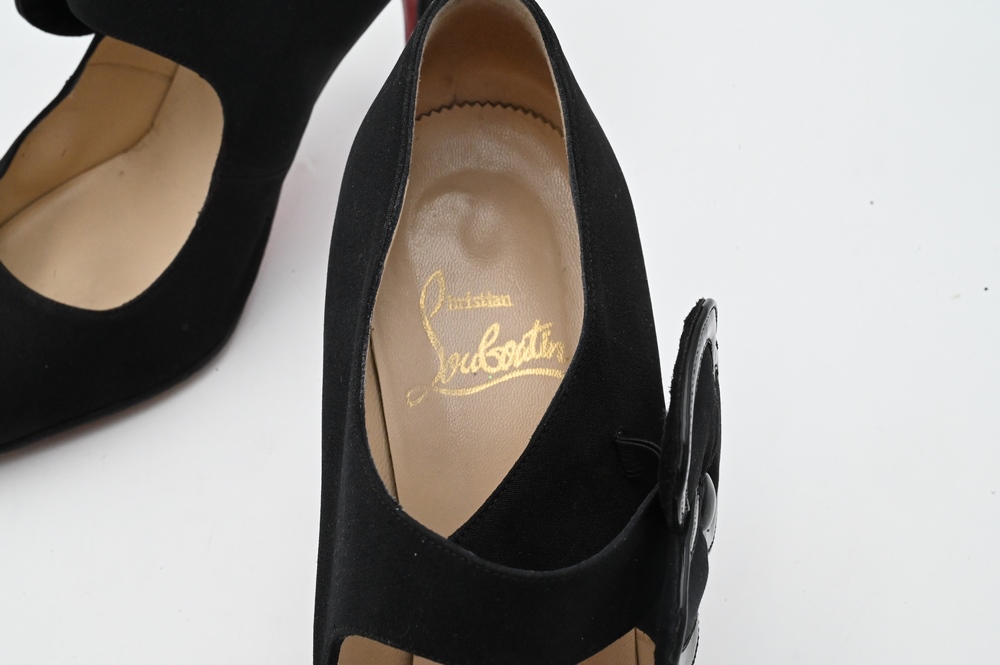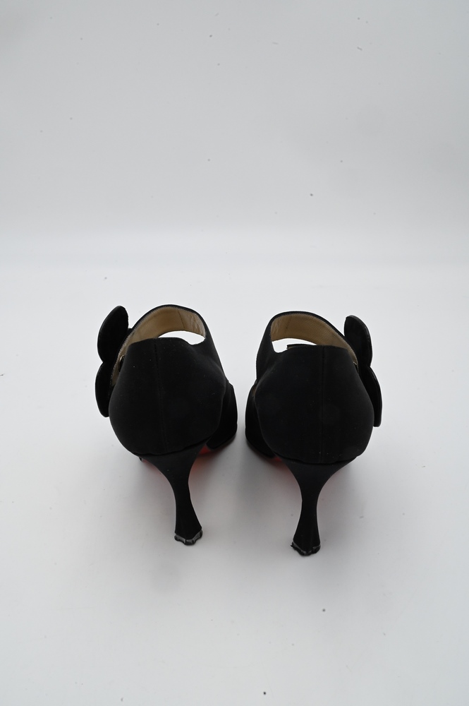 Pair of Christian Louboutin Shoes/Pumps, black with flower snap, having red bottoms.