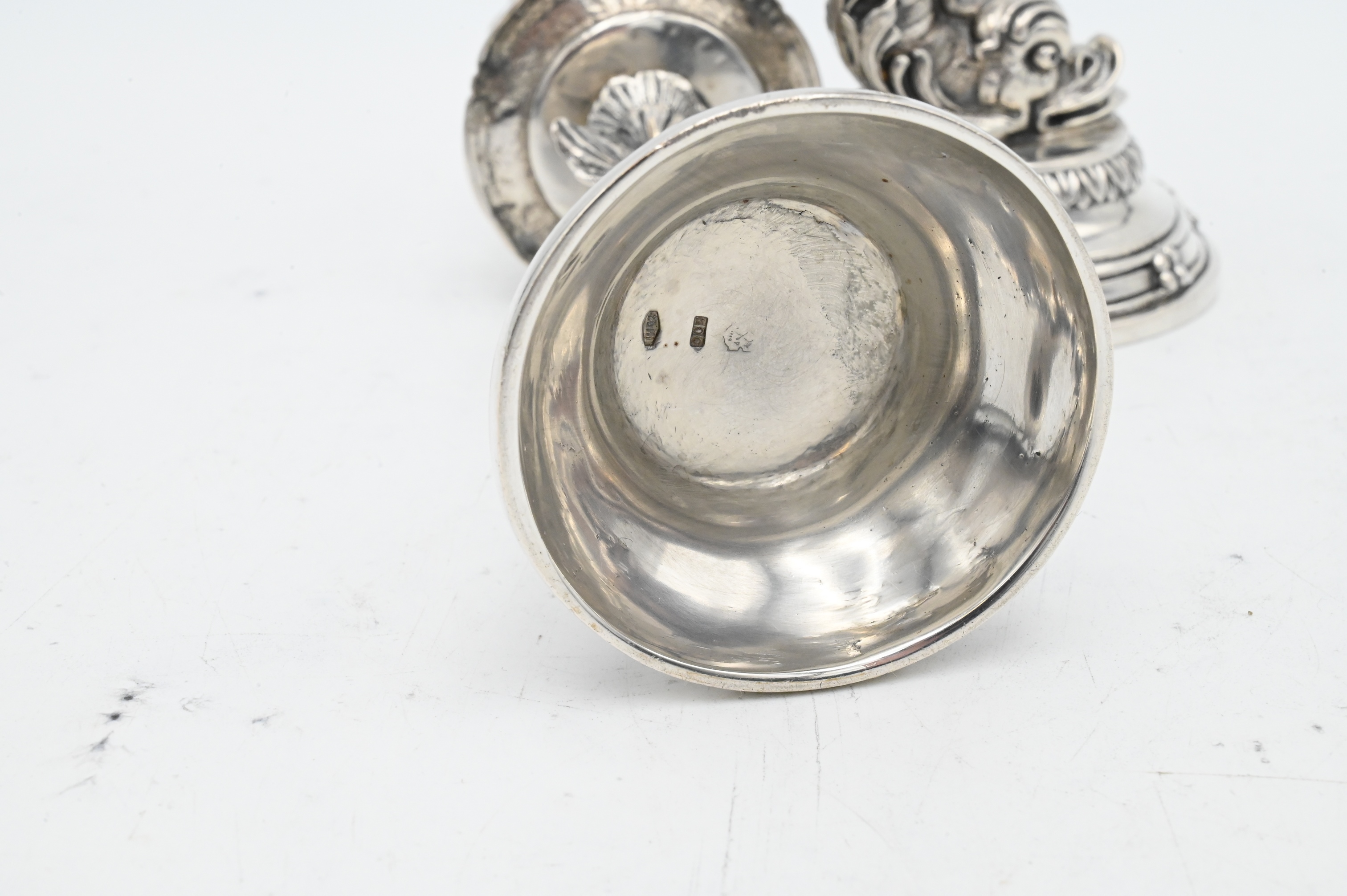 each cast and chased, with foliate candle cups, the bobeche and domed base each with shells at intervals, marked for Milan