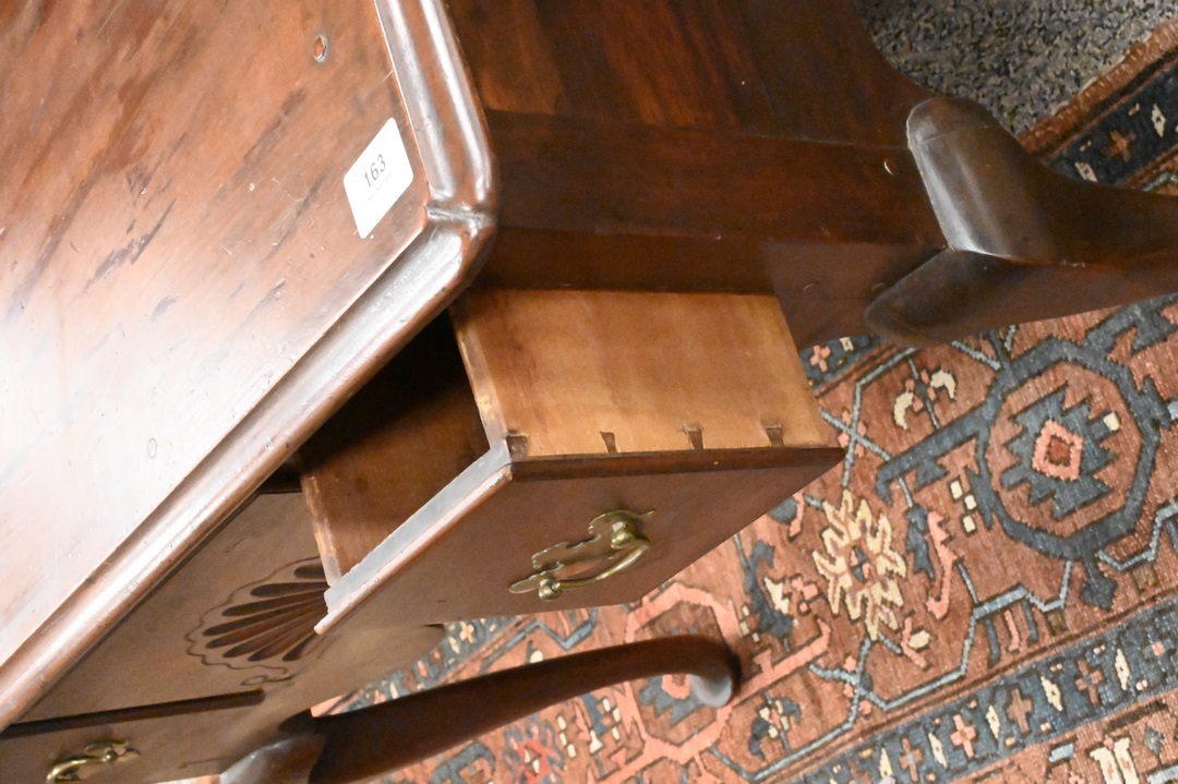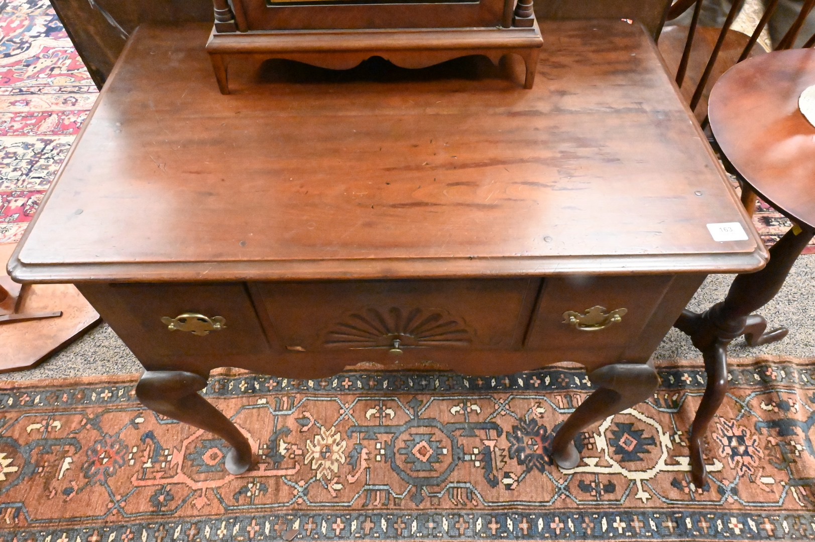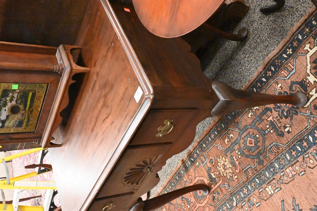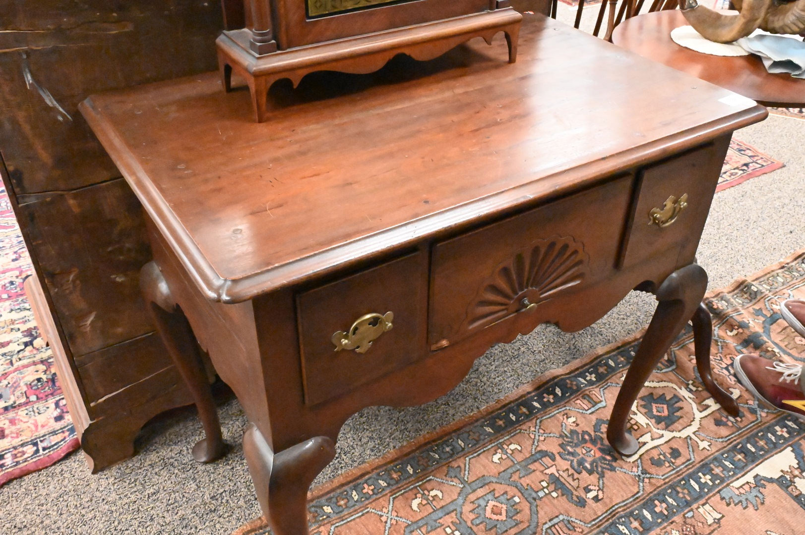 Queen Anne Lowboy, having shaped top over three drawers, shell carved center drawer over scalloped apron, on cabriole legs ending in pad feet, height 30 1/2 inches, width 29 3/4 inches, top 20 1/2″ x 33 1/2″. Providence: Bleak House Auctions, 1965, $1,900.