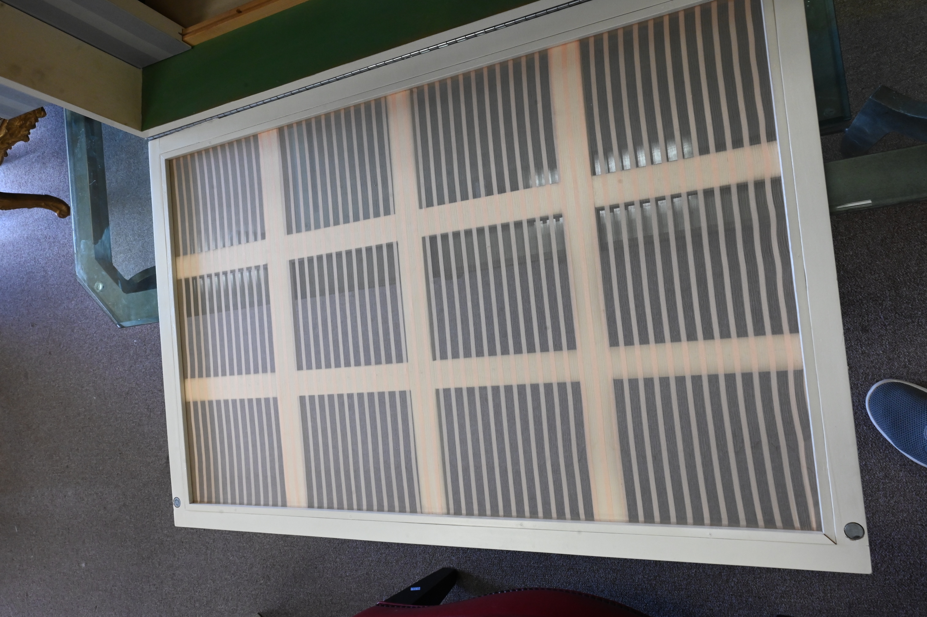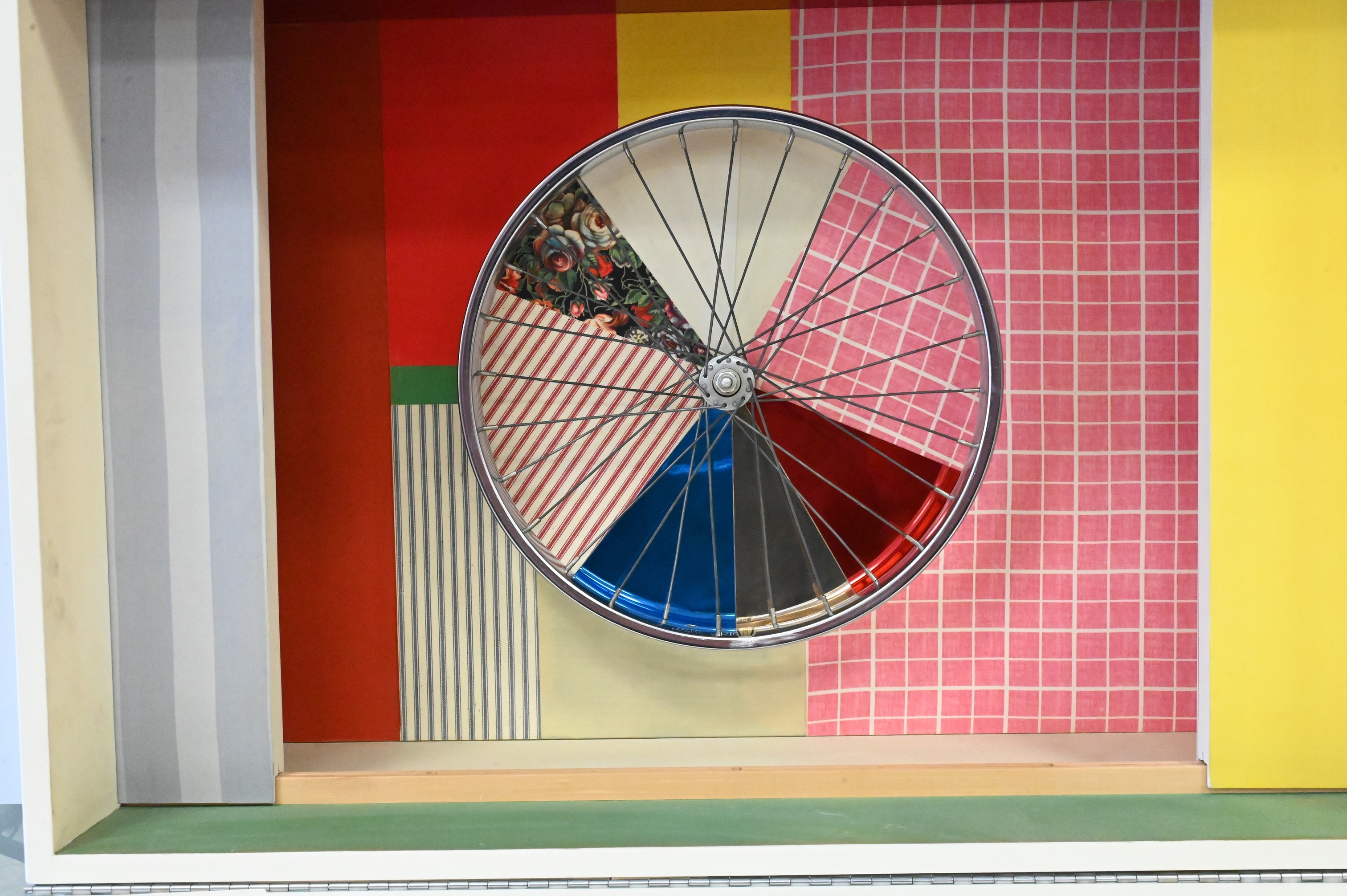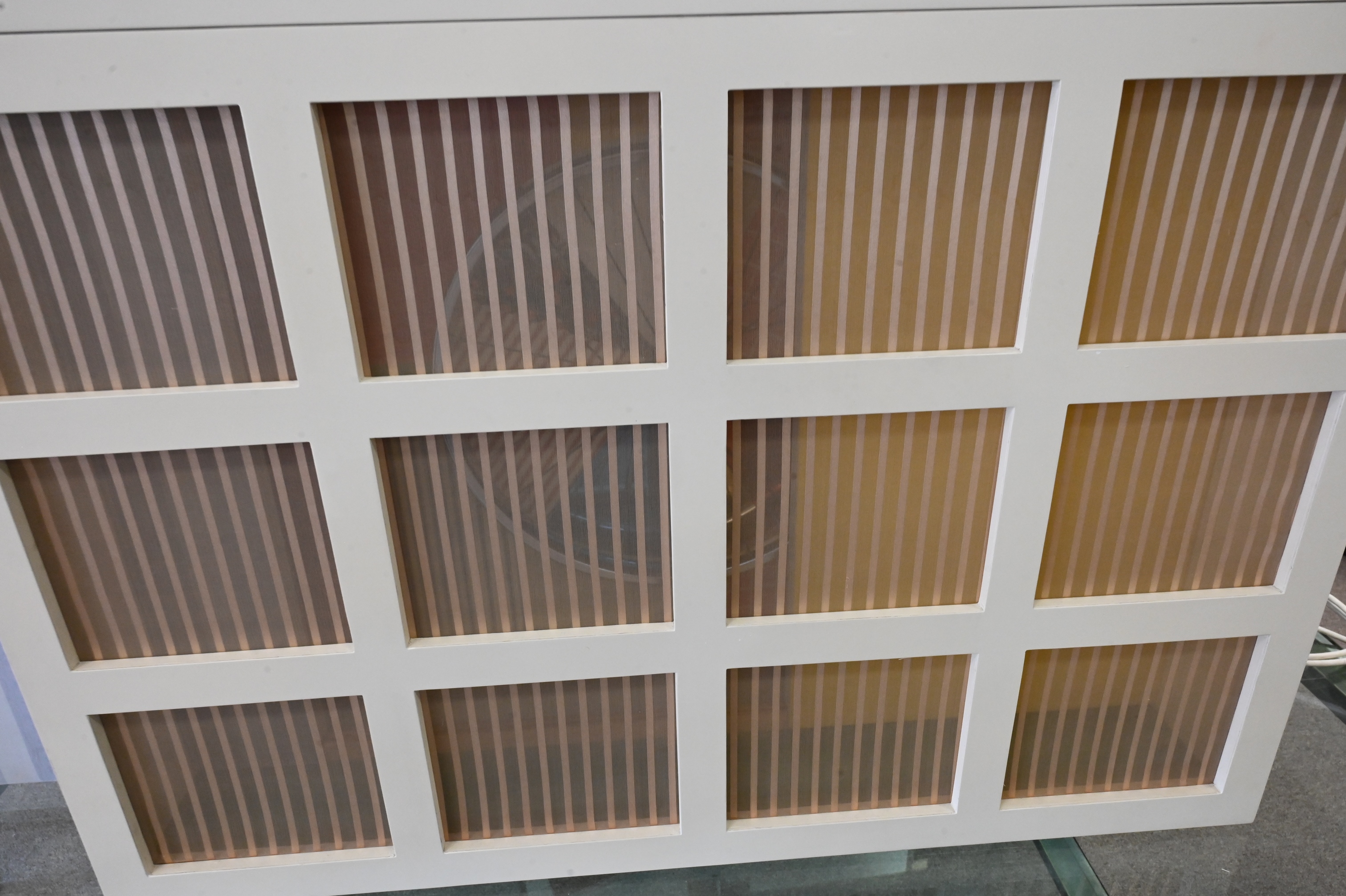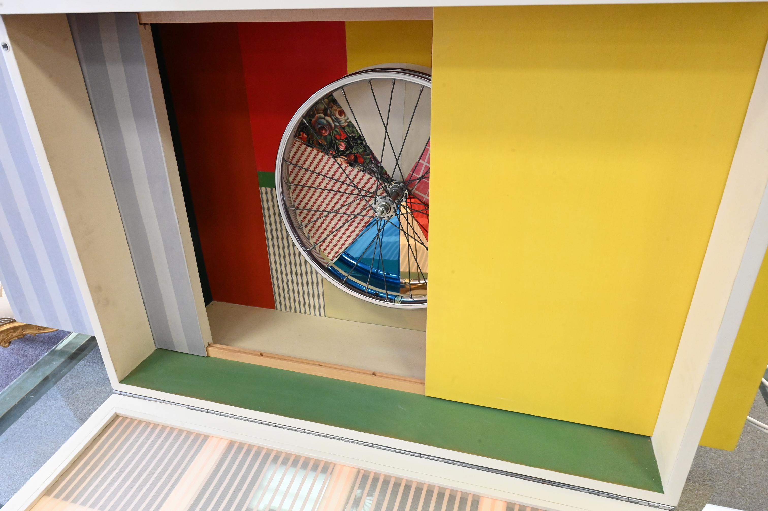 Wood constructed, coated with automotive acrylic lacquer, collaged silk and cotton fabrics, baked epoxy enamel over polished aluminum, plexiglass, and light bulbs