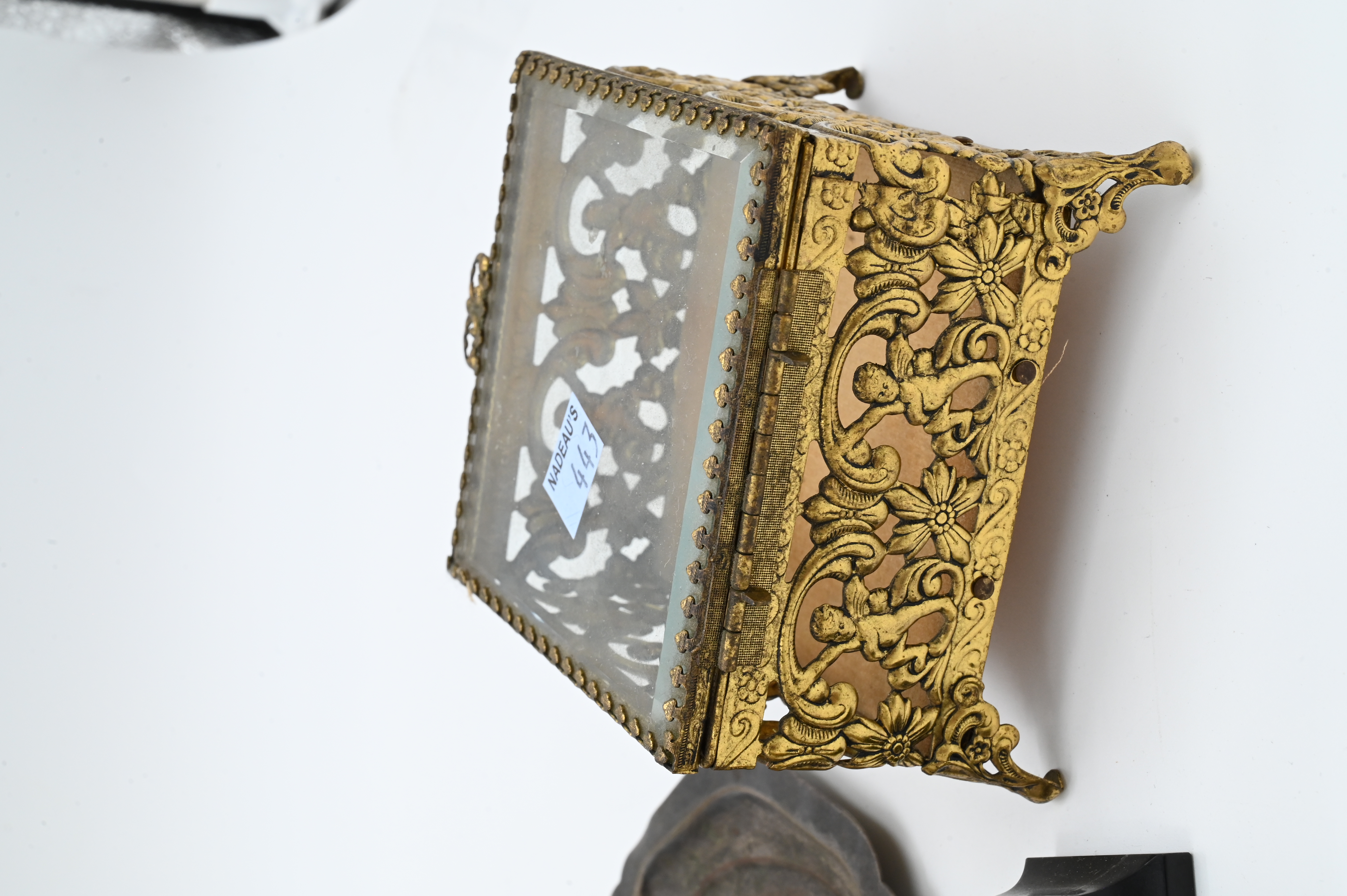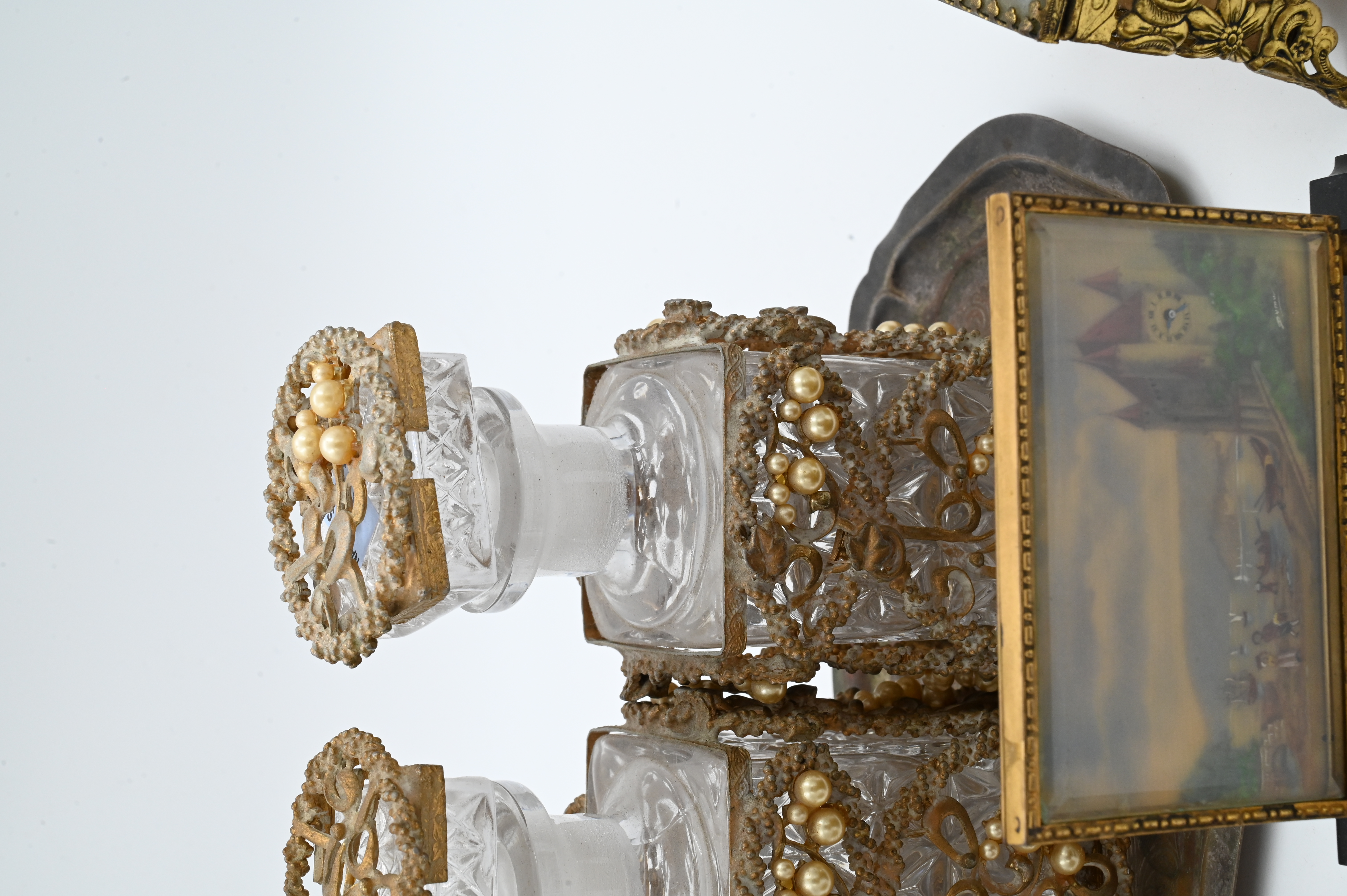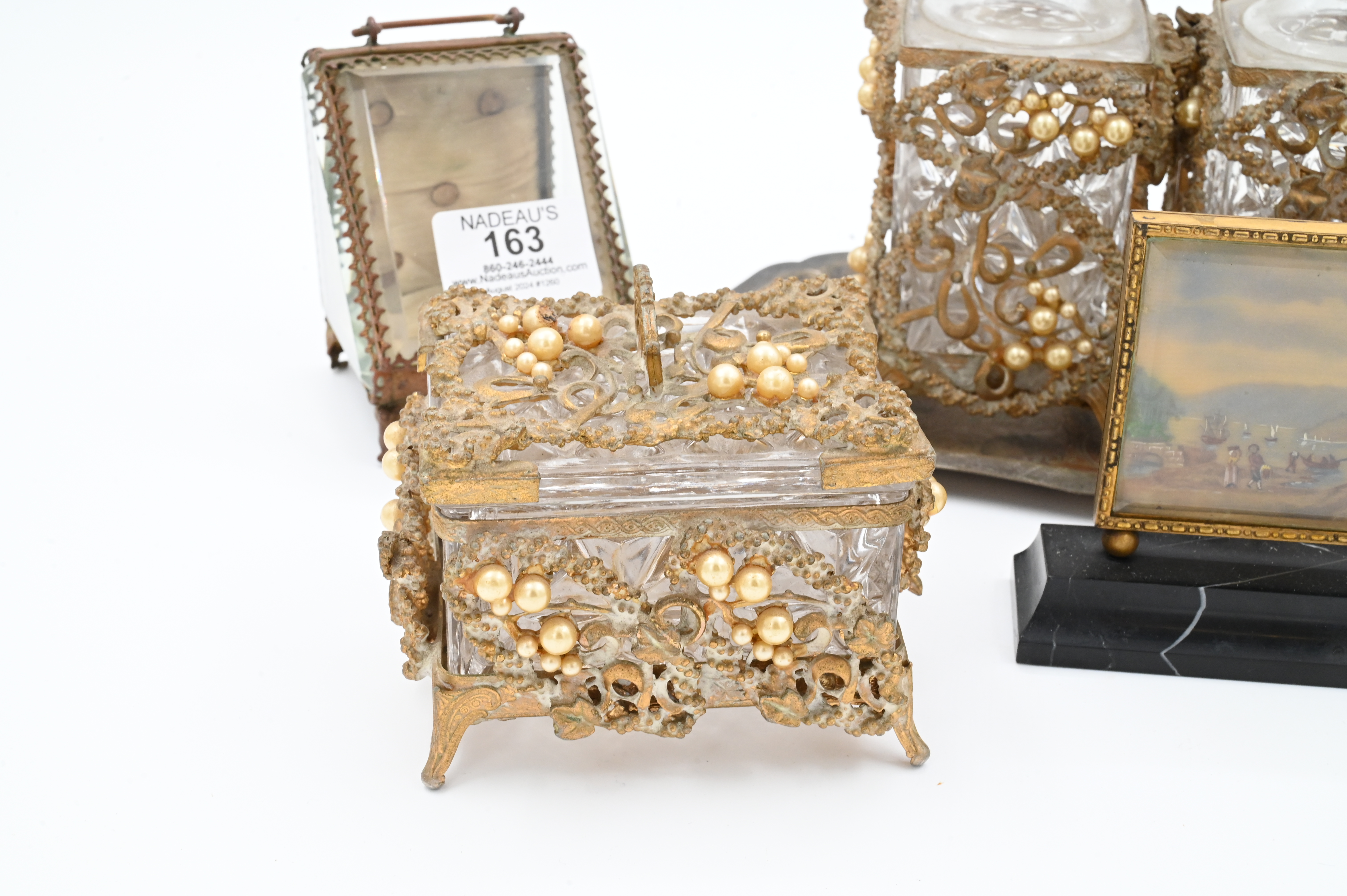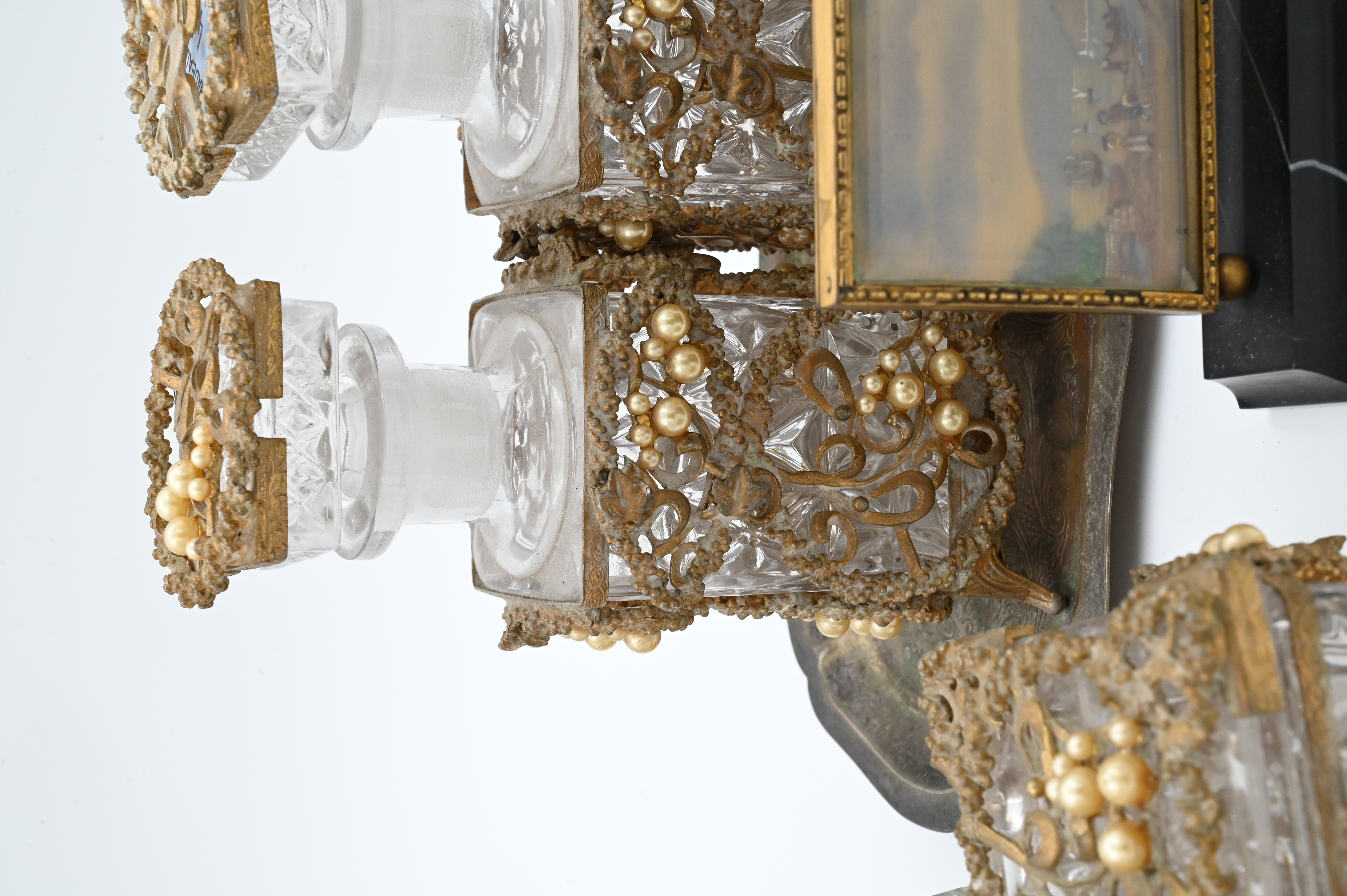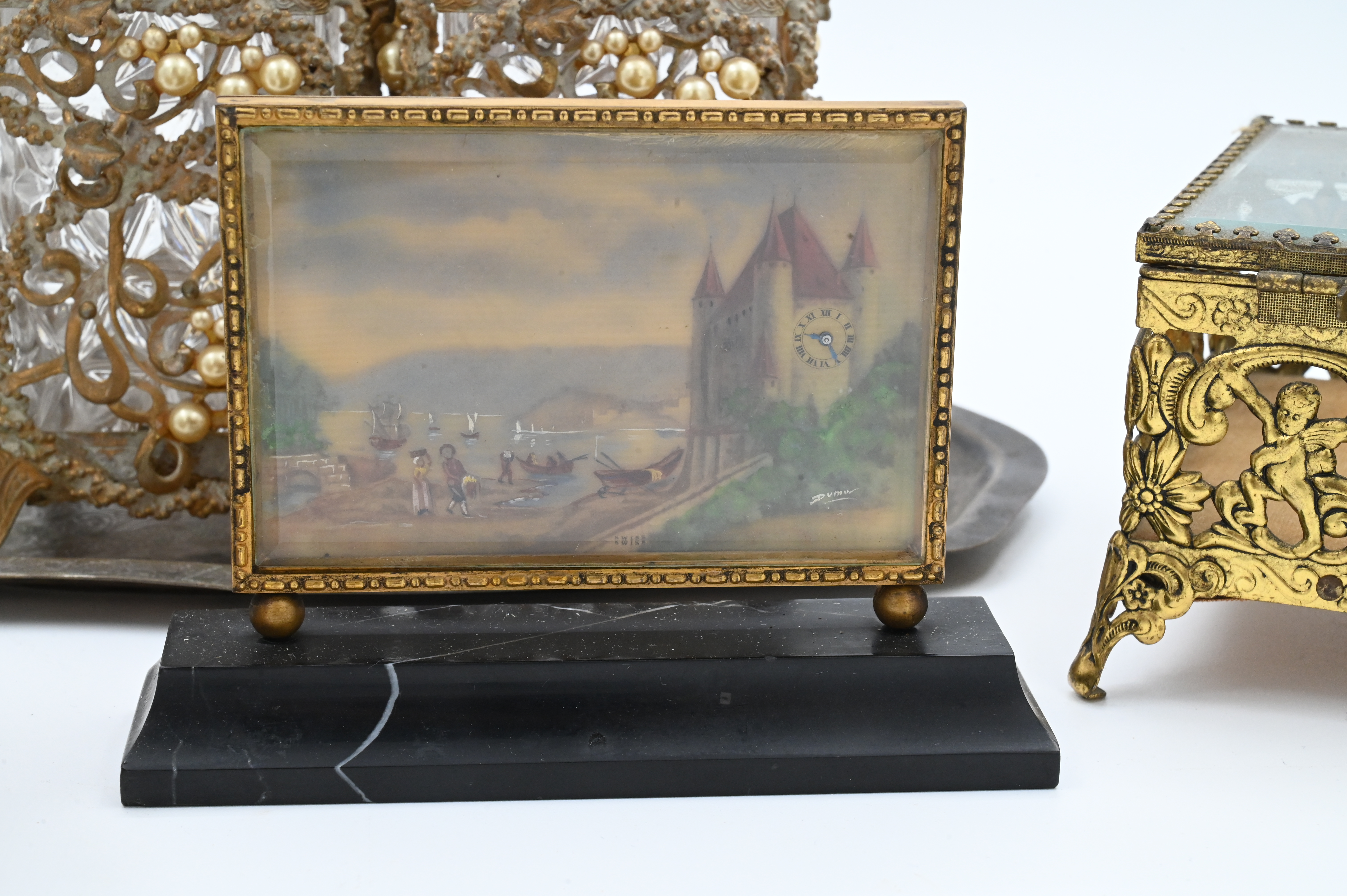 metal and beveled glass pocket watch stand, gilt metal and beveled glass jewelry box, pair of decanters and box having metal and pearl filigree overlay, oval tray, Le Vieux Château miniature desk clock on onyx base