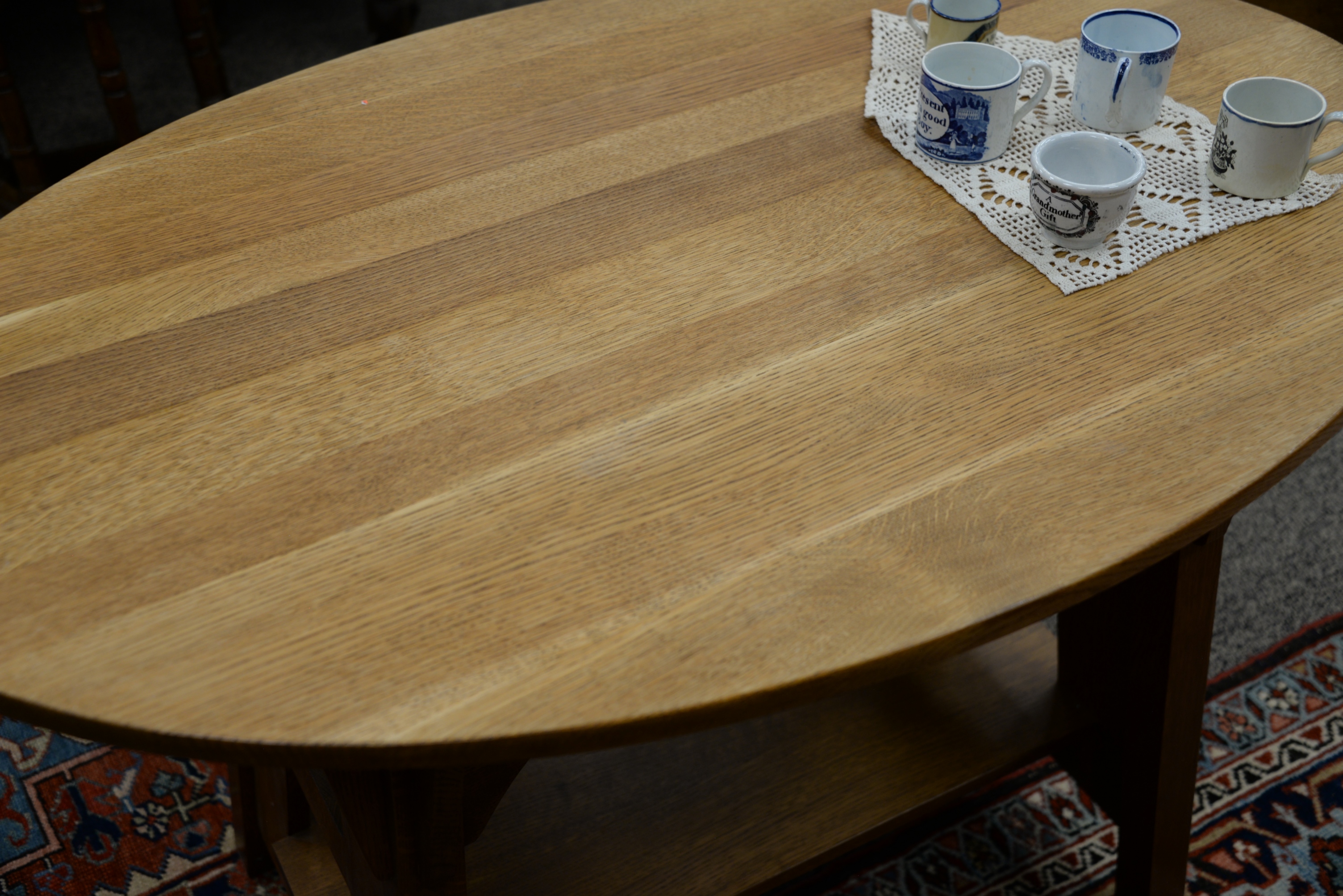 Stickley Limbert Commemorative Oak Library Table, having oval top on trestle base, remedial shelf with brass tag, model 89-146, unfinished top, late 20th century, height 29 inches, top 30″ x 45″