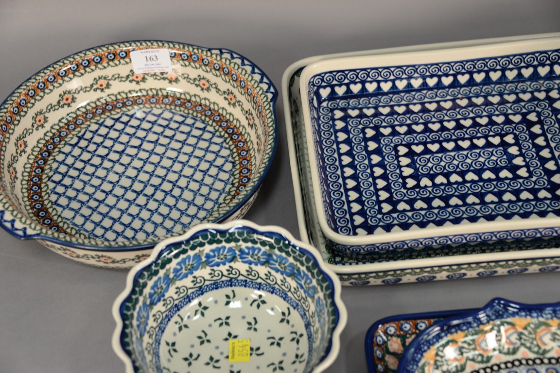 Lot 163: Ten handmade Polish pottery serving pieces including pie plate by Lenkiewicz, round casserole Anna Pasierbiewicz, four ruffle edge b…