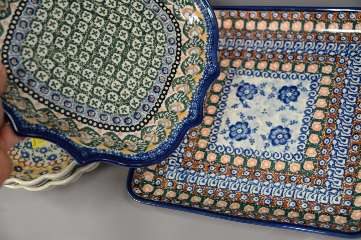 Ten handmade Polish pottery serving pieces including pie plate by Lenkiewicz, round casserole Anna Pasierbiewicz, four ruffle edge bowls, serpentine tray signed and numbered, square tray signed and numbered and two rectangle casserole dishes, all hand painted and marked Handmade in Poland, most marked Unikat. smallest bowl: ht. 3in., dia. 6 3/4in., largest tray: lg. 12 1/2in.