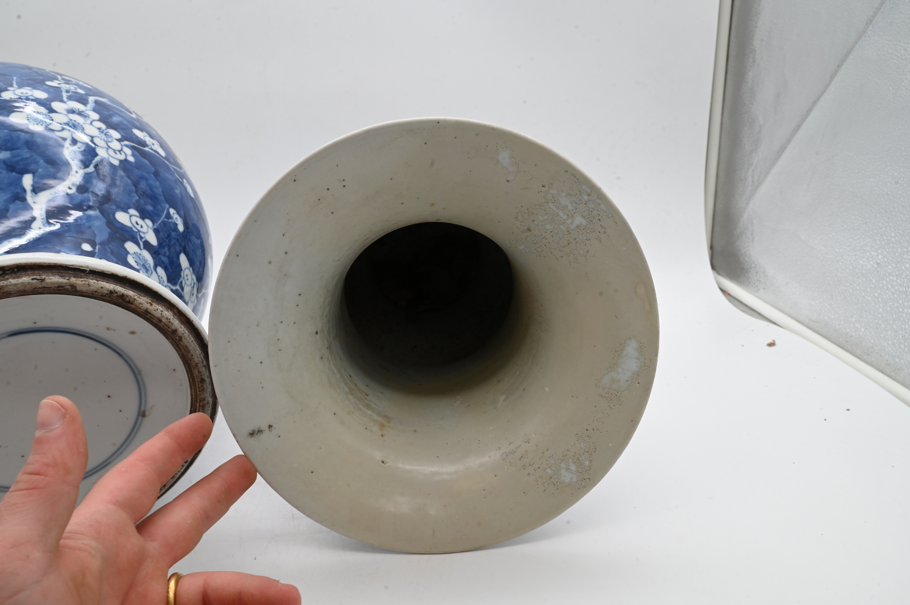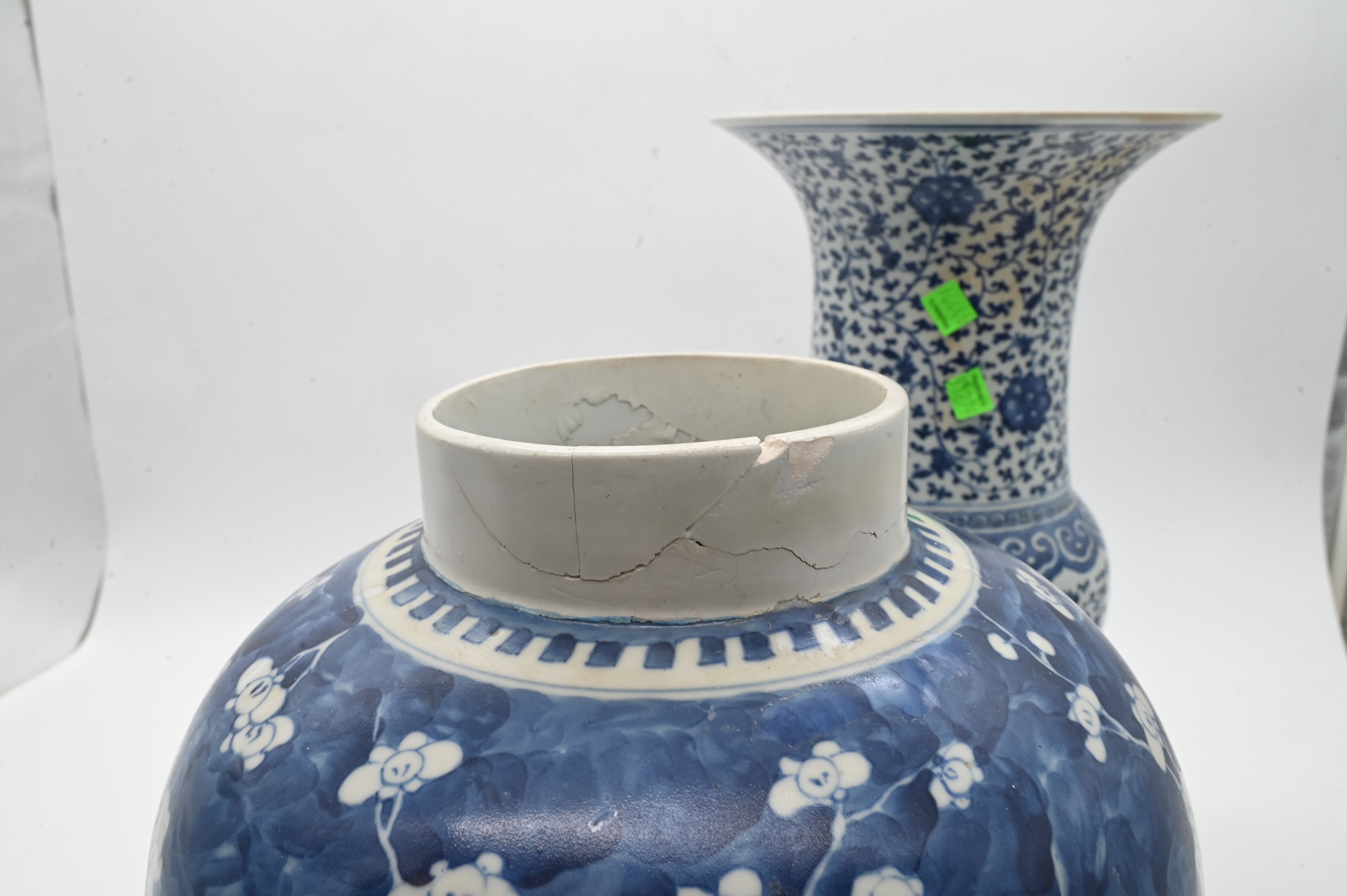 scrolling vine motif Yen Yen vase with extensive repairs, the other in dark blue ground featuring prunus blossoms, 19th century