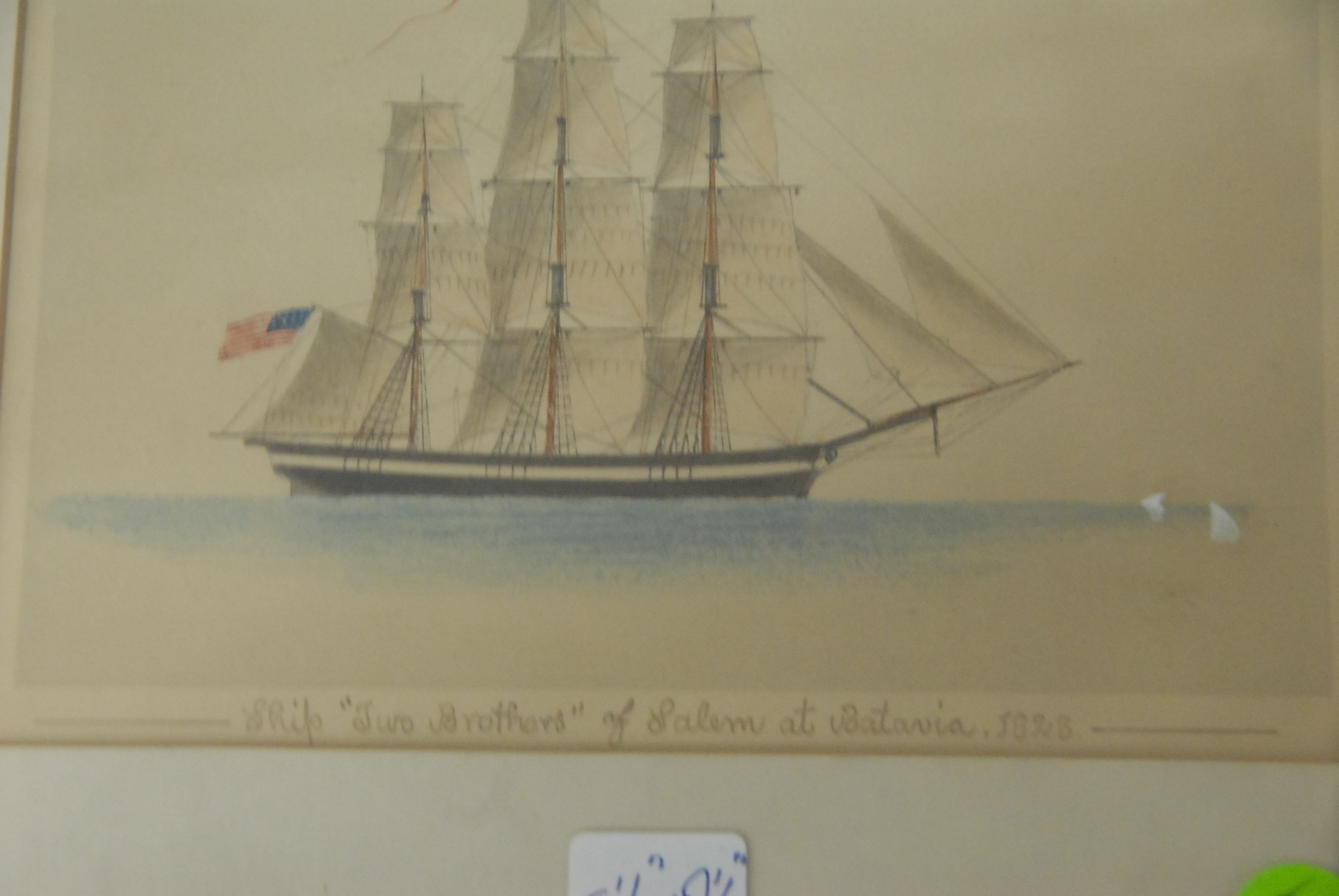 Watercolor of an American ship named Two Brothers of Salem at Batavia. 1823. note on back says John Upton