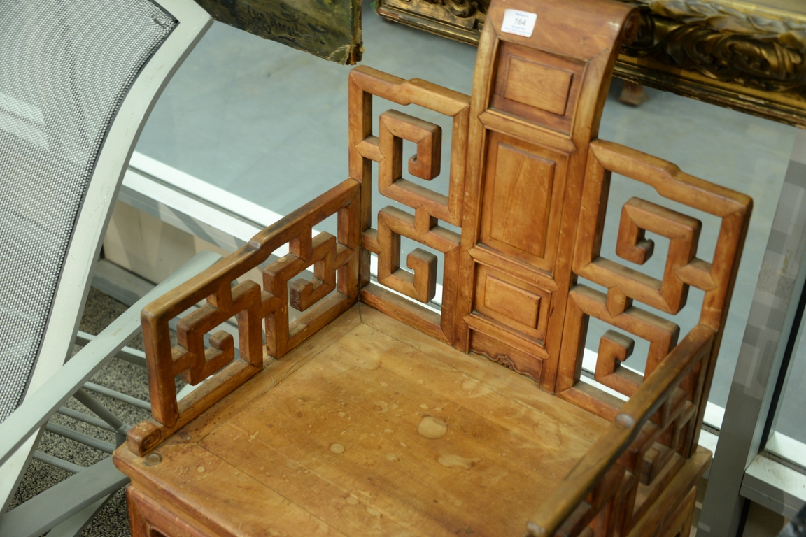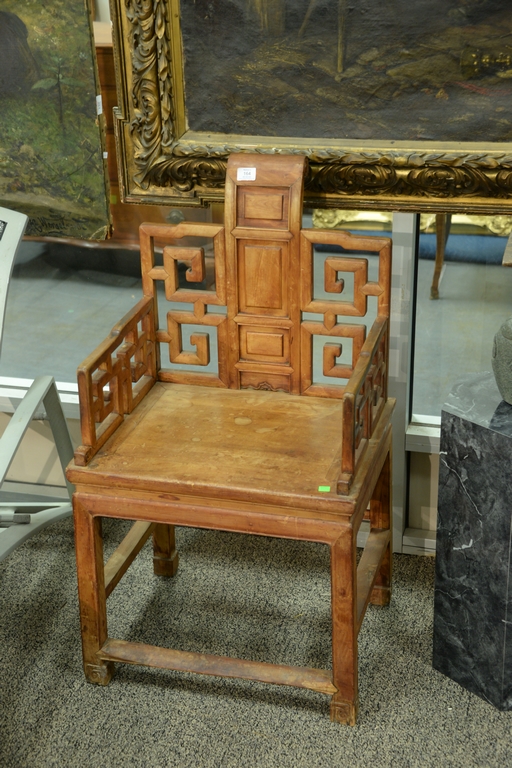 Lot 164: Chinese softwood armchair with scrolled back above pierced and paneled backrest and sides, and paneled seat on molded square legs jo…