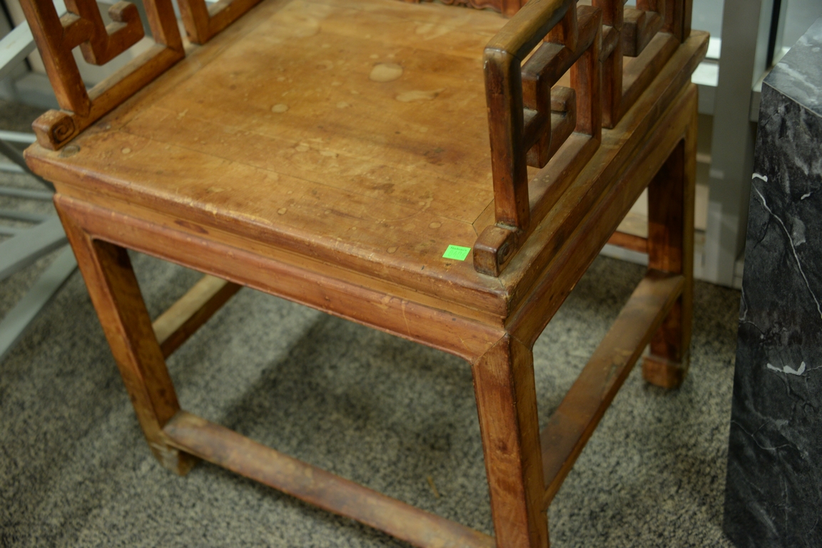 Chinese softwood armchair with scrolled back above pierced and paneled backrest and sides, and paneled seat on molded square legs joined by stretchers. Provenance: Collection of Anne Jones Willis and the late John Ralph Willis, New Jersey