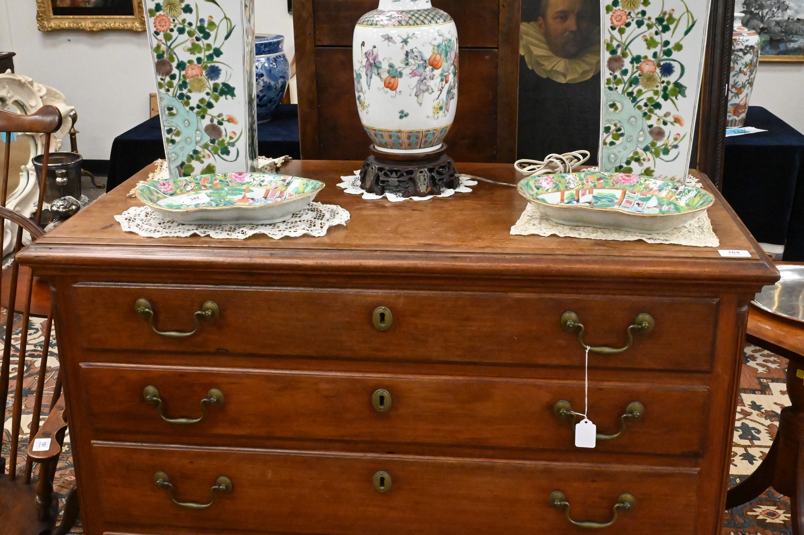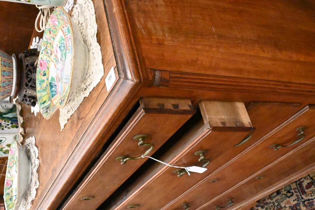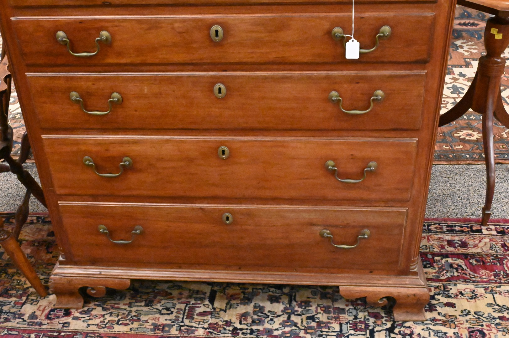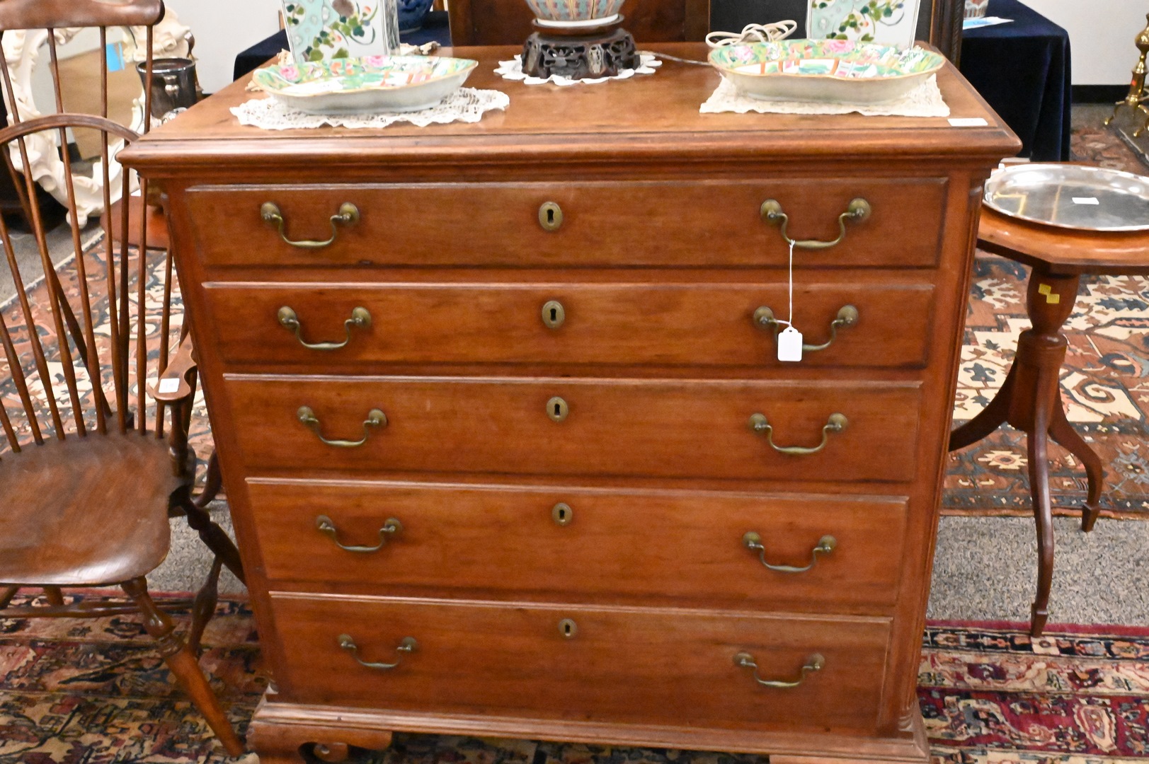 Chippendale Five Drawer Chest, having fluted 1/4 columns, set on ogee feet with scroll carving, 18th century, underside glue blocks and supports pinned to chest, height 41 1/2 inches, width 39 1/4 inches.